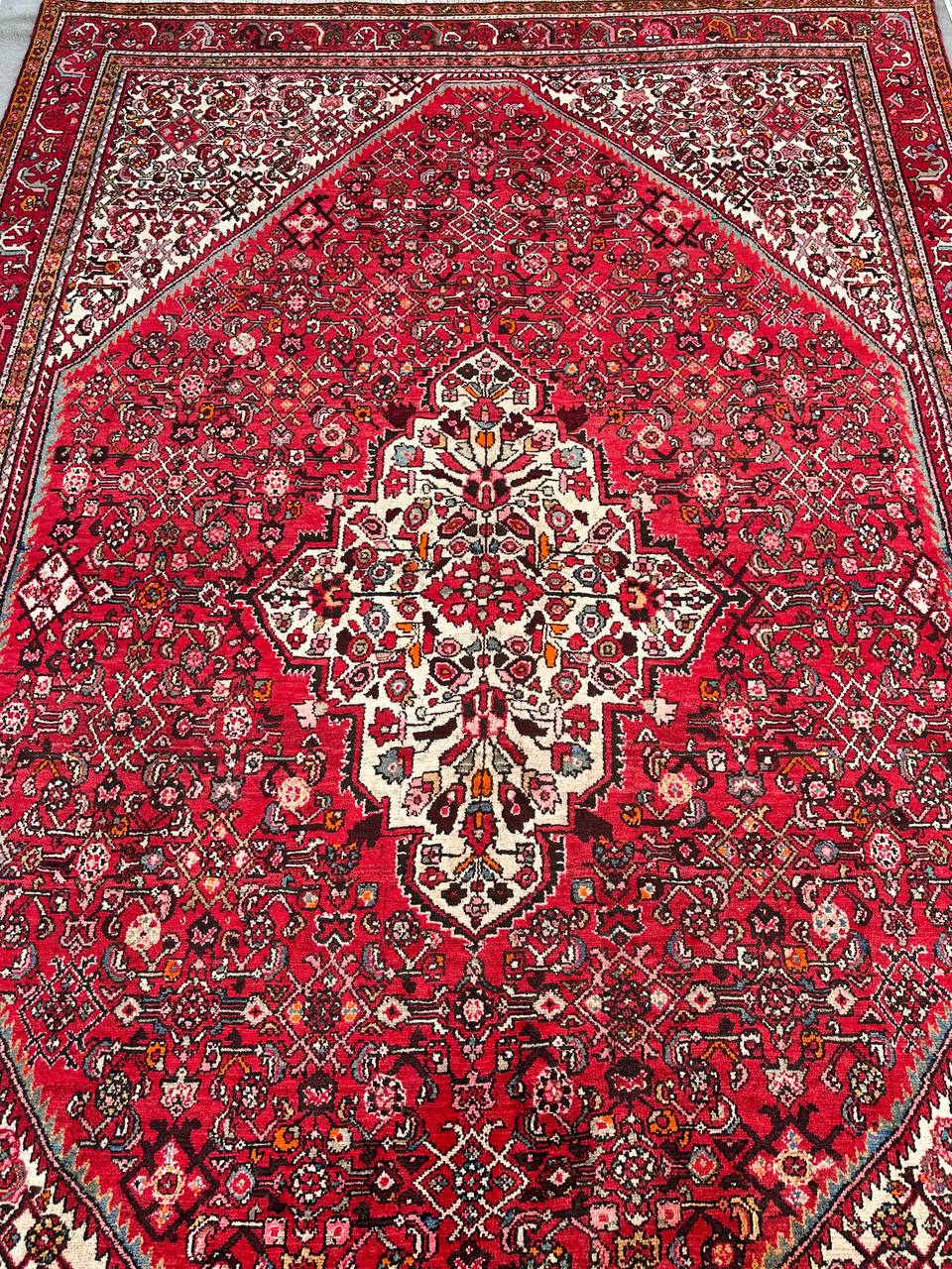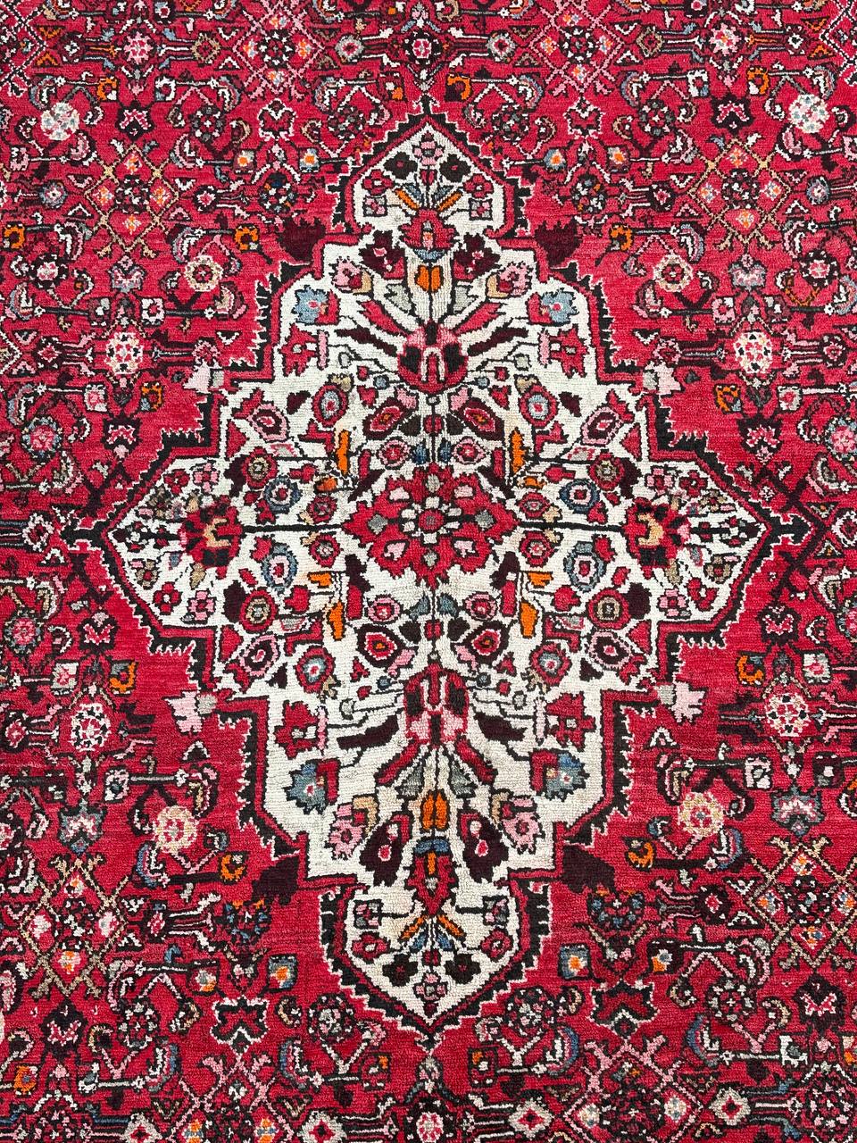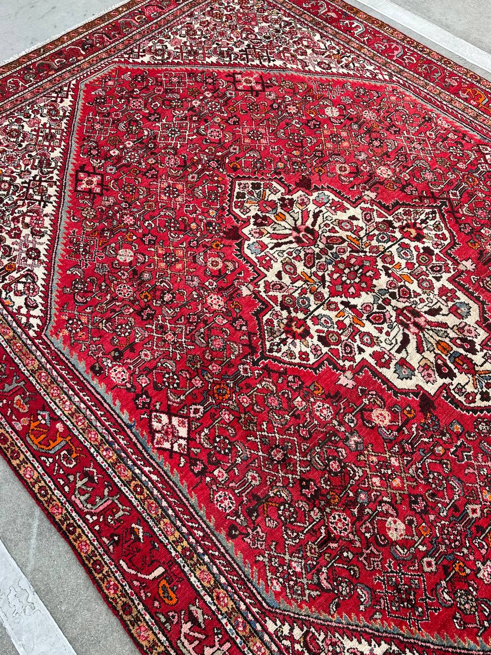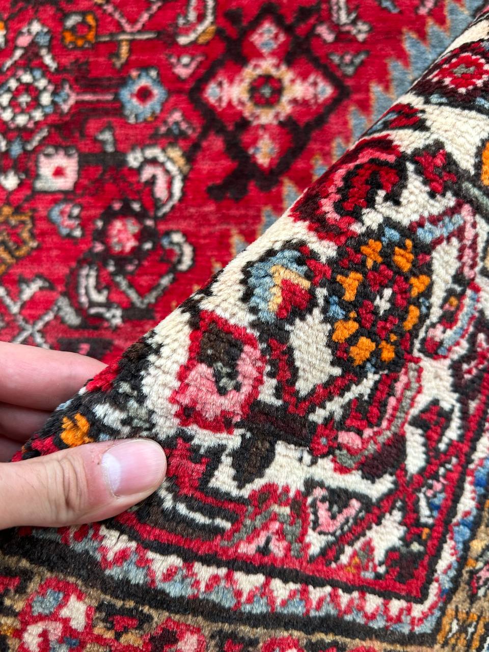 – Tribal Beauty: Immerse your space in the beauty of this certified hand-knotted Hamedan rug. A heavy-quality handmade tribal piece with a pure hand-spun wool pile on a cotton base, featuring rich red tones dyed using traditional methods.