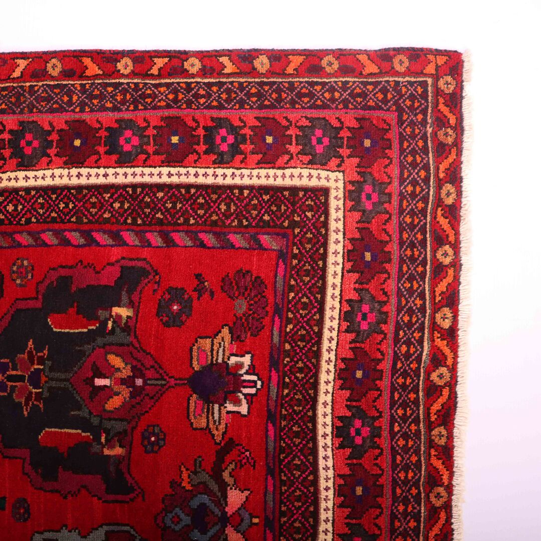 – Material: Crafted with a hand-spun wool pile on a cotton base, it features a heavy pile with rustic red and indigo blue tones, dyed using traditional methods.