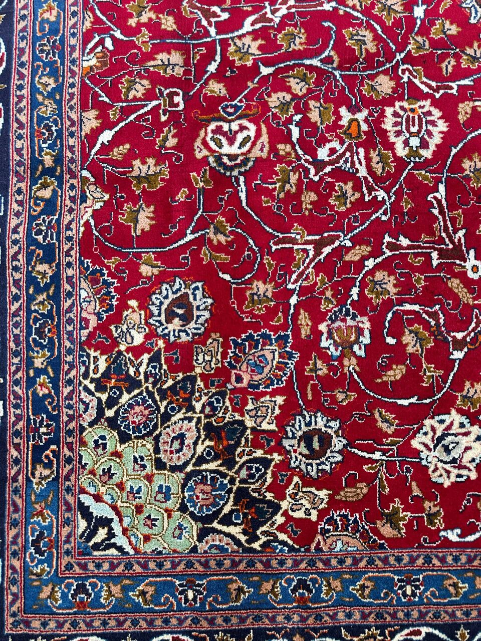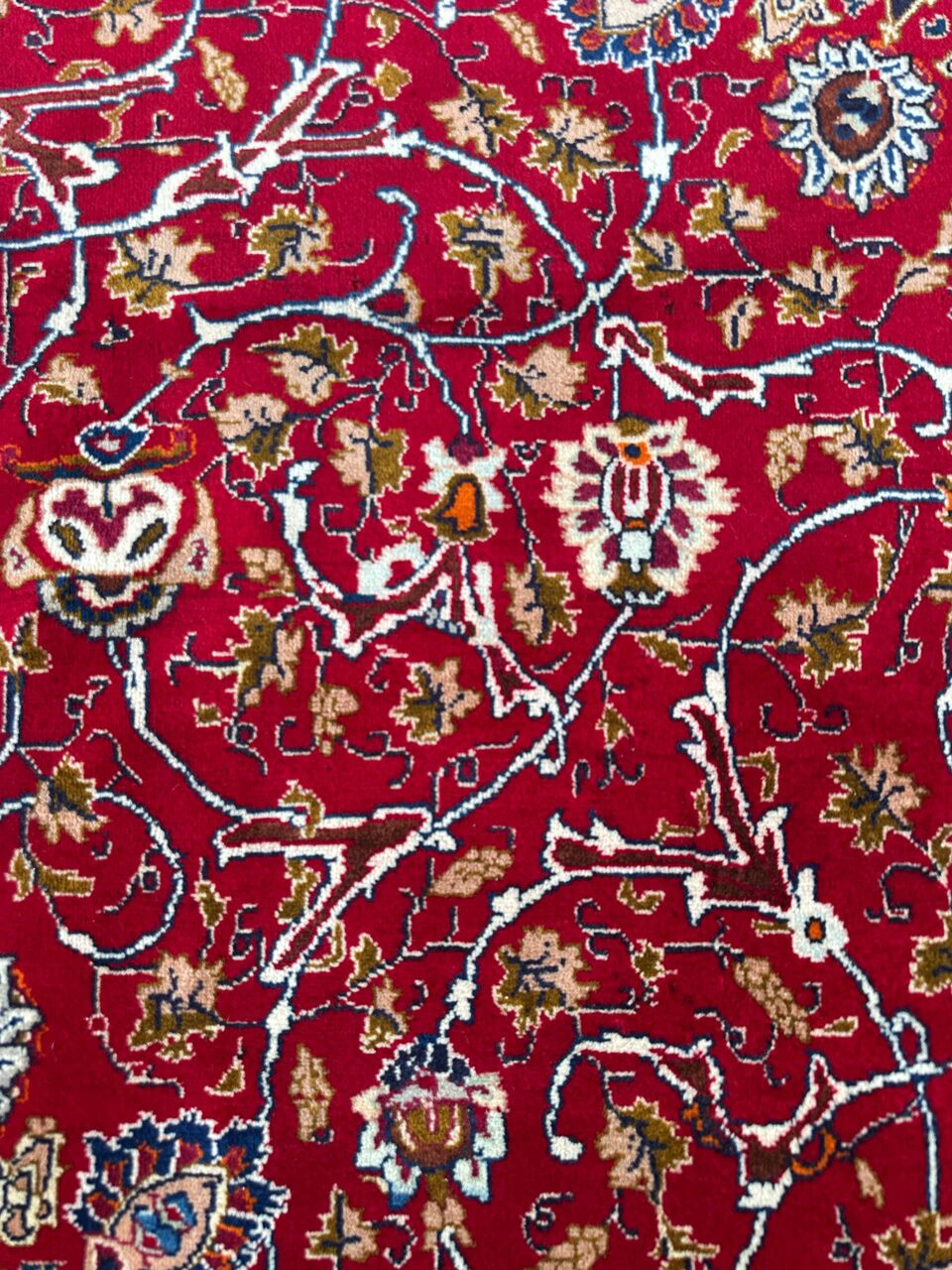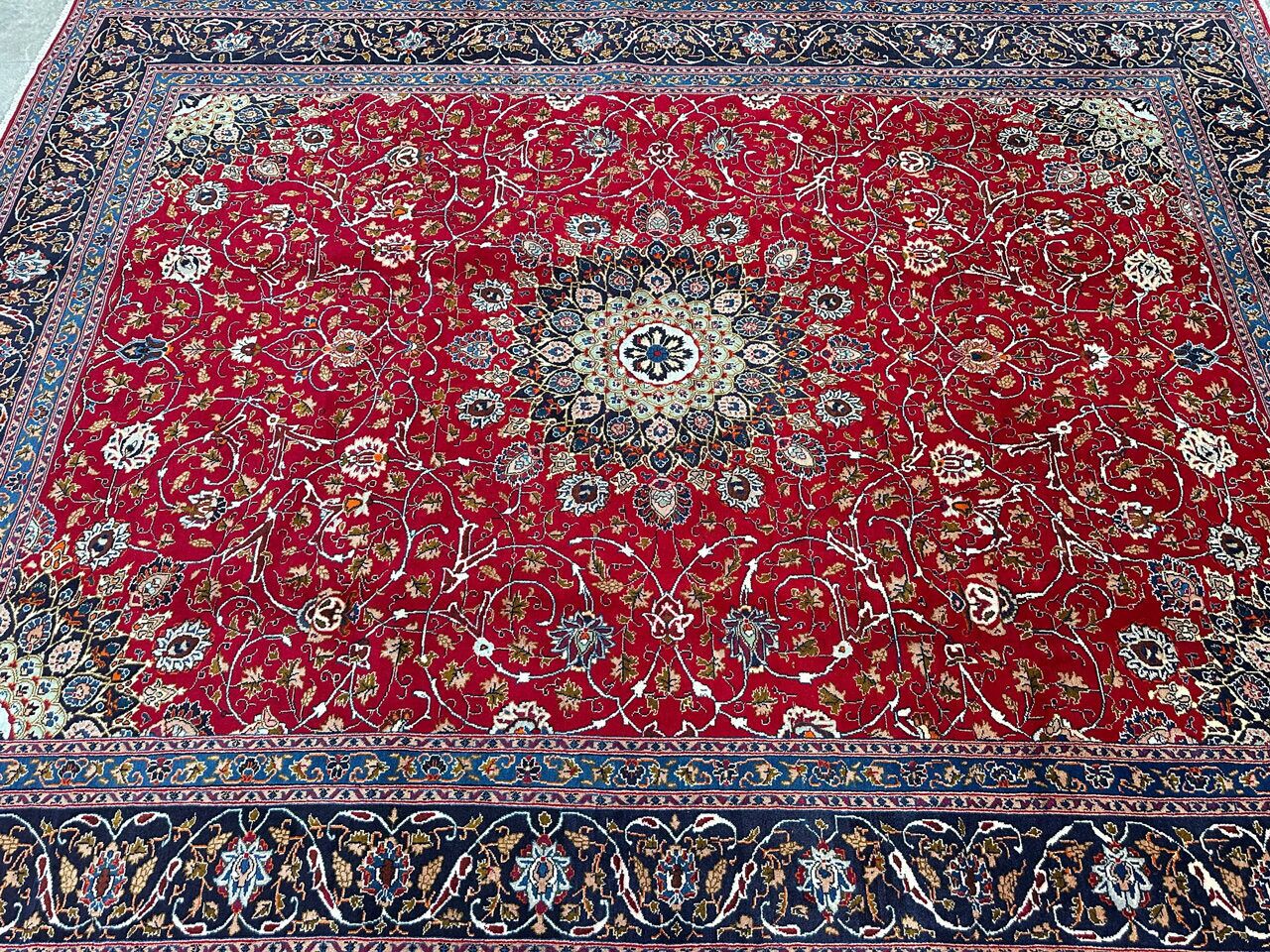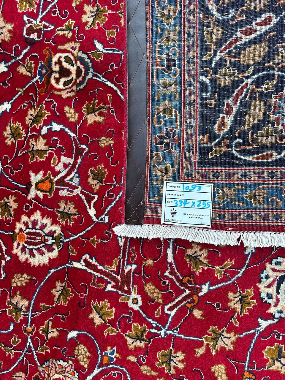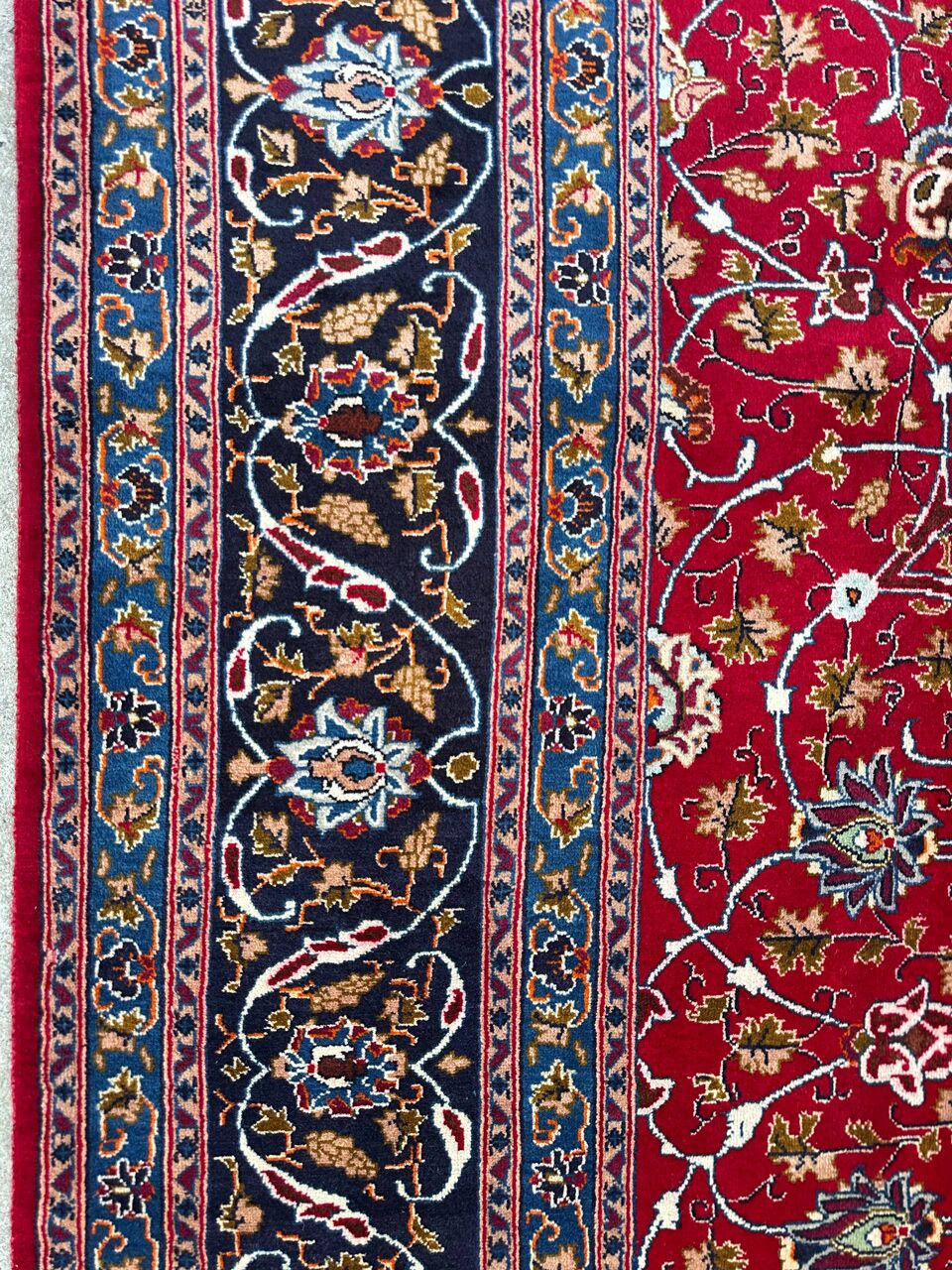 – Massive Room Elegance: Elevate your space with this certified hand-knotted Persian Kashmar carpet, a massive room size authentic handmade piece that’s hard to find in larger sizes. It features a pure lamb’s wool pile on a cotton base, dyed in stunning red and dark blue using traditional methods.