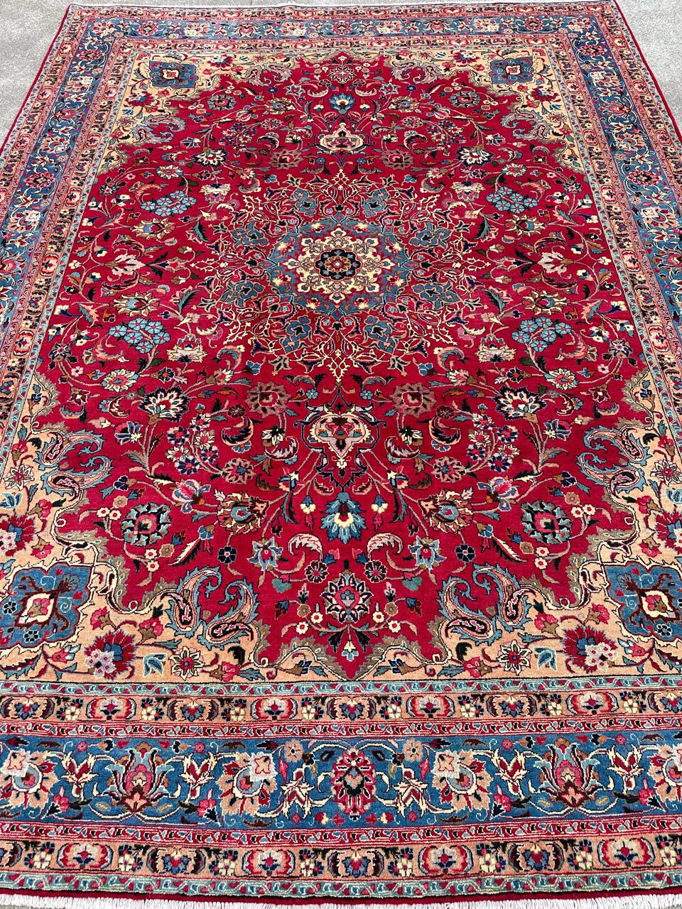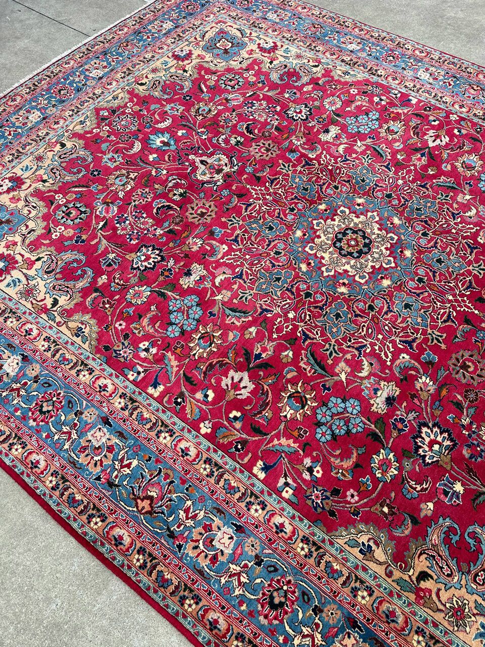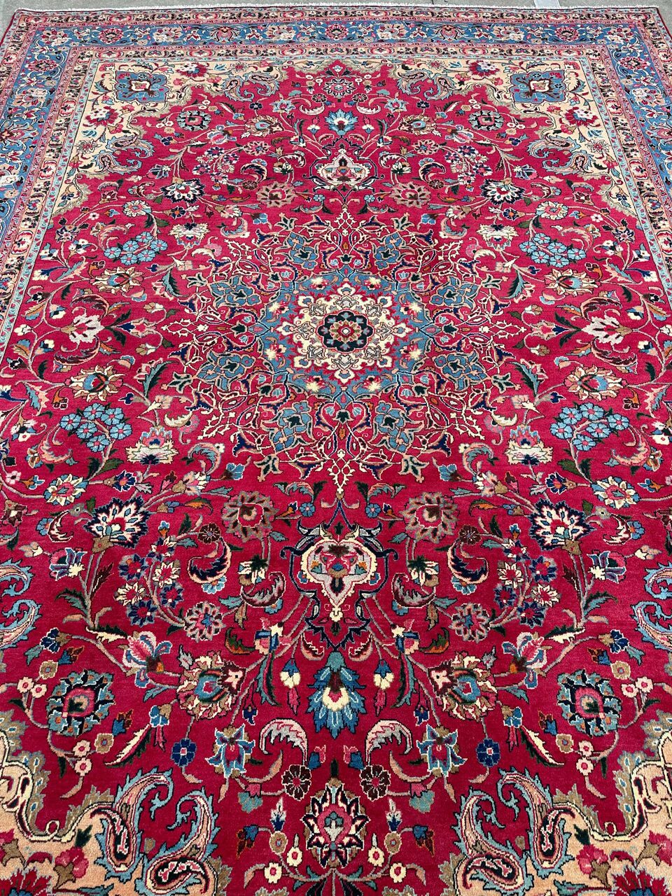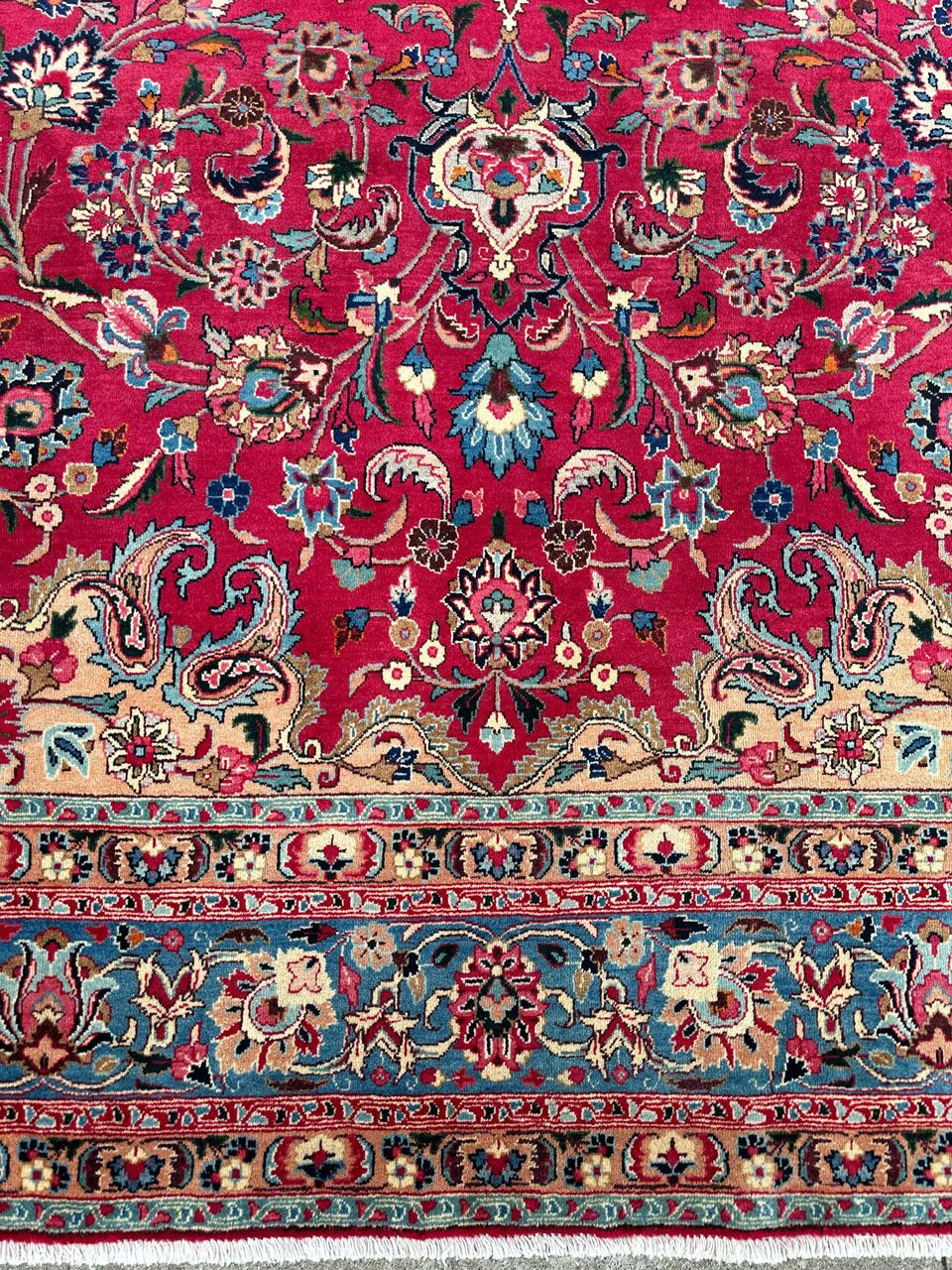 – Timeless Elegance: Immerse your space in the grandeur of this massive room-size authentic handmade Persian Kashmar Carpet. A rare find, it features a pure lamb’s wool pile on a cotton base, with stunning maroon and red and pink tones dyed using traditional methods.