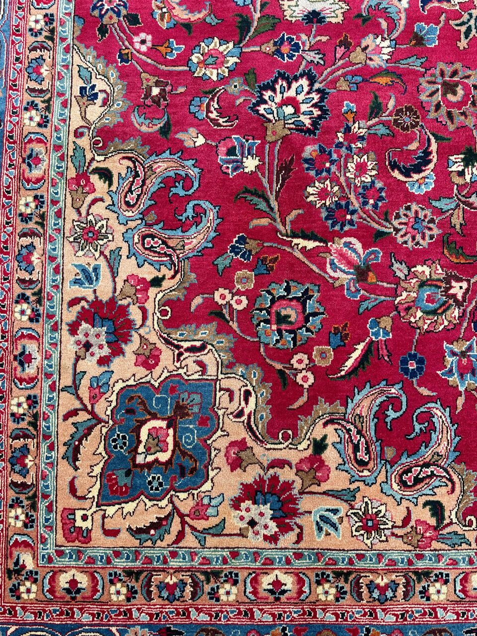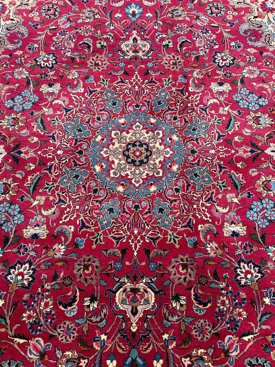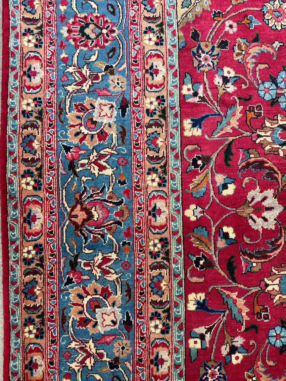 – Timeless Elegance: Immerse your space in the grandeur of this massive room-size authentic handmade Persian Kashmar Carpet. A rare find, it features a pure lamb’s wool pile on a cotton base, with stunning maroon and red and pink tones dyed using traditional methods.