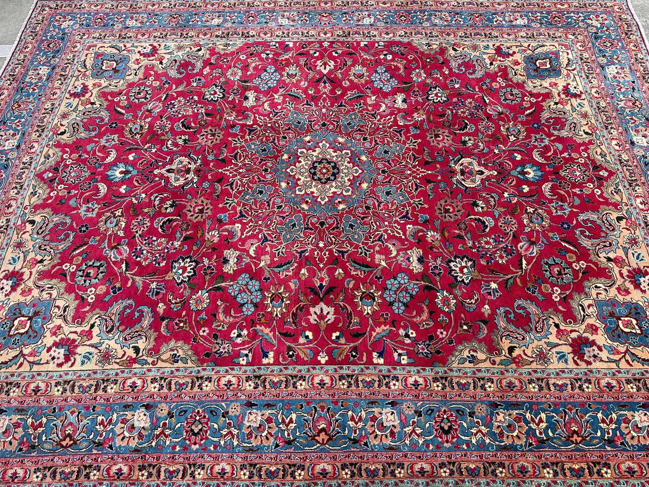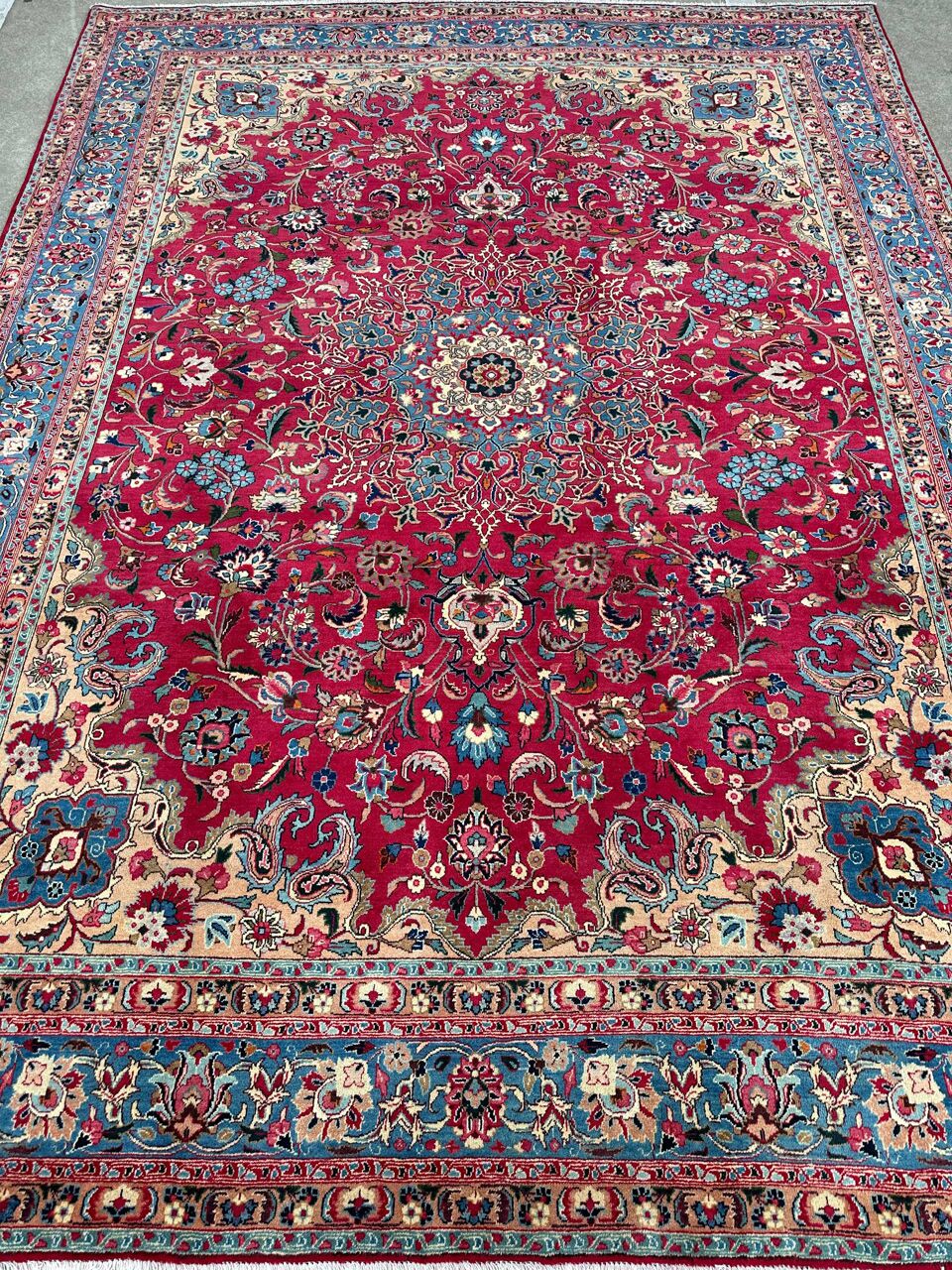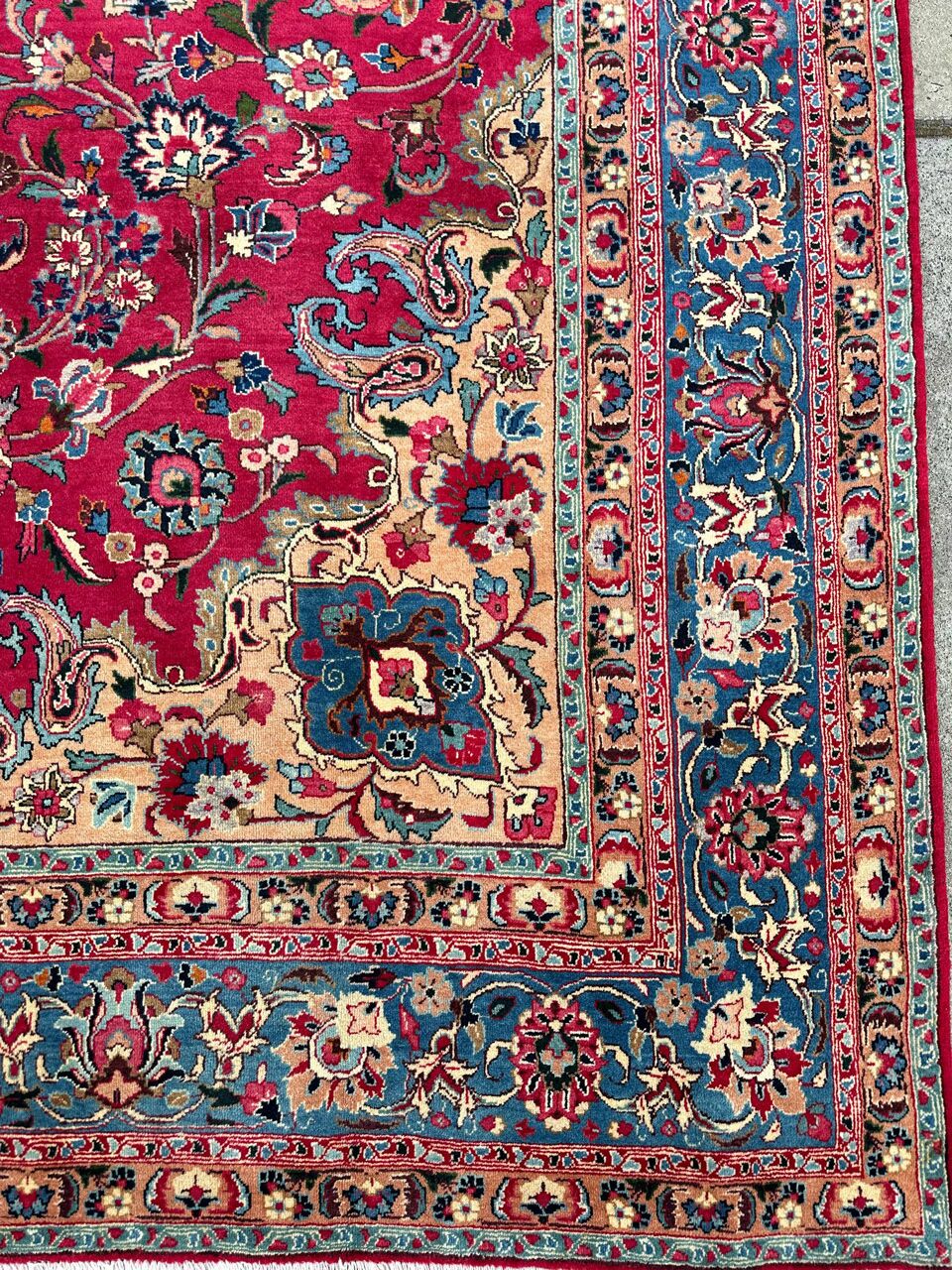 – Timeless Elegance: Immerse your space in the grandeur of this massive room-size authentic handmade Persian Kashmar Carpet. A rare find, it features a pure lamb’s wool pile on a cotton base, with stunning maroon and red and pink tones dyed using traditional methods.