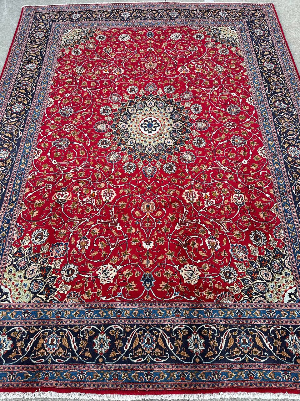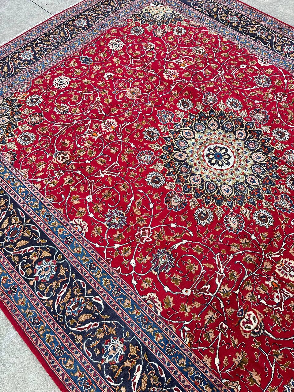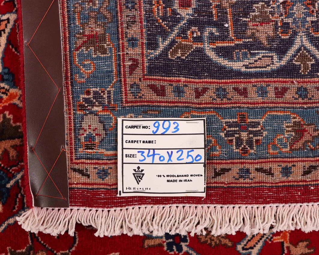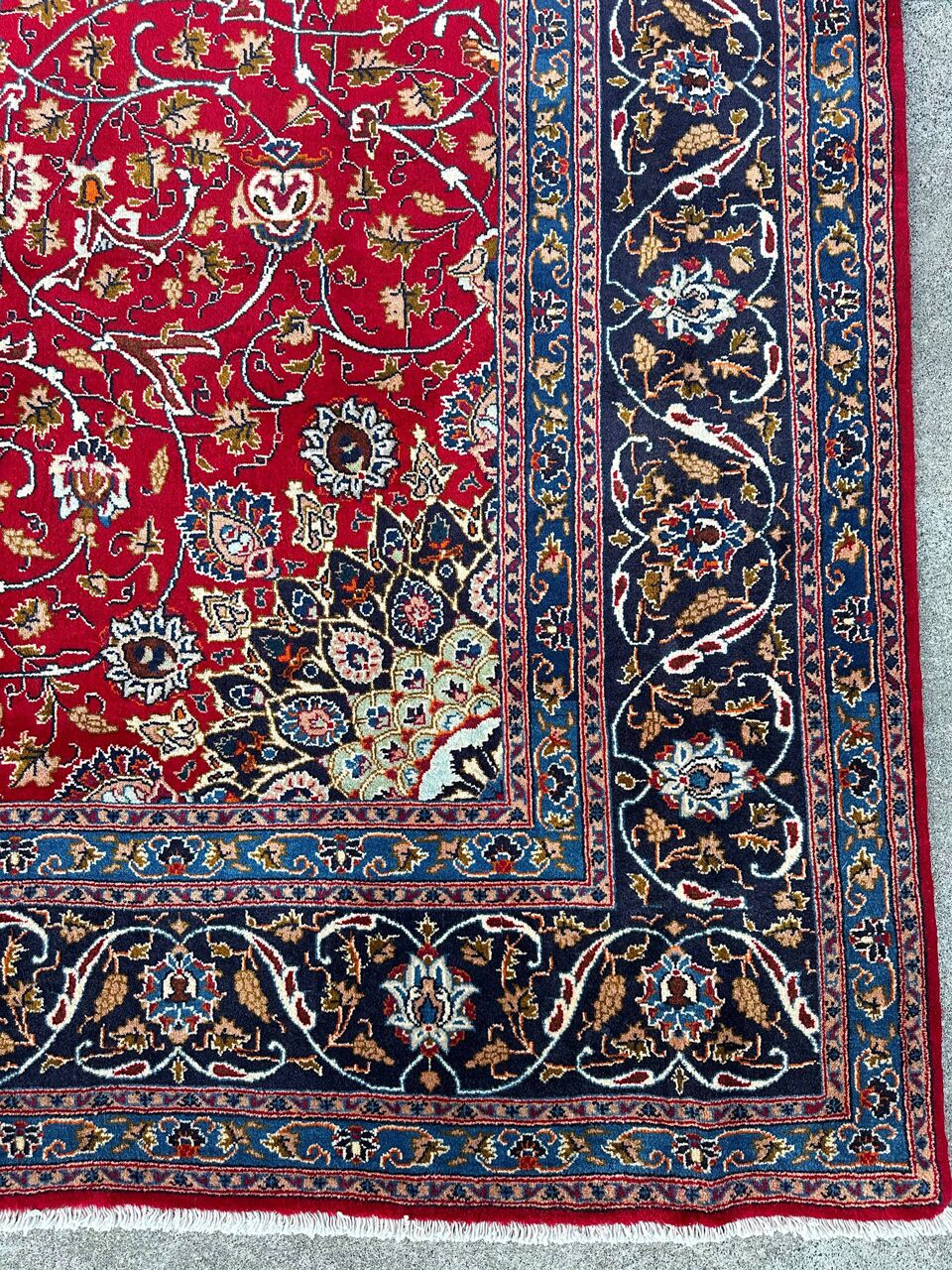 – Massive Room Elegance: Elevate your space with this certified hand-knotted Persian Kashmar carpet, a massive room size authentic handmade piece that’s hard to find in larger sizes. It features a pure lamb’s wool pile on a cotton base, dyed in stunning red and dark blue using traditional methods.