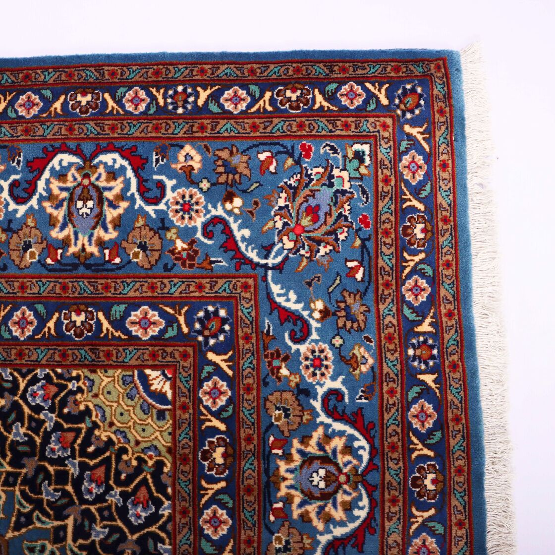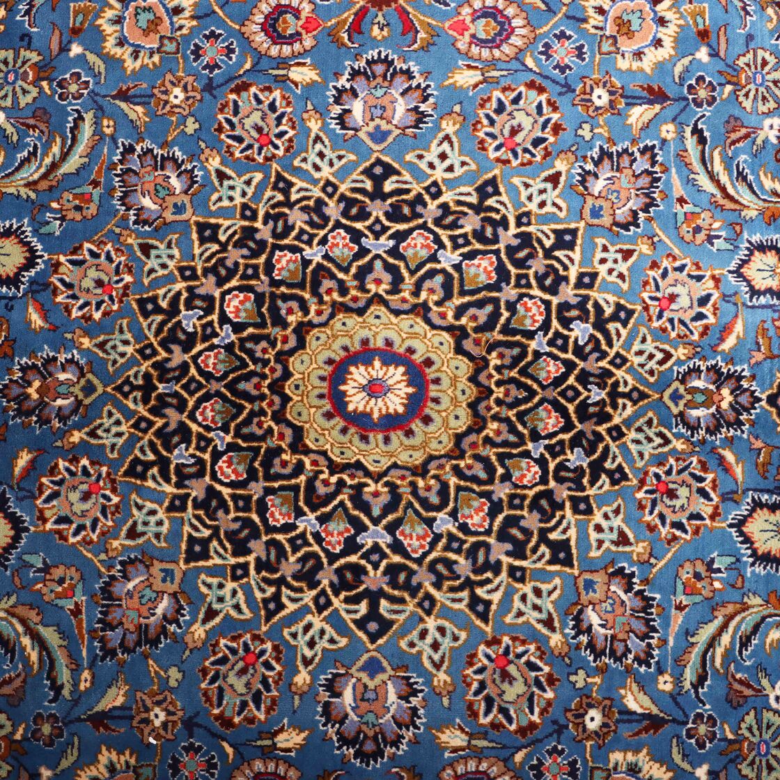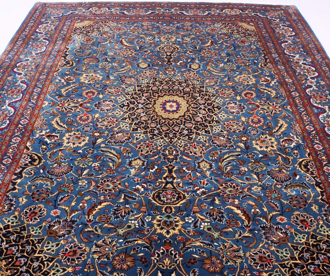 – Exquisite Craftsmanship: Immerse yourself in the amazing craftsmanship of this large room-size authentic handmade Persian Kashmar rug. A rare find, it features pure lamb’s wool pile on a cotton base, dyed in blue, beige, and brown tones using traditional methods.