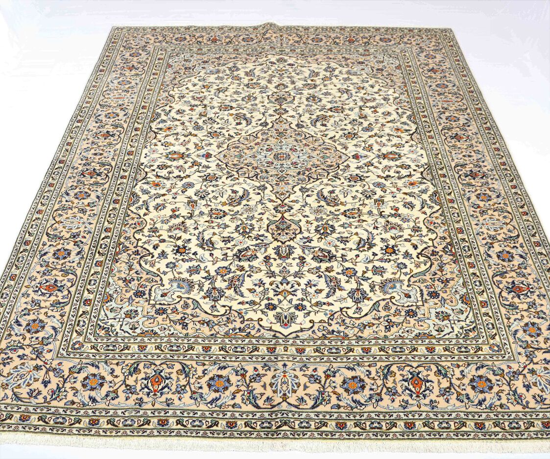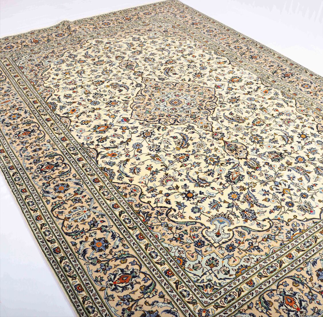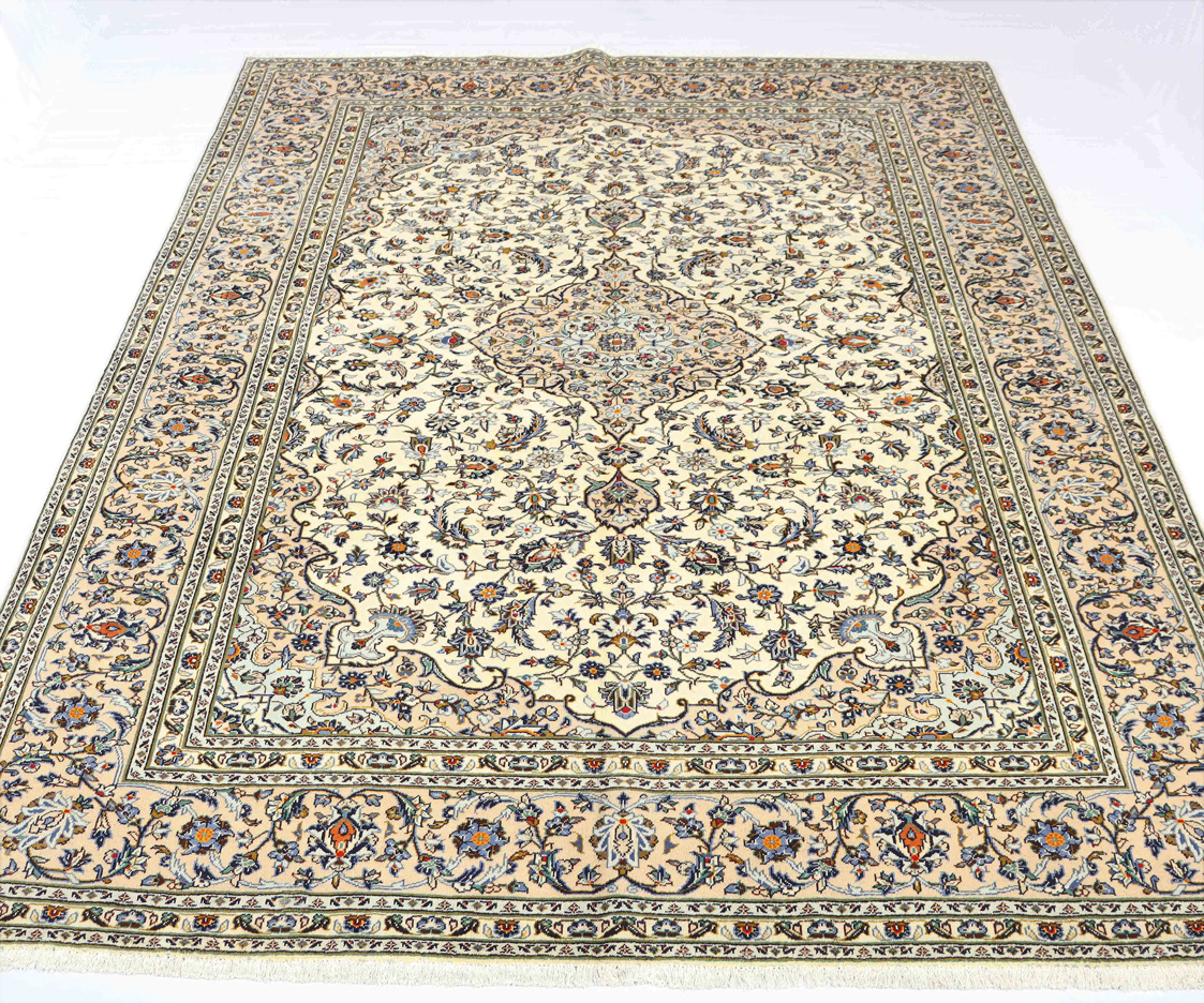 The Kashan rugs surfaced from one of the oldest cities, Kashan, Iran, that shares its namesake. The origin of the Kashan dates back to the 17th century though some experts believe that some of the Kashan’s designs drawback to the 16th century. Room Size Vintage Persian Kashan Rug. Above All It Is Hard To Get This Quality Original Handmade Rug. It Has a Pure Lamb’s Pile on Cotton Base. Main Colors Are Beige, Using Traditional Methods. Fine Quality Piece from City Of Kashan.