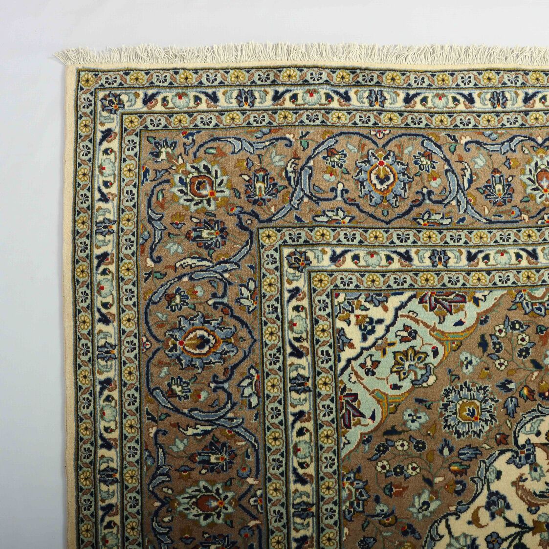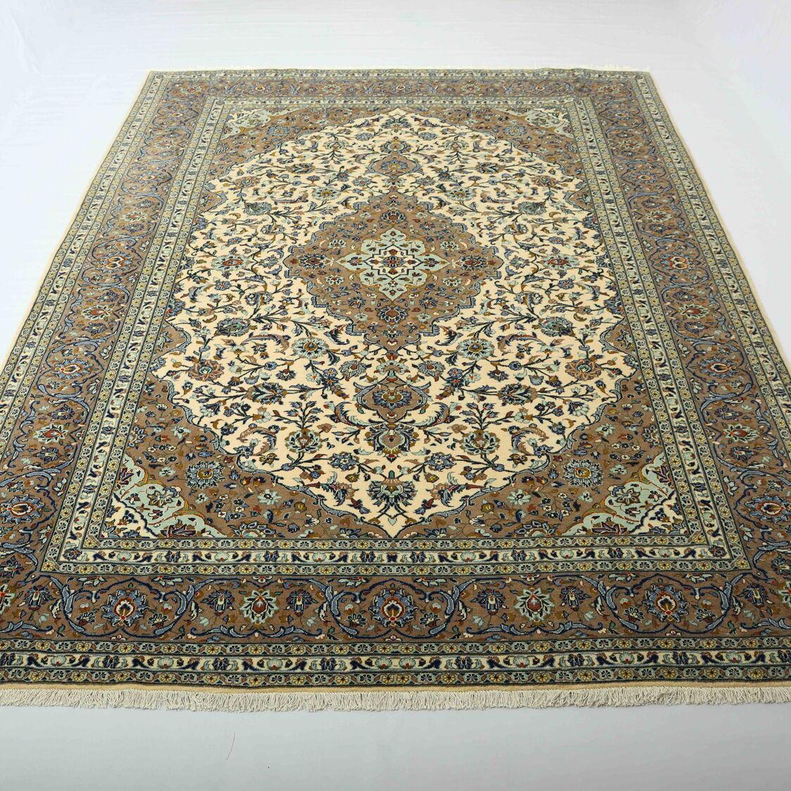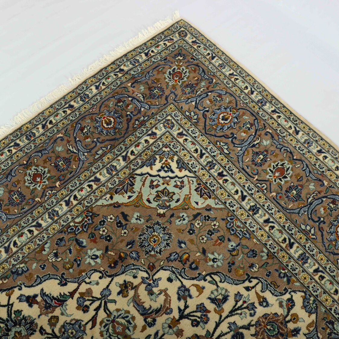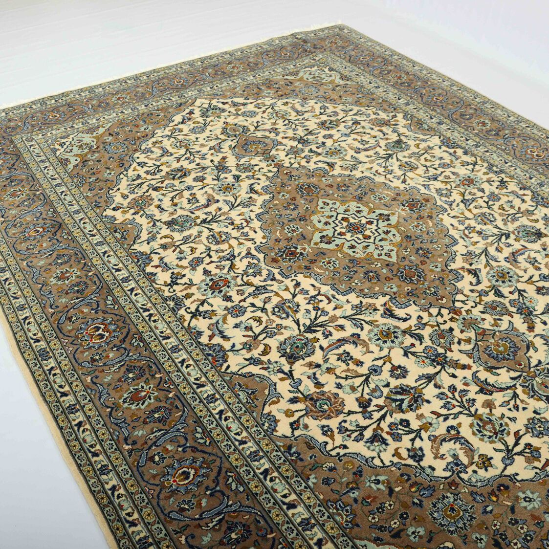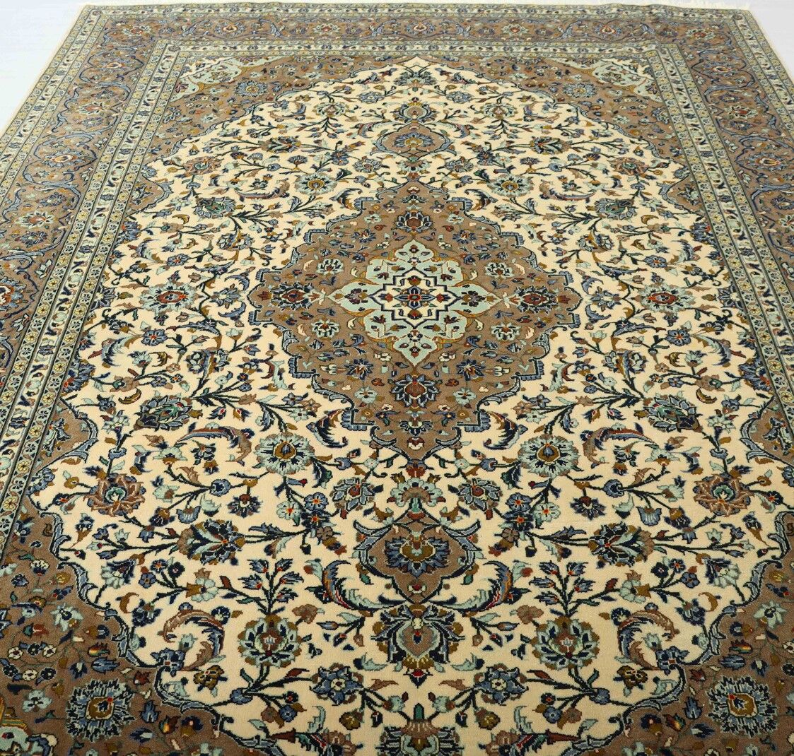 – Timeless Elegance: Immerse your space in the timeless elegance of this certified hand-knotted Persian Kashan rug. A room size authentic handmade piece with a pure lamb’s pile on a cotton base, featuring a classic beige background dyed using traditional methods.