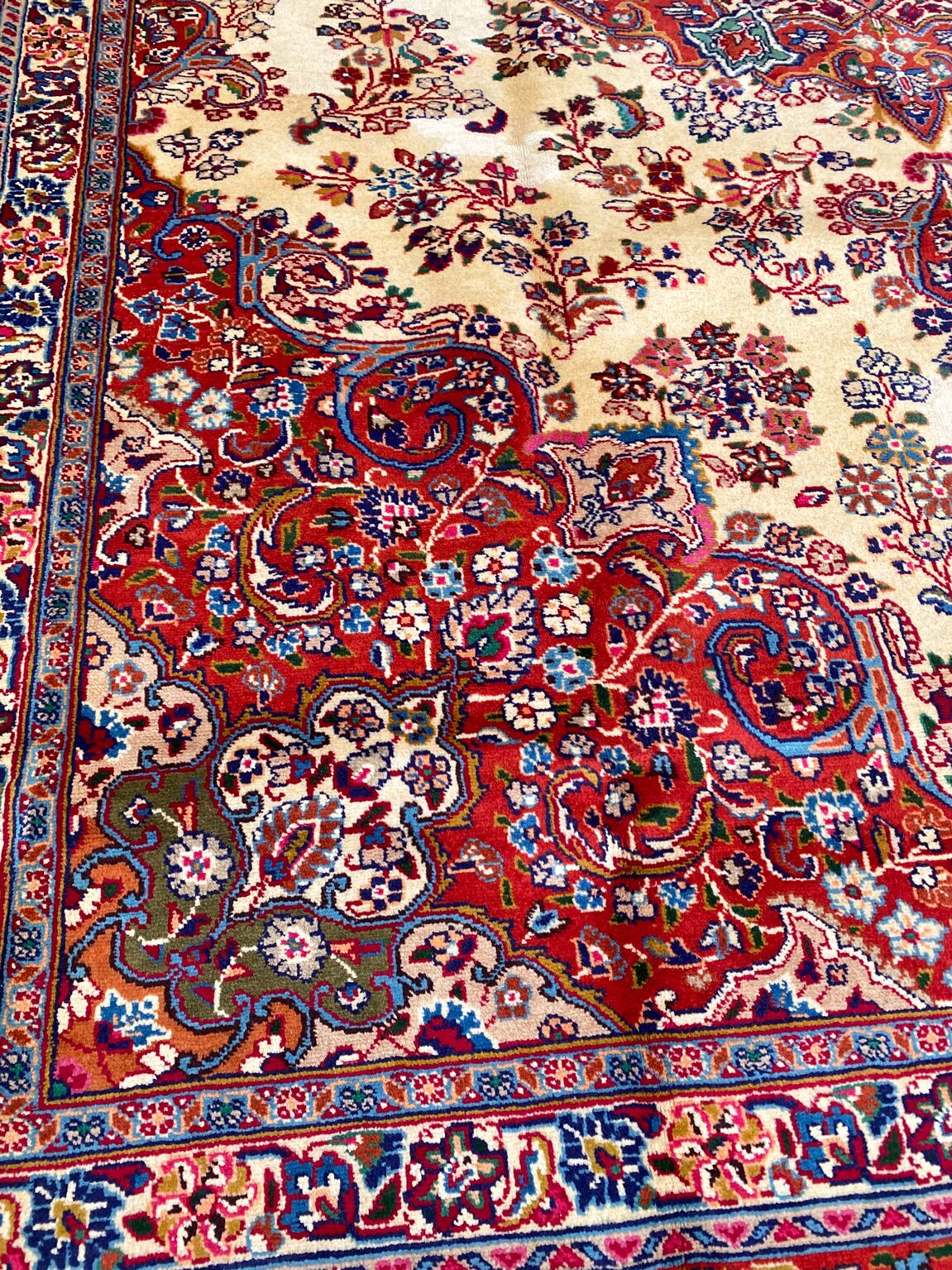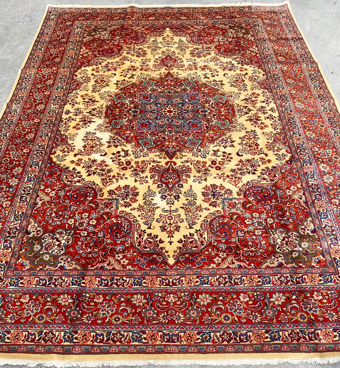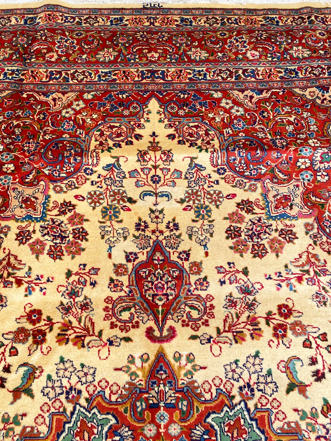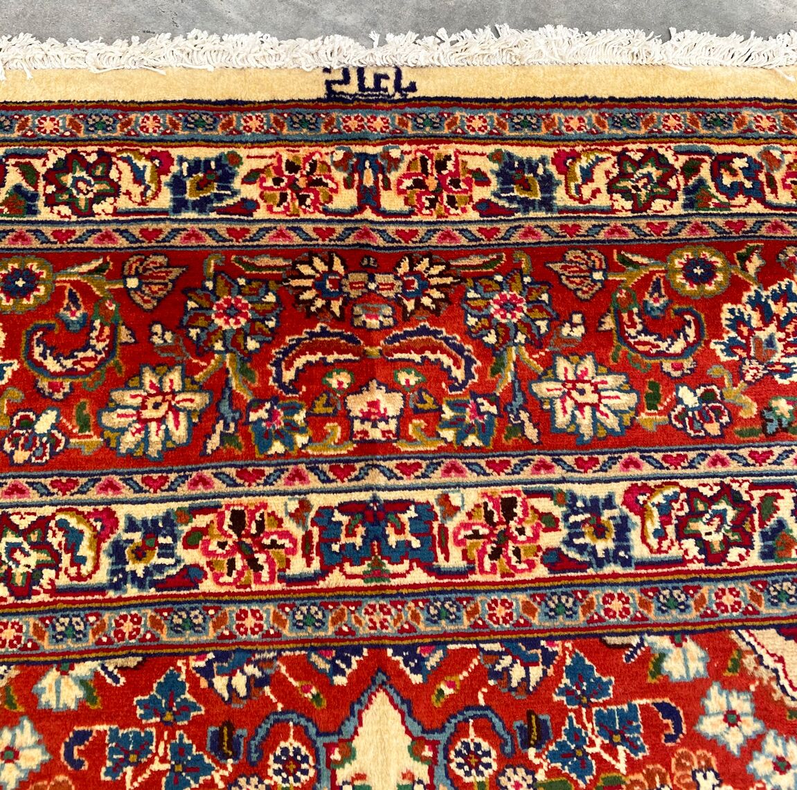Room Size Authentic Persian Carpet. Above All It Is Hard To Get Signed Hand Made Rug In Larger Sizes. It Is Pure Lamb’s Pile On Cotton Base. It Also Has A Beige Background Dyed Using Traditional Methods. Dense Quality Piece That It Would Last A Life Time.