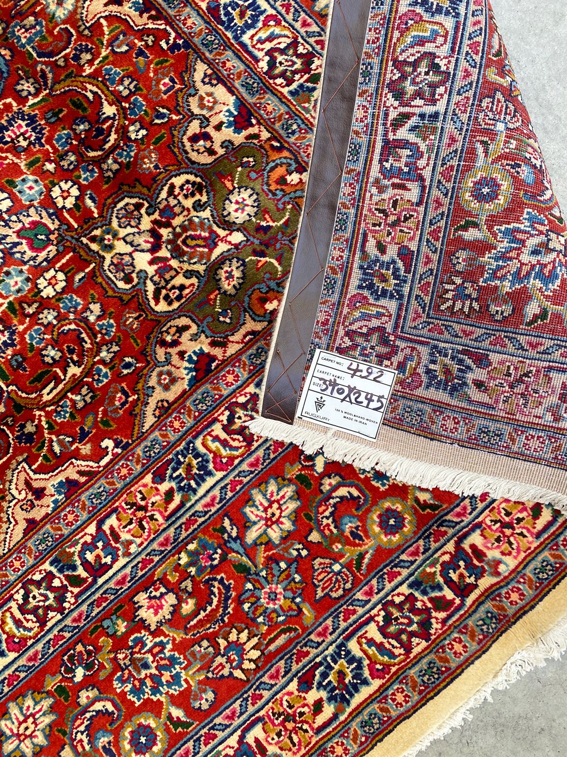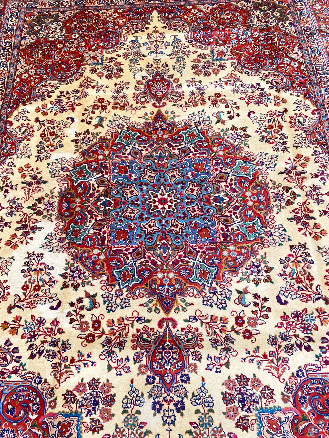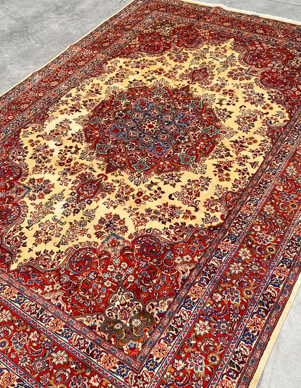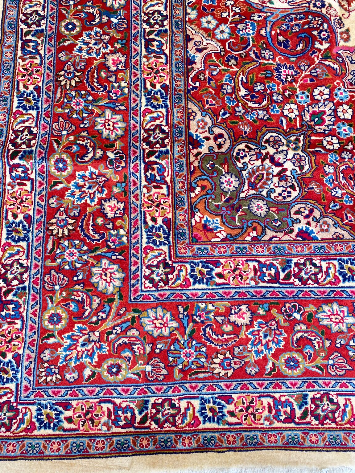 Room Size Authentic Persian Carpet. Above All It Is Hard To Get Signed Hand Made Rug In Larger Sizes. It Is Pure Lamb’s Pile On Cotton Base. It Also Has A Beige Background Dyed Using Traditional Methods. Dense Quality Piece That It Would Last A Life Time.