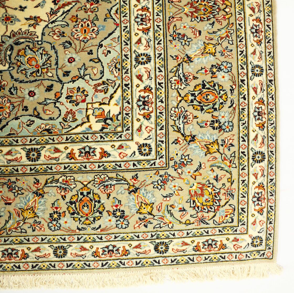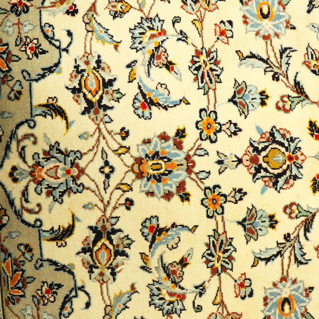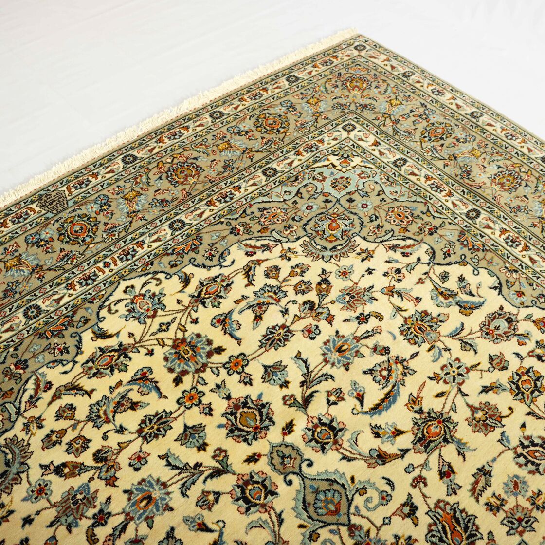 Room Size Persian Kashan Rug. Above All It Is Hard To Get This Quality Original Handmade Rug. It Has a Pure Lamb’s Pile on Cotton Base. Main Colors Are Beige, Using Traditional Methods. Fine Quality Piece from City Of Kashan.