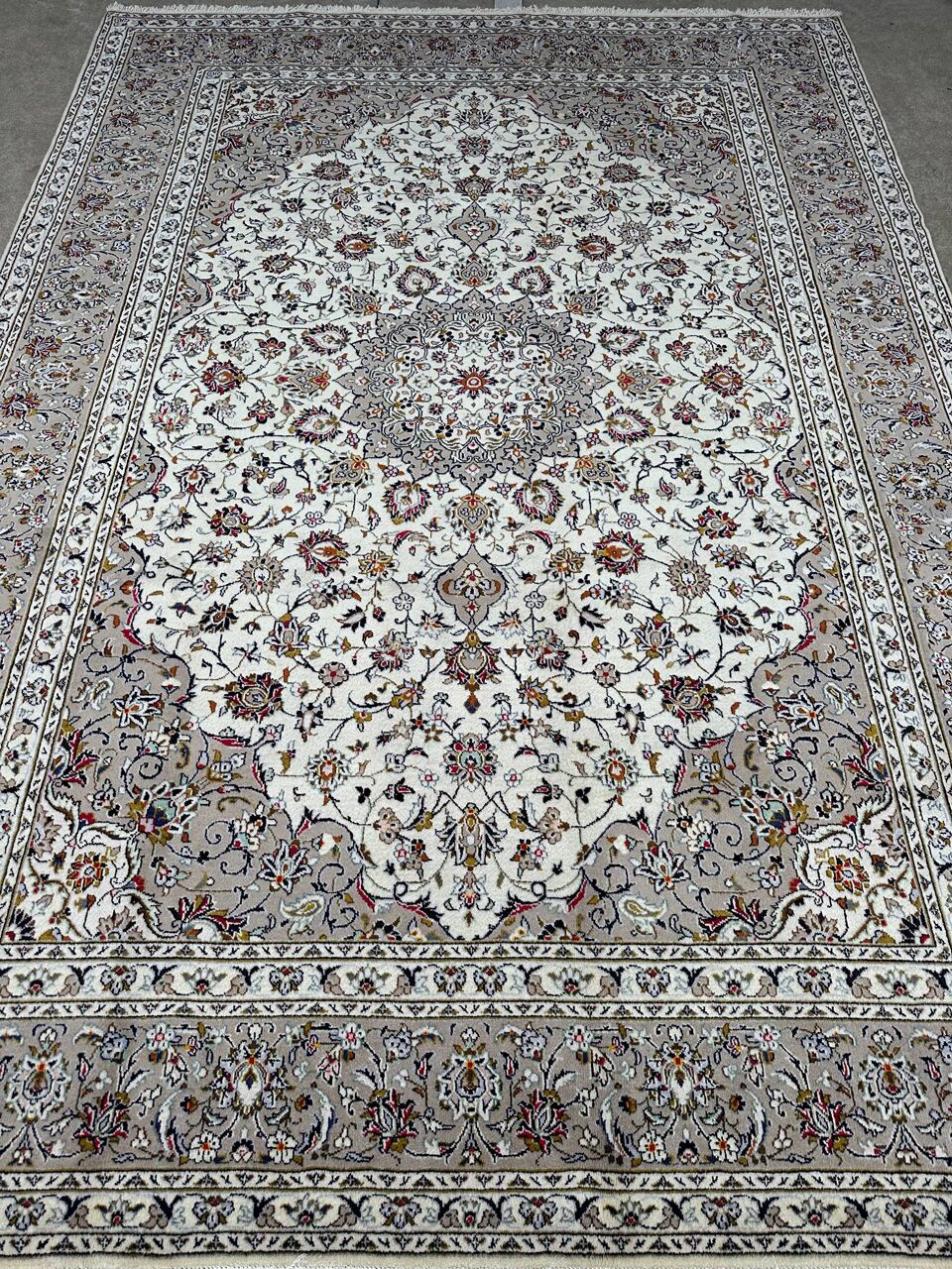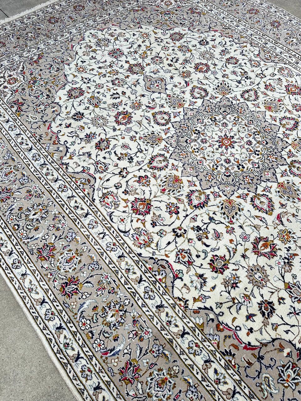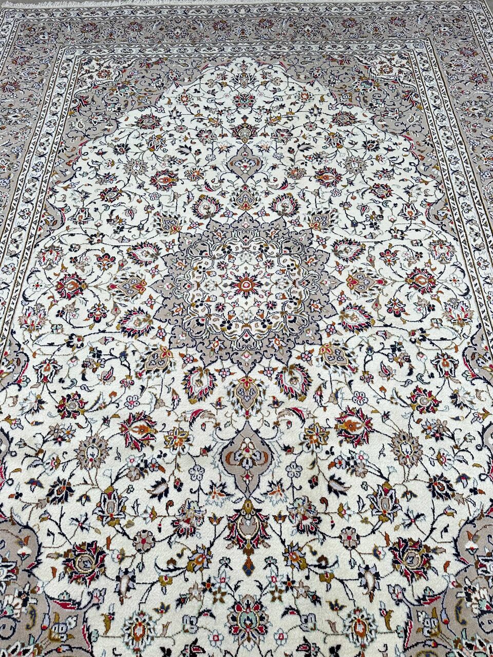 – Timeless Beauty: Immerse yourself in the timeless beauty of this large room size Persian Kashan rug. A rare piece, it features pure lamb’s pile on a cotton base, with beige tones dyed using traditional methods.