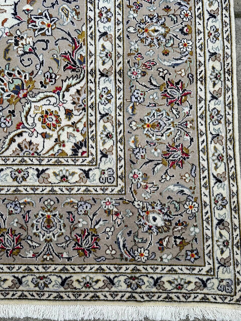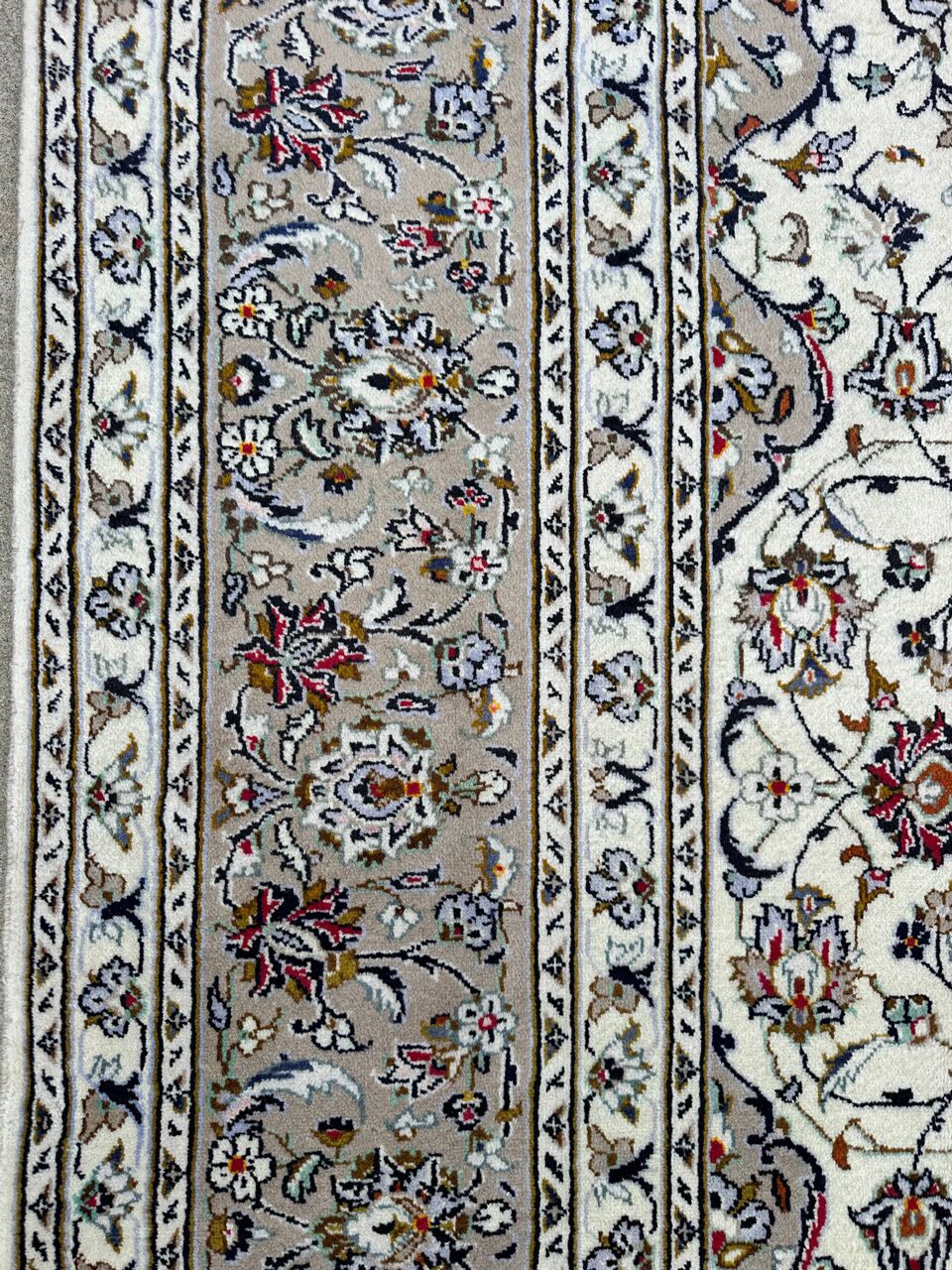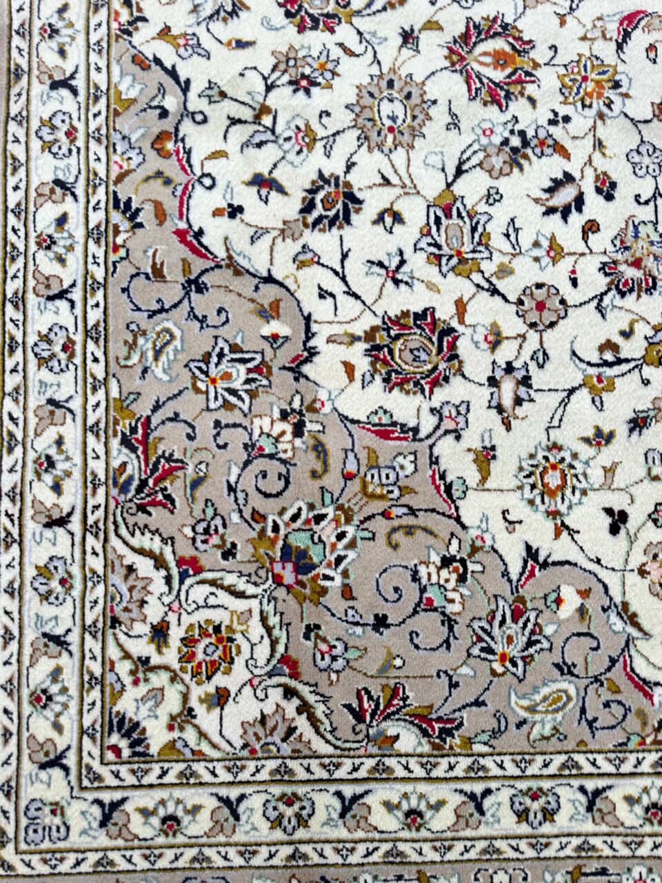 – Timeless Beauty: Immerse yourself in the timeless beauty of this large room size Persian Kashan rug. A rare piece, it features pure lamb’s pile on a cotton base, with beige tones dyed using traditional methods.