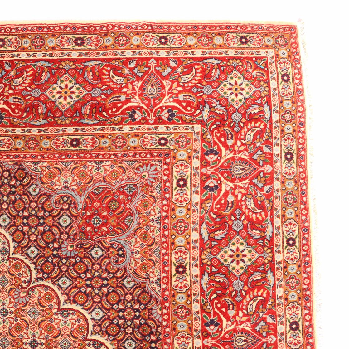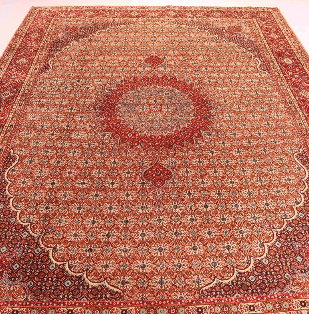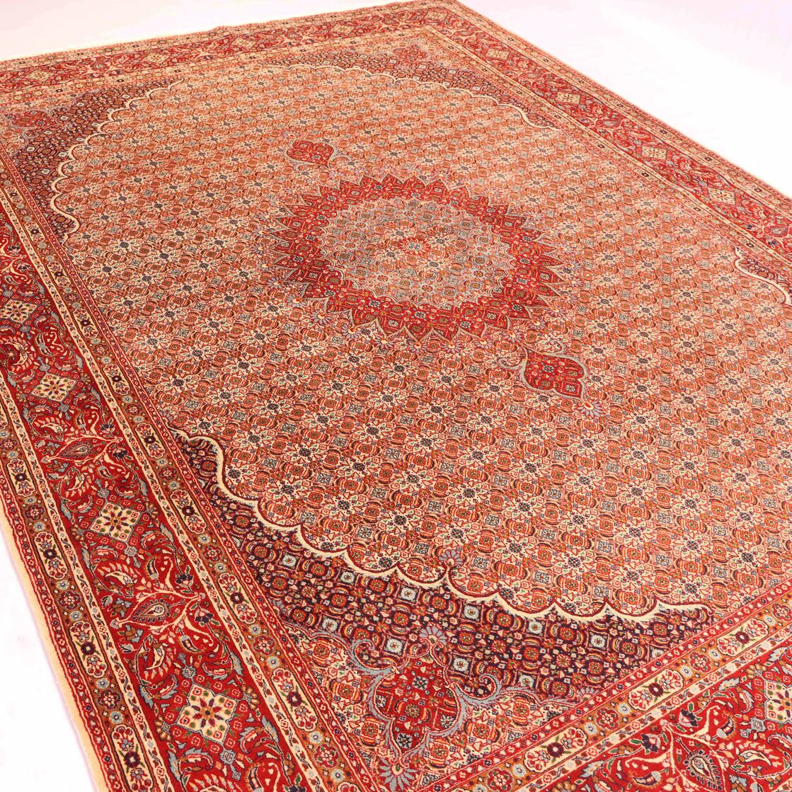 – Timeless Elegance: Immerse your space in the timeless pattern and fine workmanship of this super fine full room size Persian Mood Rug. Pure lamb’s wool pile on a fine cotton base creates a dense quality carpet in beige, blue, and red tones, crafted with traditional methods.
