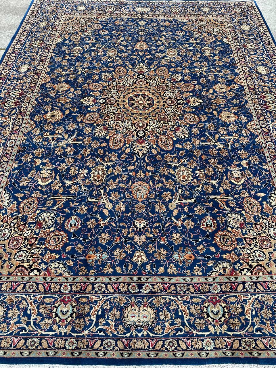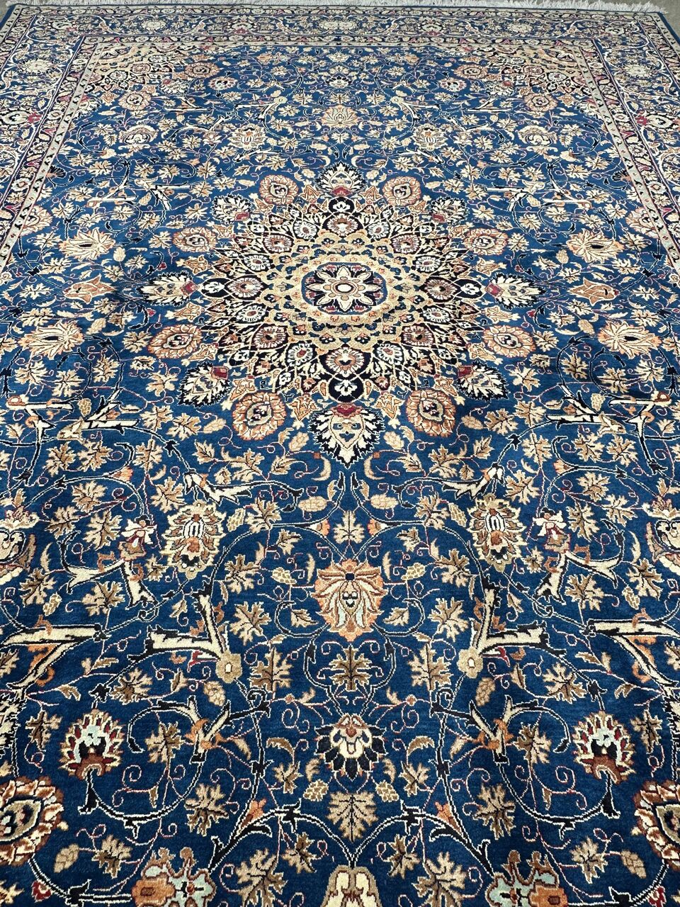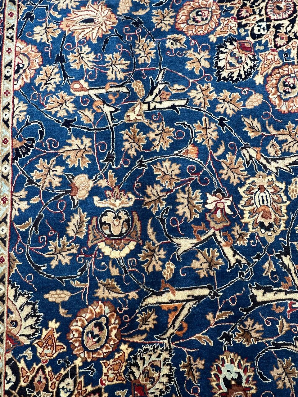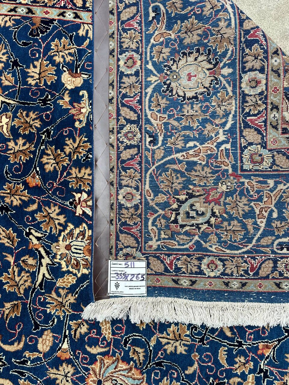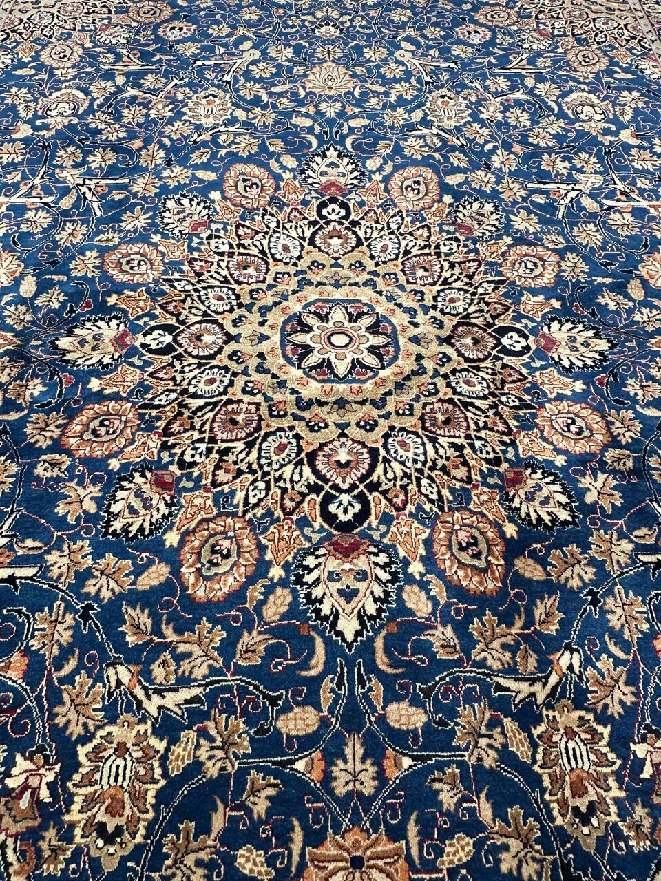 – Exquisite Craftsmanship: Immerse yourself in the amazing craftsmanship of this large room-size authentic handmade Persian Kashmar rug. A rare find, it features pure lamb’s wool pile on a cotton base, dyed in blue, beige, and brown tones using traditional methods.
