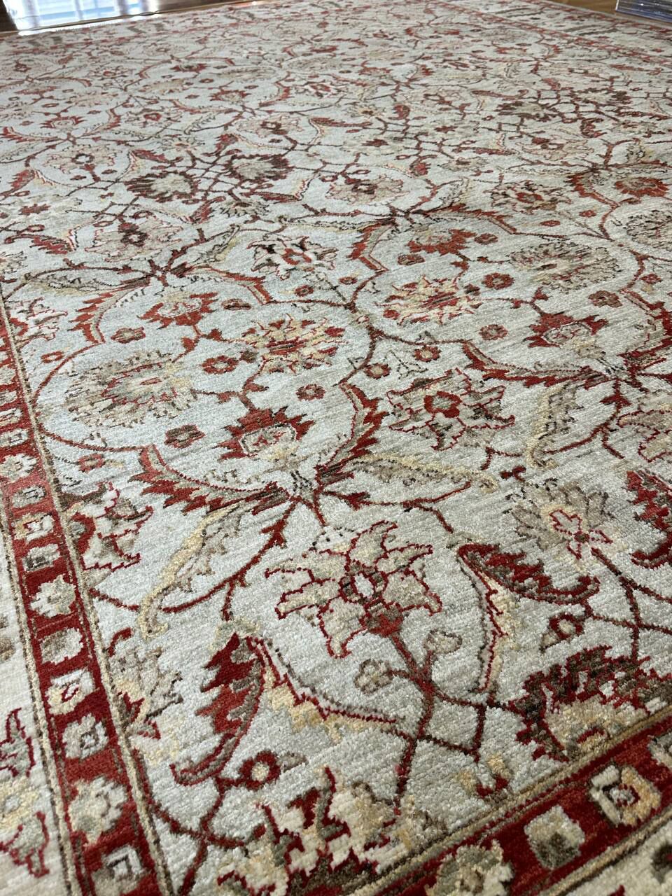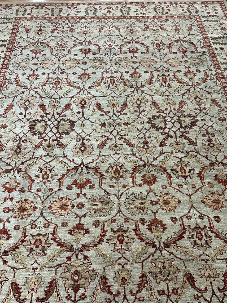 • Design: Features an allover floral design with a revival of the Art Deco pattern, beautifully rendered in beige tones and dyed with traditional vegetable dyes.