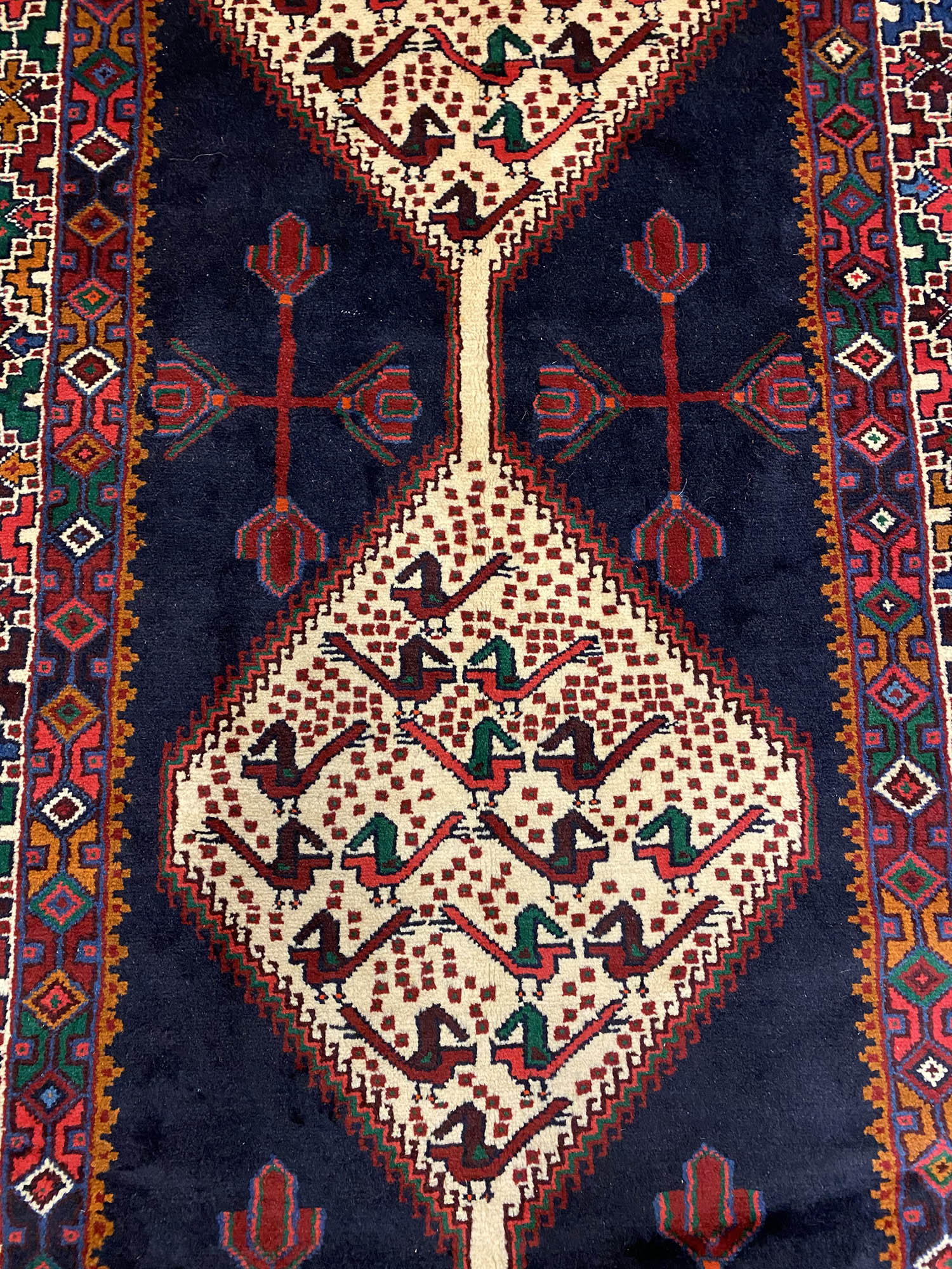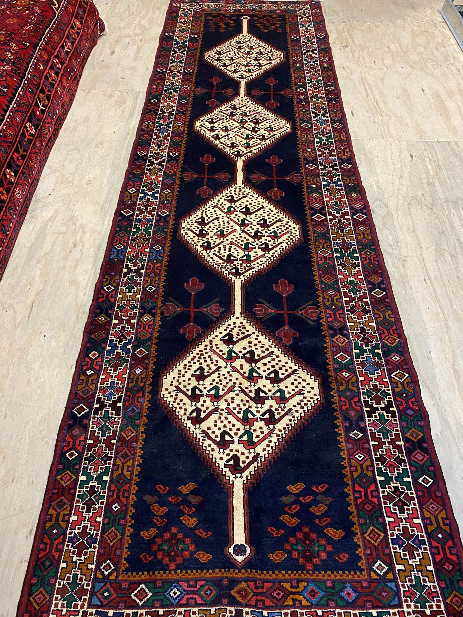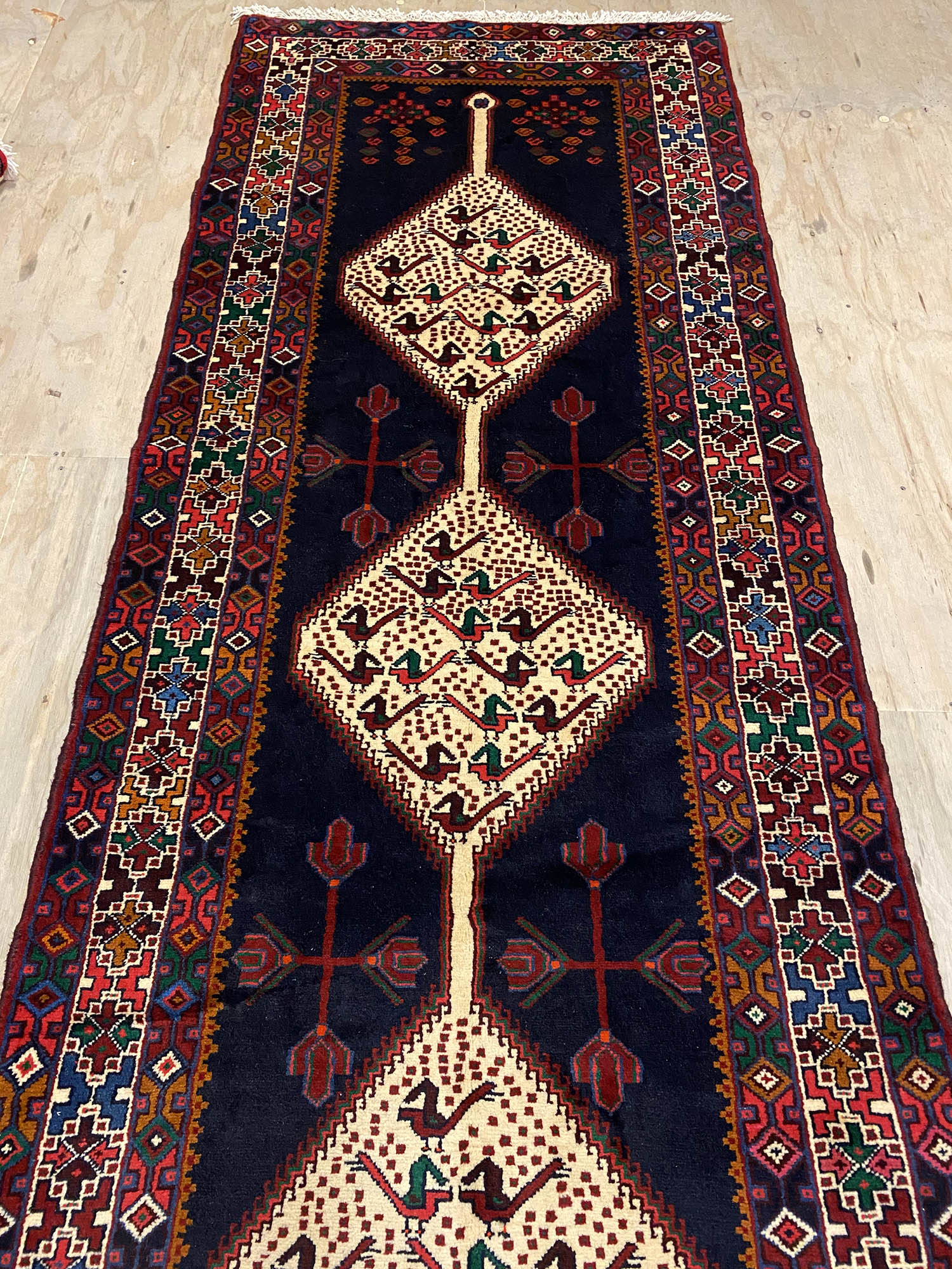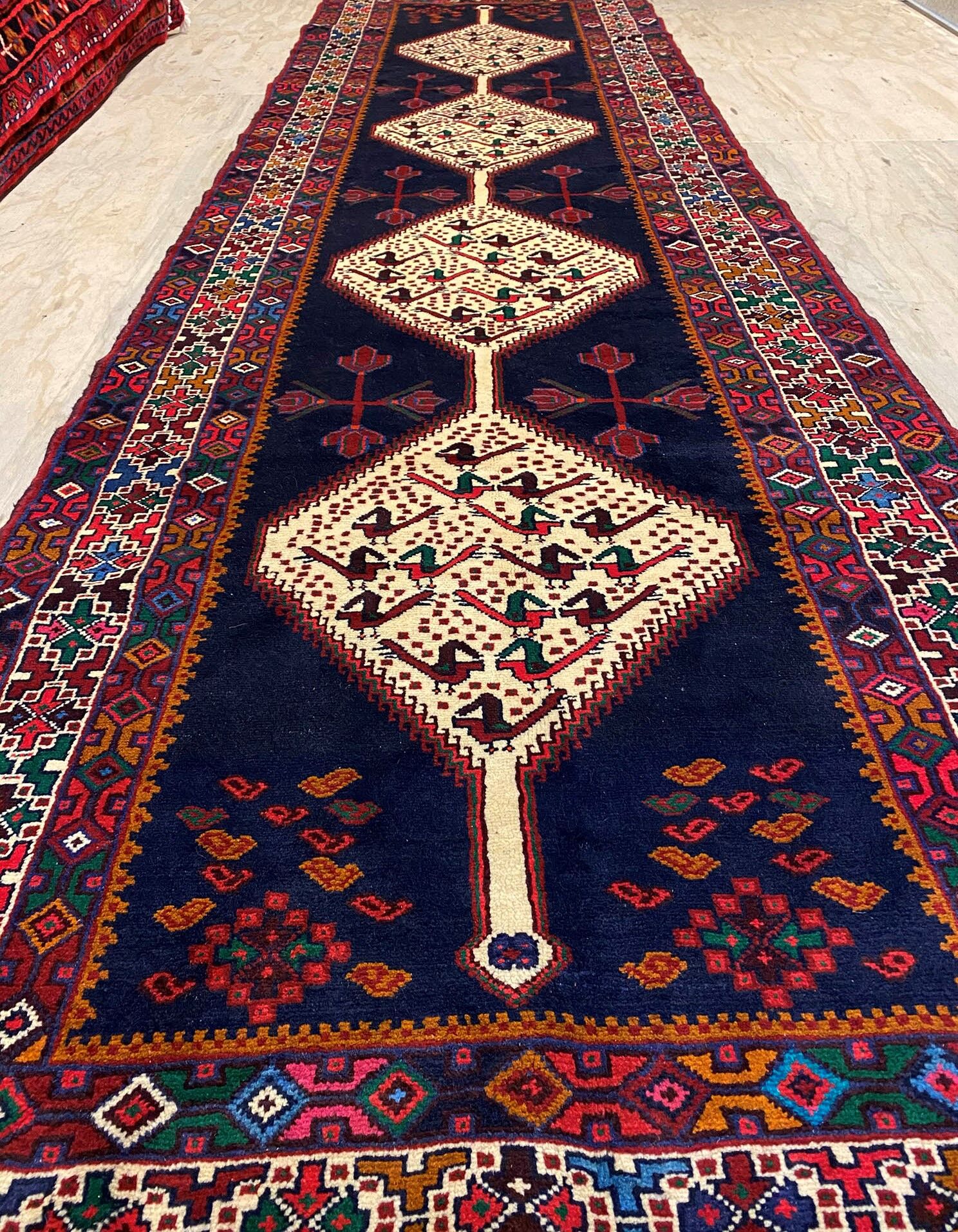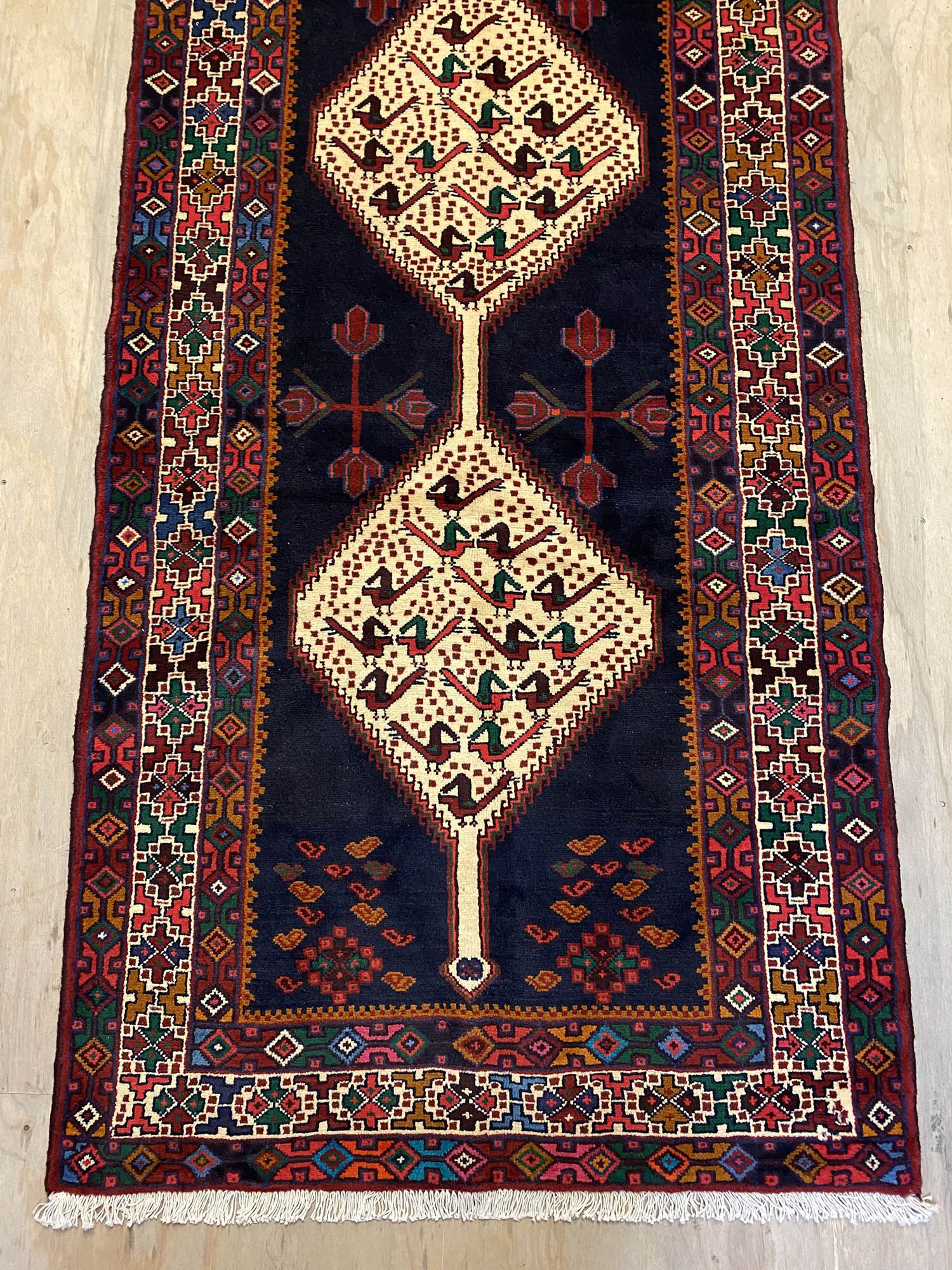 Hand Knotted Tribal Persian Saveh Runner. Above All It Is Hard Wearing & Durable Piece Which Would Last You A Life Time. Pure Hand Spun Wool Pile On Cotton Base. It Also Has Am Indigo Blue Tone Dyed Using Traditional Methods.
