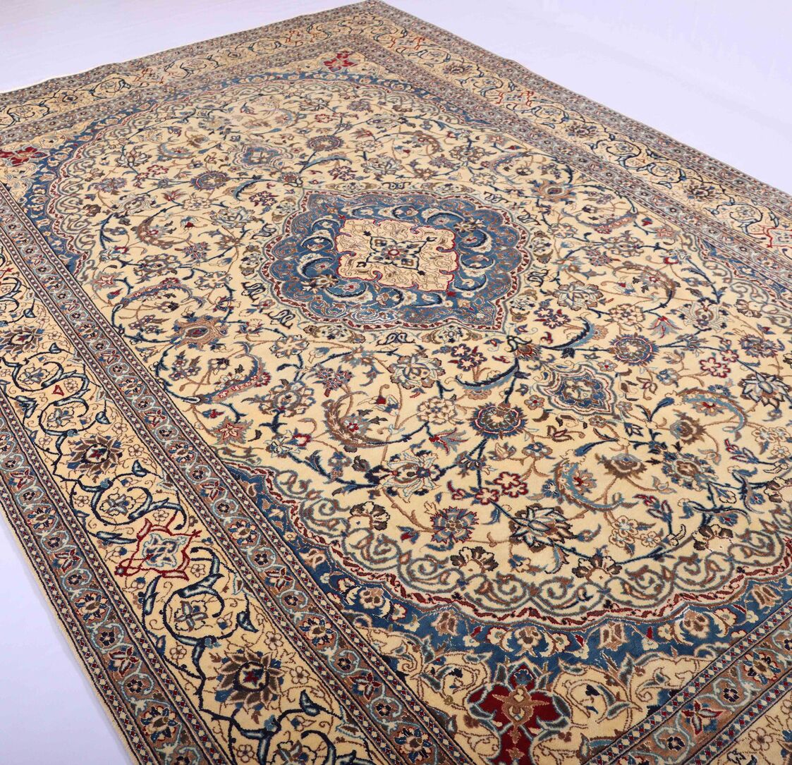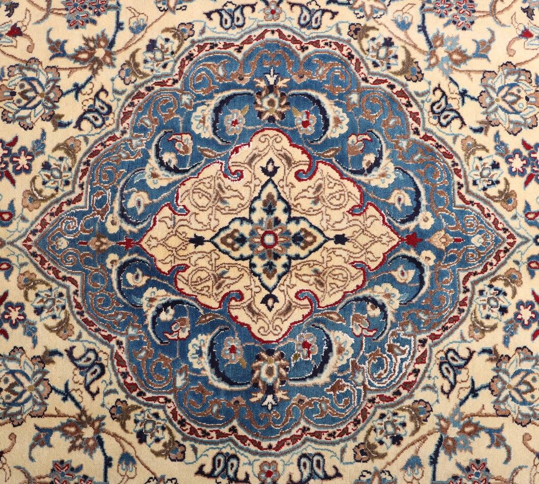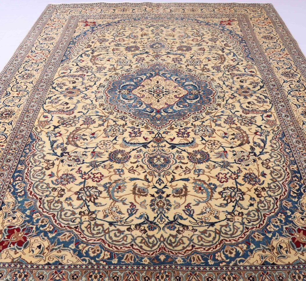 Large Room Size Authentic Persian Nain Carpet. Above All It Is Hard To Get This Quality Hand Made Rug In Larger Sizes. Lamb’s Wool + Silkinlaid Pile On Cotton Base. It Also Has A French Blue Tones Dyed Using Traditional Methods. Superb Quality Piece From City Of Nain.