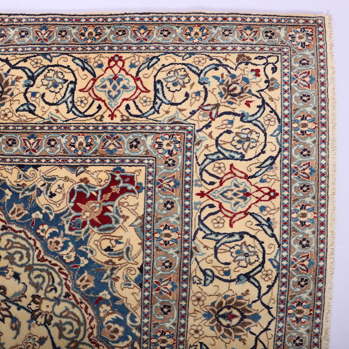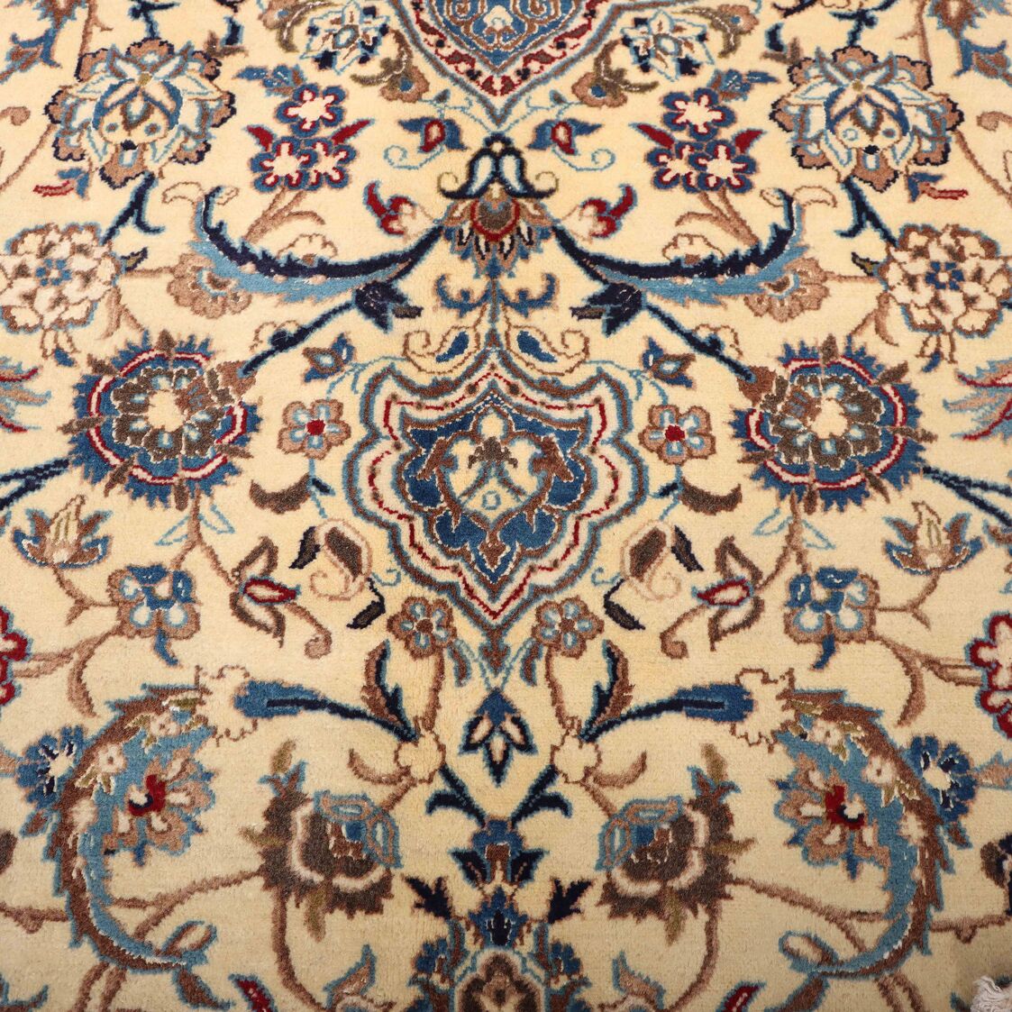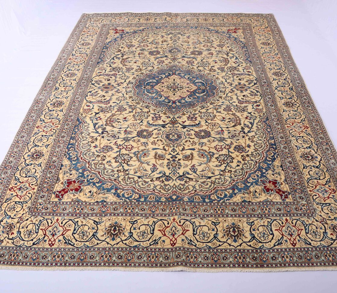 Large Room Size Authentic Persian Nain Carpet. Above All It Is Hard To Get This Quality Hand Made Rug In Larger Sizes. Lamb’s Wool + Silkinlaid Pile On Cotton Base. It Also Has A French Blue Tones Dyed Using Traditional Methods. Superb Quality Piece From City Of Nain.