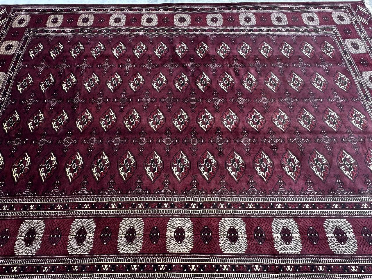 – Tribal Elegance: Immerse your space in the tribal elegance of this room-size hand-knotted Turkoman rug. Crafted with pure hand-spun wool pile on a cotton base, it features a rich dark brown tone dyed using traditional methods.