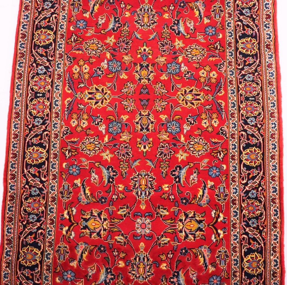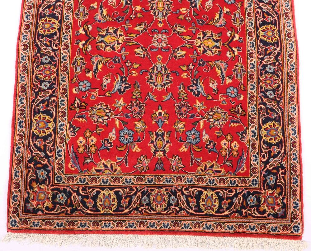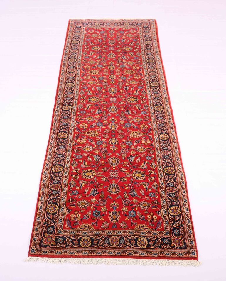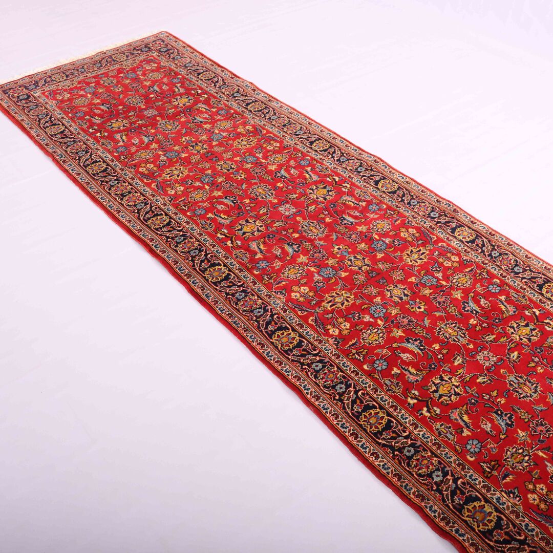 Discounted 3m Long Authentic Hand Knotted Persian Kashan Runner. Above All It Is Hard To Get This Quality Original Handmade Runners Over 3m. It Has a Pure Lamb’s Wool Pile On Cotton Base. Rich Burgundy And Indigo Blue Tones Dyed Using Traditional Methods. Fine Quality Piece from City Of Kashan.