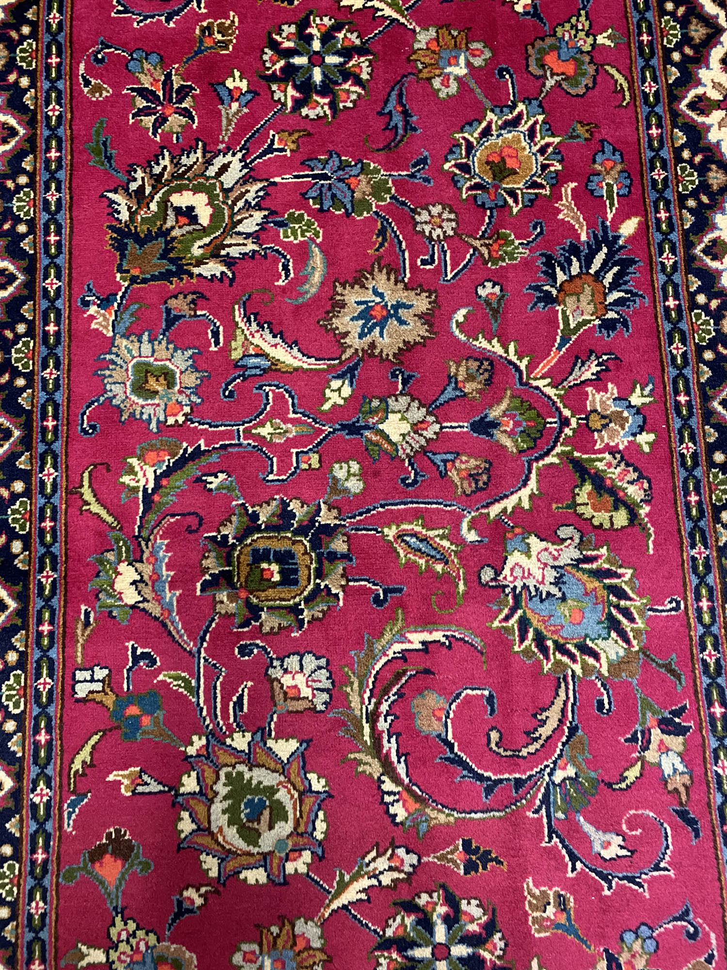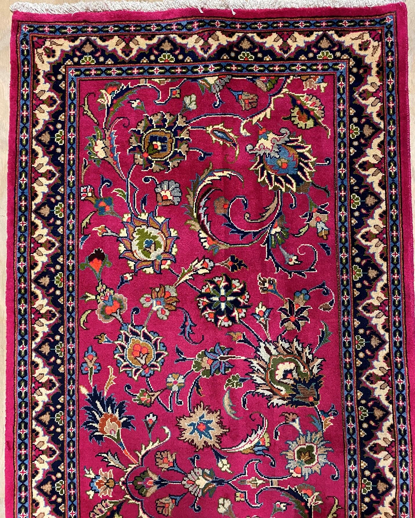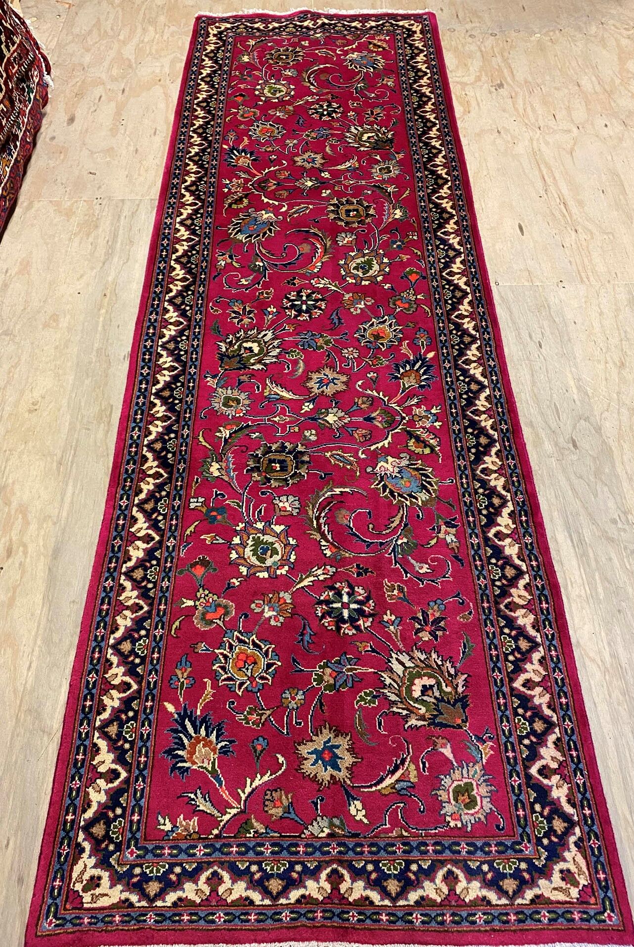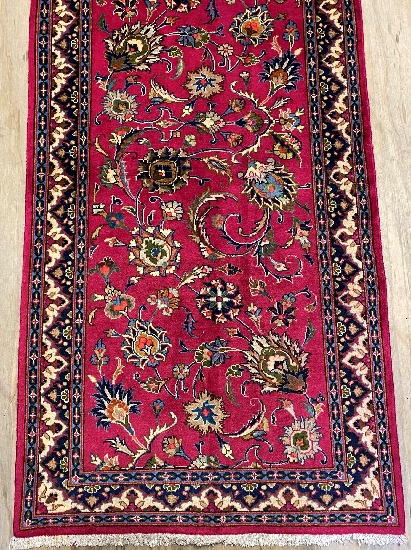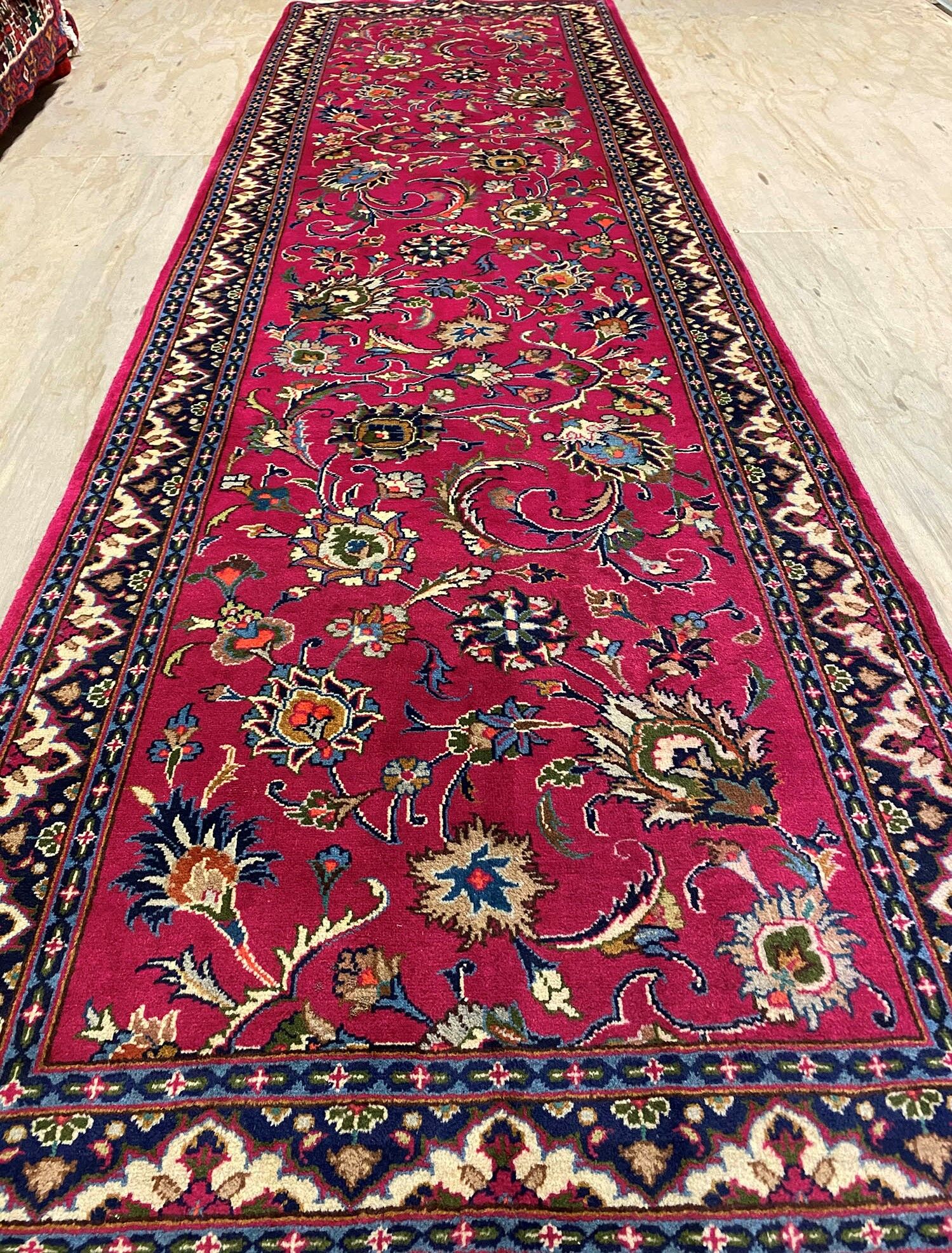 3m Authentic Persian Mashad Runner. Above All It Is Hard To Get This Quality Hand Made Runner. It Also Has A Pure Lamb’s Pile On Cotton Base. Pinky Tones Dyed Using Traditional Methods.