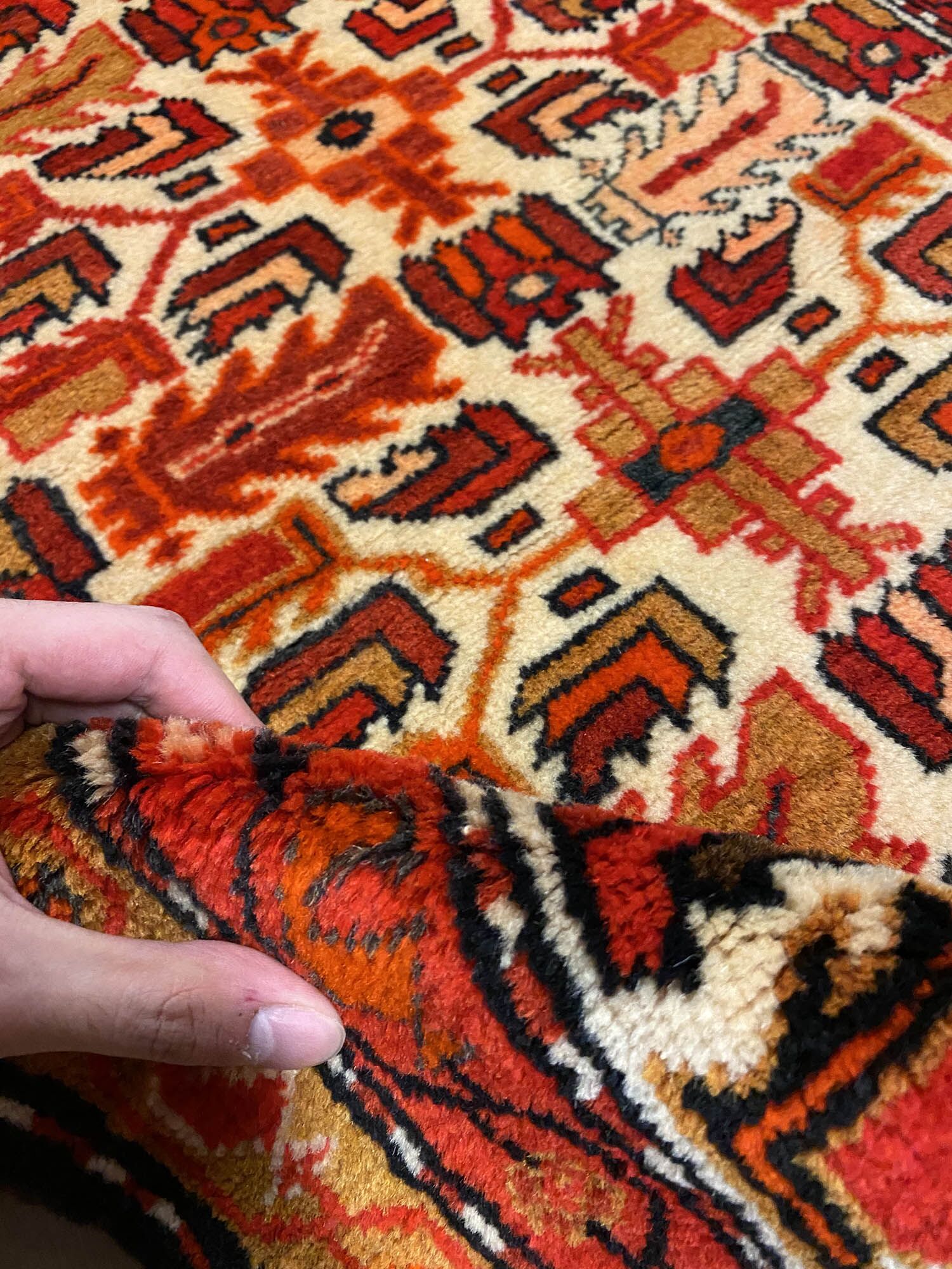 – Craftsmanship: Pure hand-spun wool pile on a cotton base, featuring a gorgeous red background dyed using traditional methods.