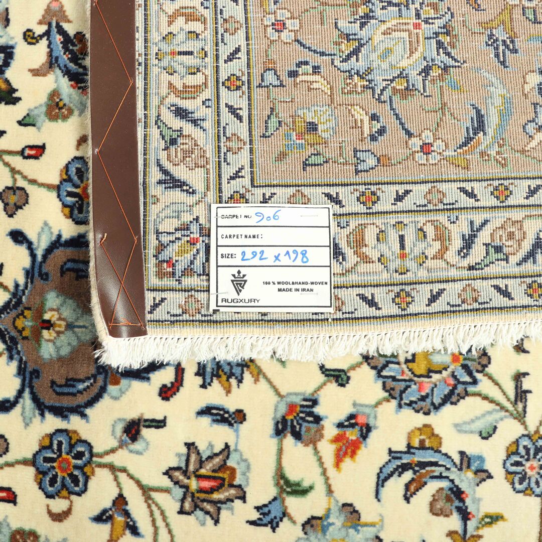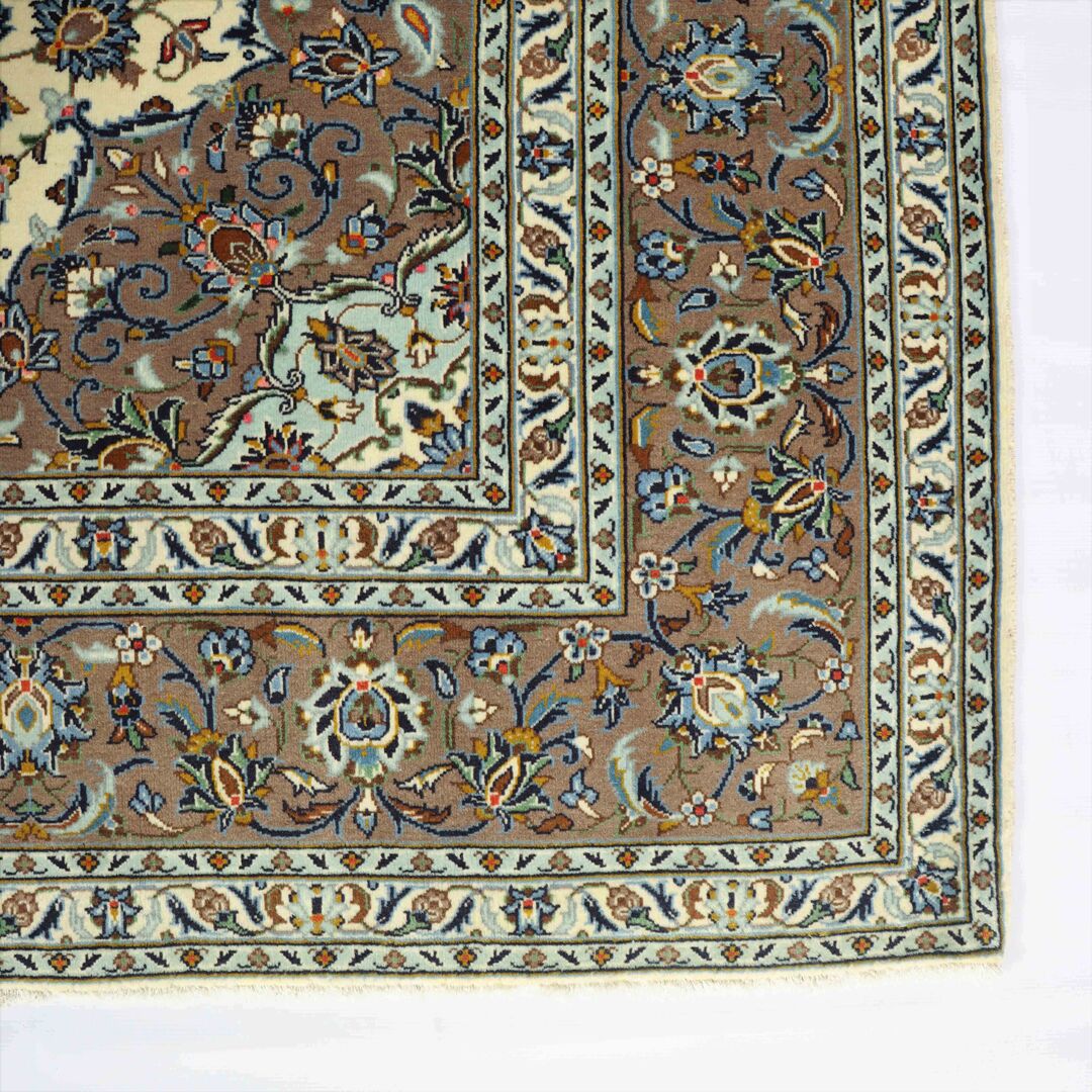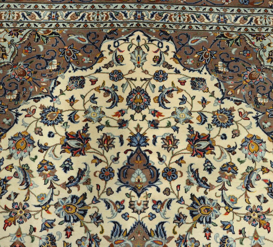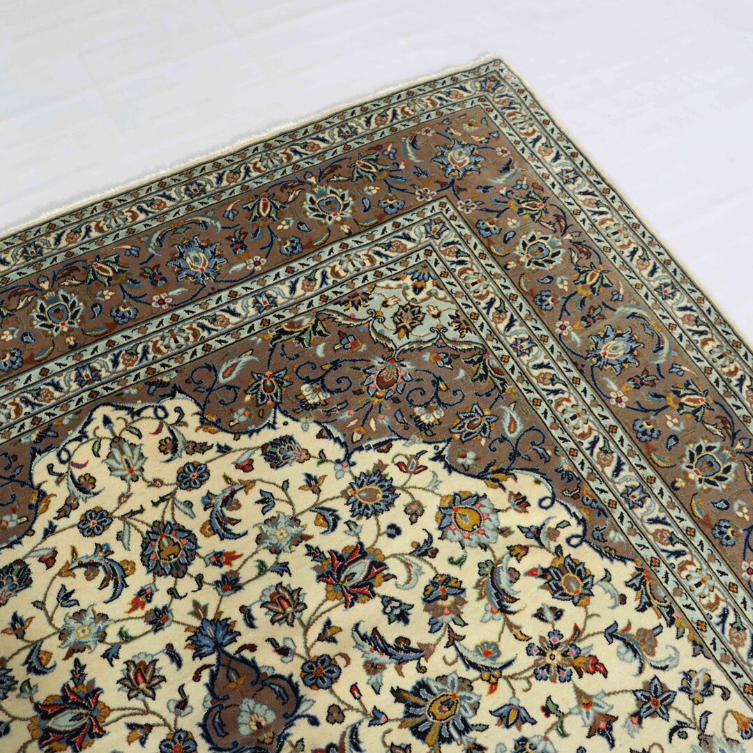 – Timeless Elegance: Immerse your space in the timeless elegance of this certified hand-knotted Persian Kashan rug. A room size authentic handmade piece with a pure lamb’s pile on a cotton base, featuring a classic beige background dyed using traditional methods.