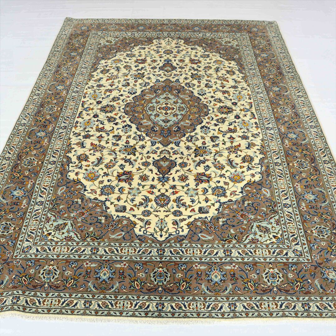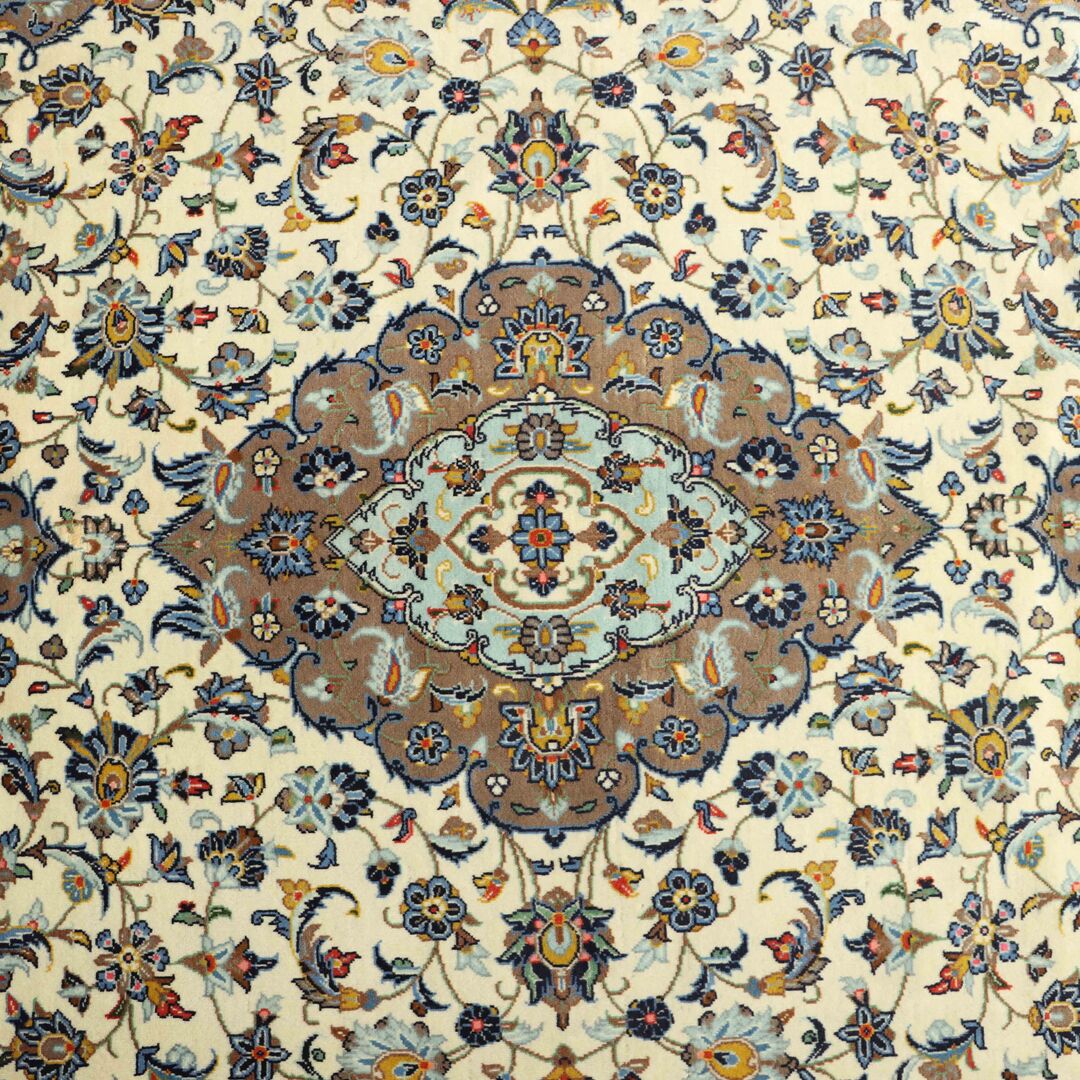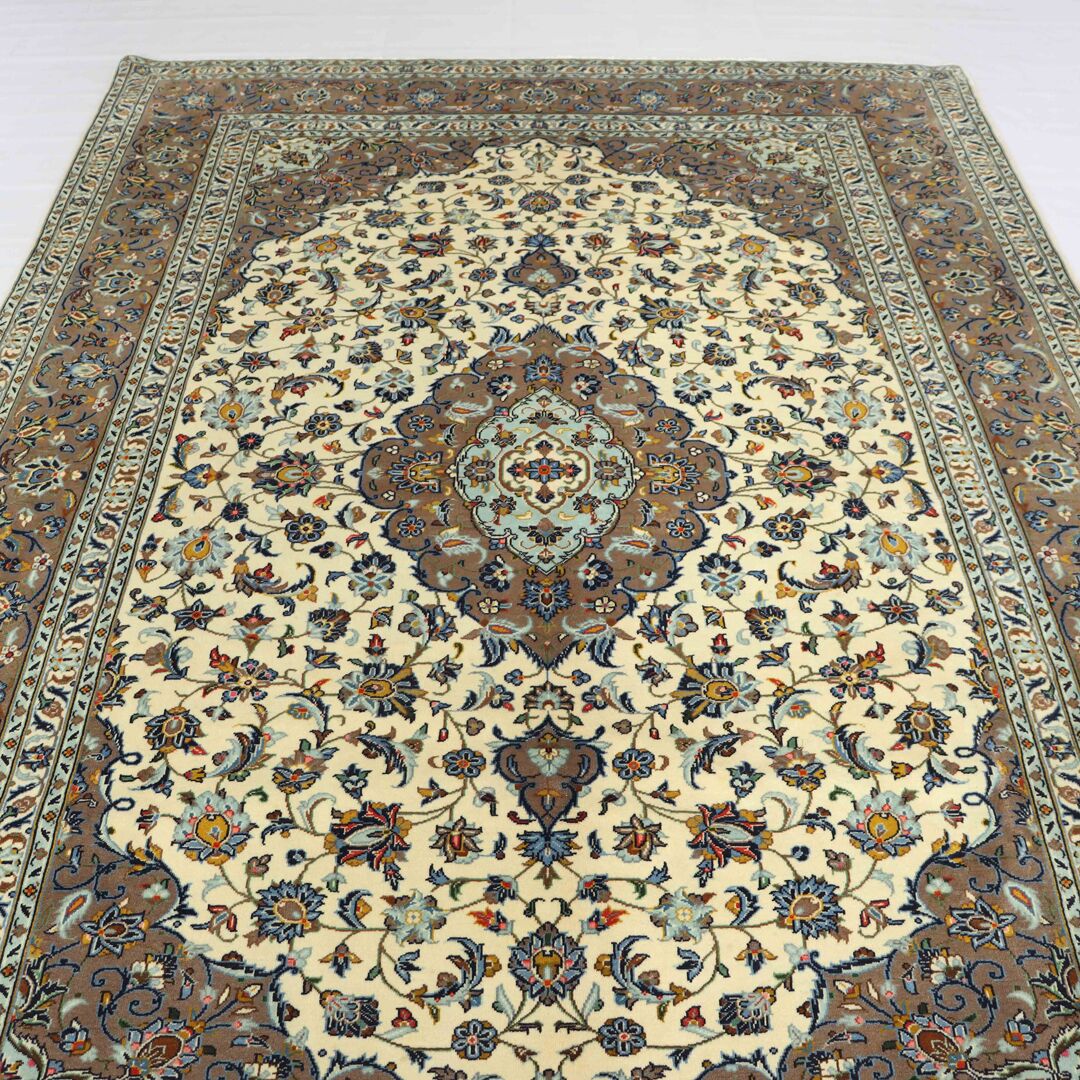 – Timeless Elegance: Immerse your space in the timeless elegance of this certified hand-knotted Persian Kashan rug. A room size authentic handmade piece with a pure lamb’s pile on a cotton base, featuring a classic beige background dyed using traditional methods.