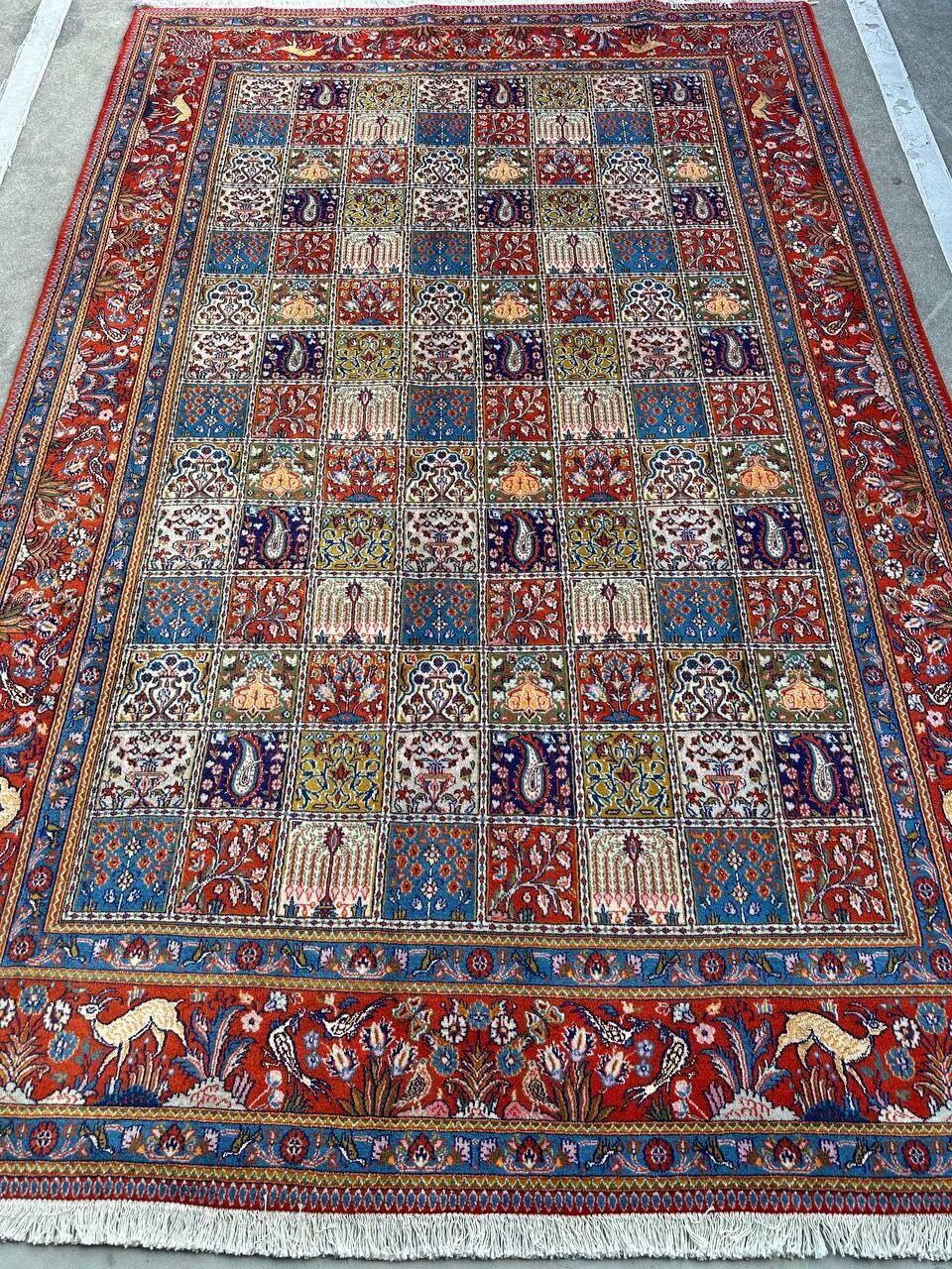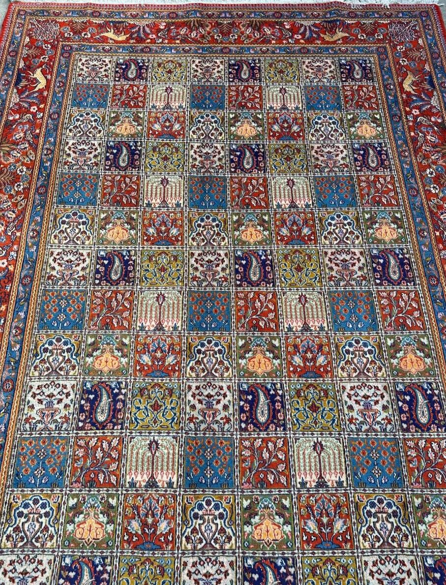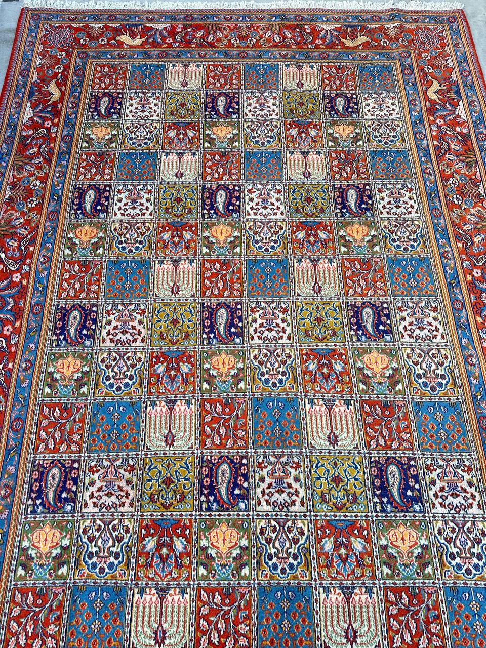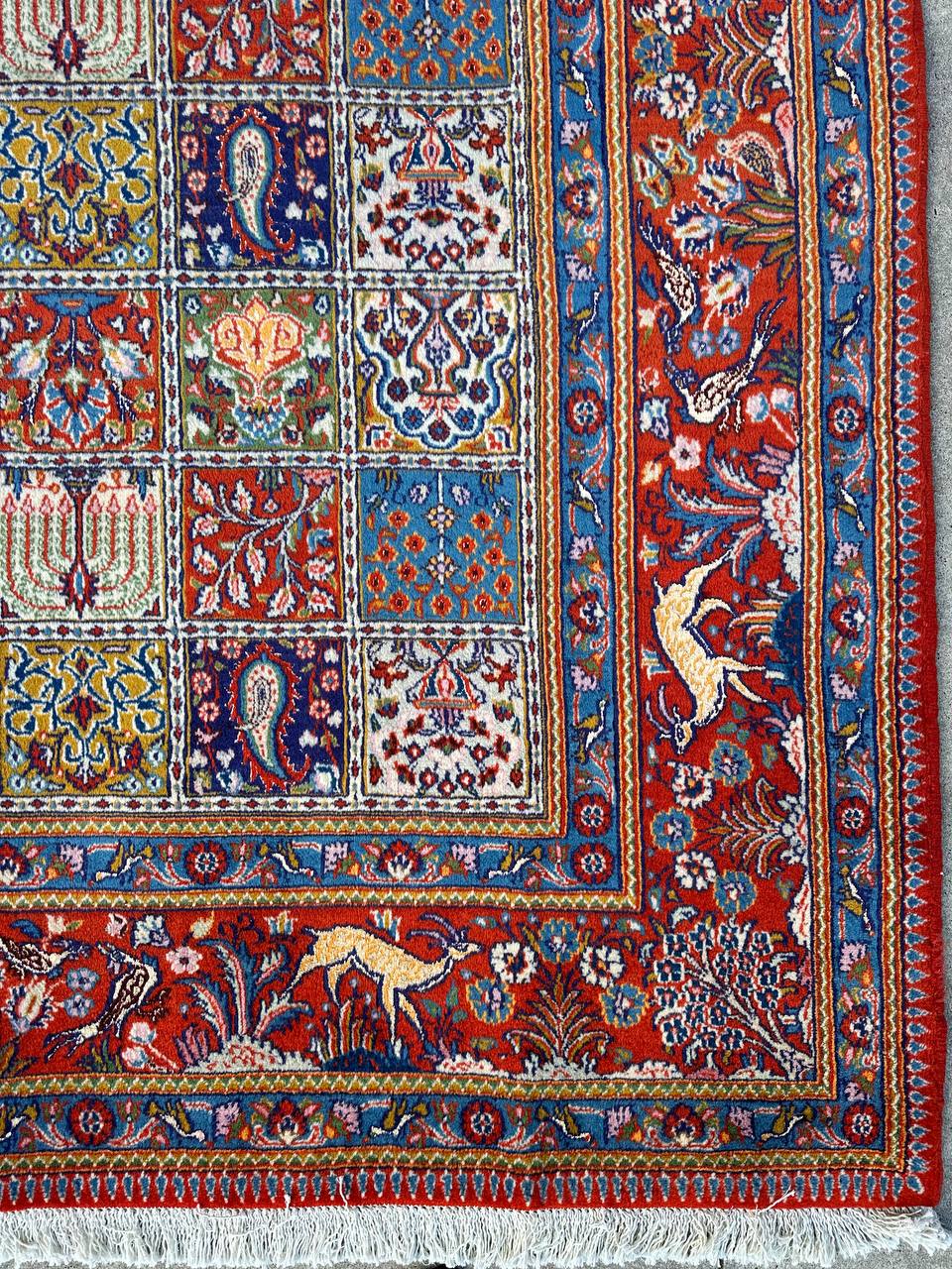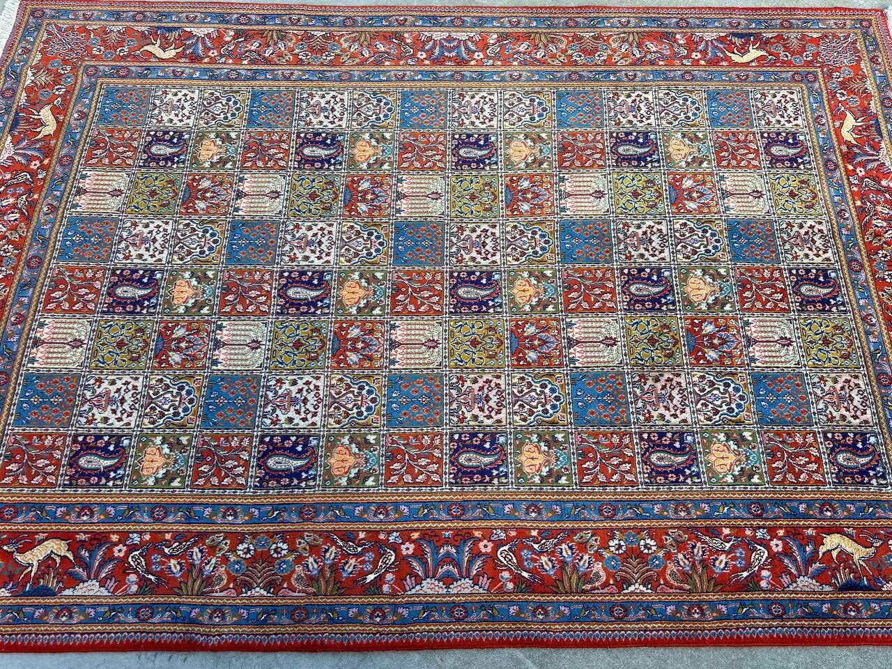– Garden Elegance: Immerse yourself in the exquisite design of this amazing full room size handmade Persian Mood Rug. A rare find, it boasts pure lamb’s wool pile on a fine cotton base, with multi-color tones dyed using traditional methods.