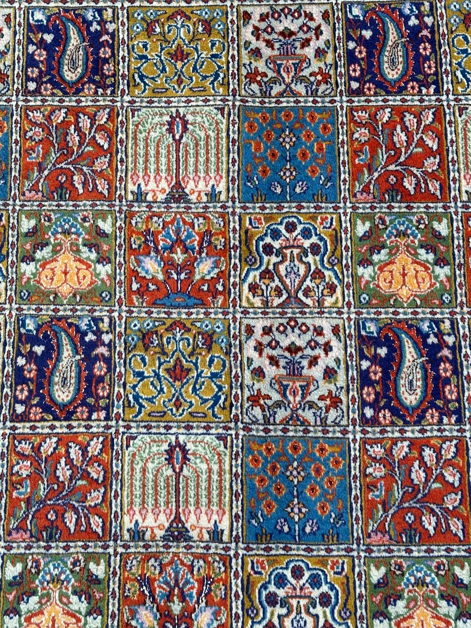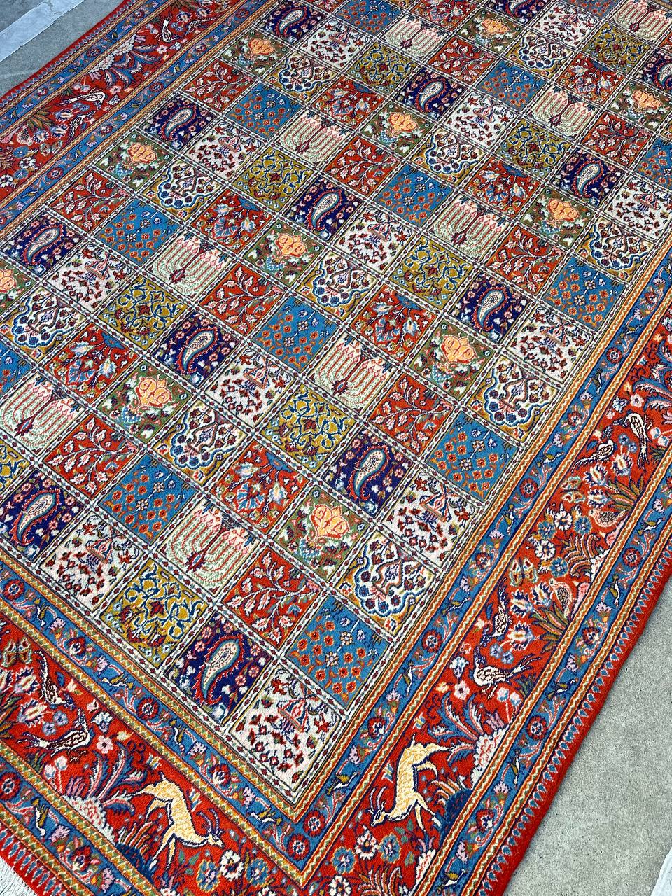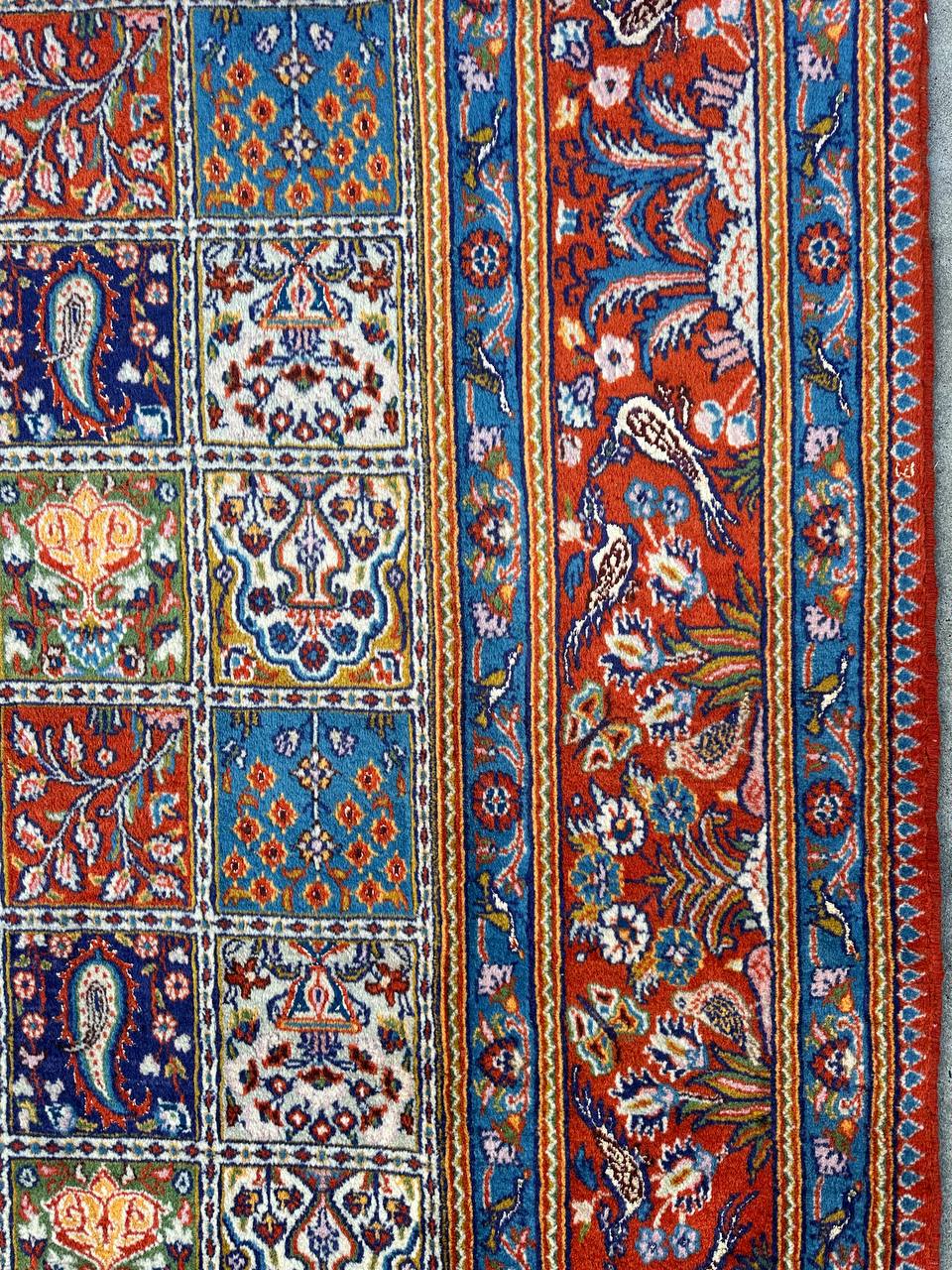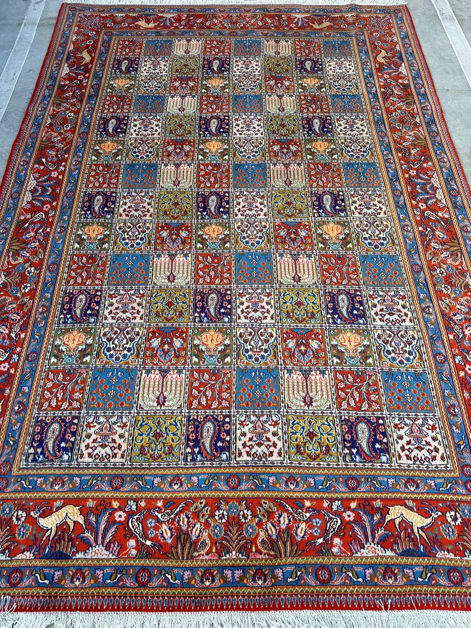– Garden Elegance: Immerse yourself in the exquisite design of this amazing full room size handmade Persian Mood Rug. A rare find, it boasts pure lamb’s wool pile on a fine cotton base, with multi-color tones dyed using traditional methods.