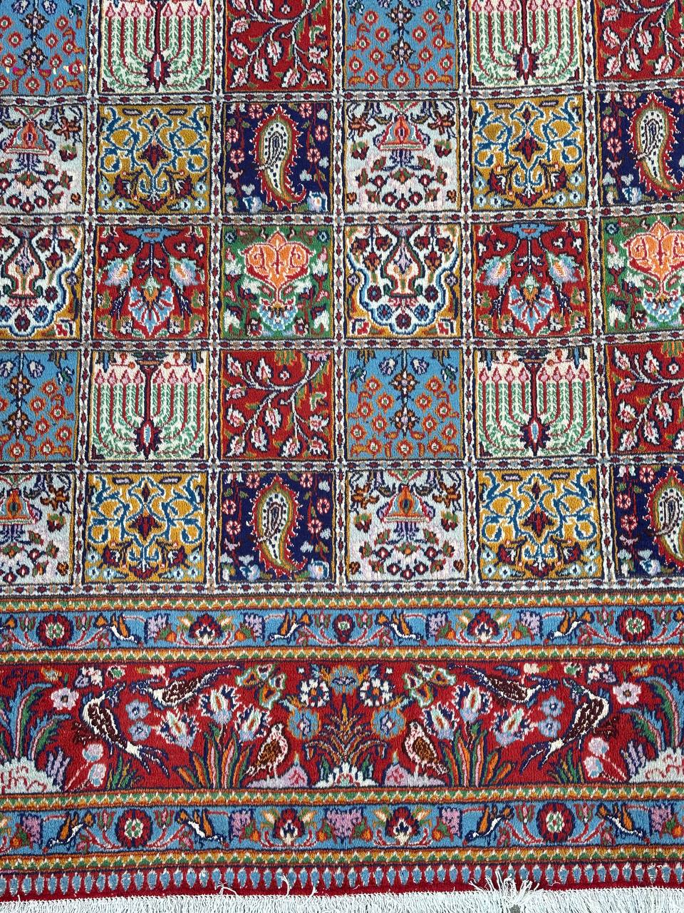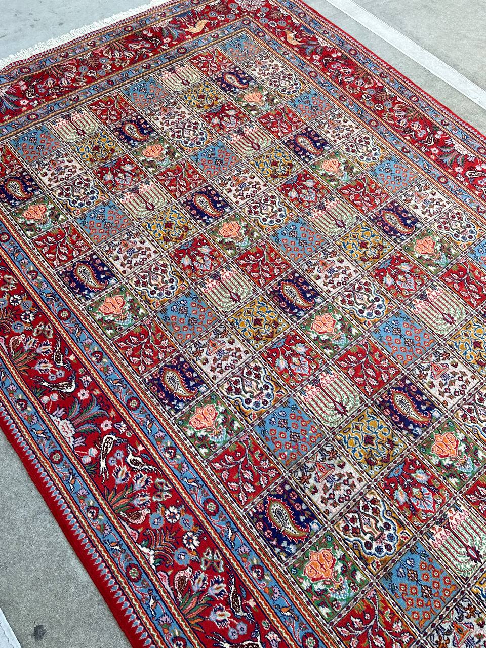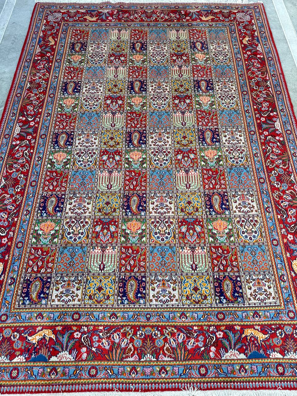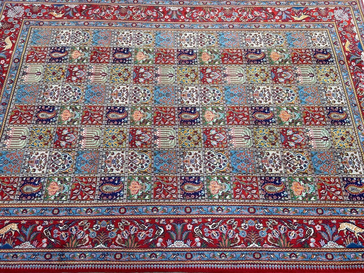– Garden Elegance: Immerse yourself in the exquisite design of this amazing full room size handmade Persian Mood Rug. A rare find, it boasts pure lamb’s wool pile on a fine cotton base, with multi-color tones dyed using traditional methods.