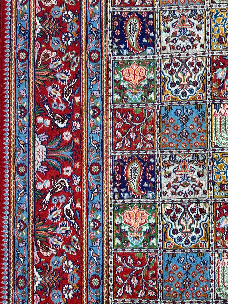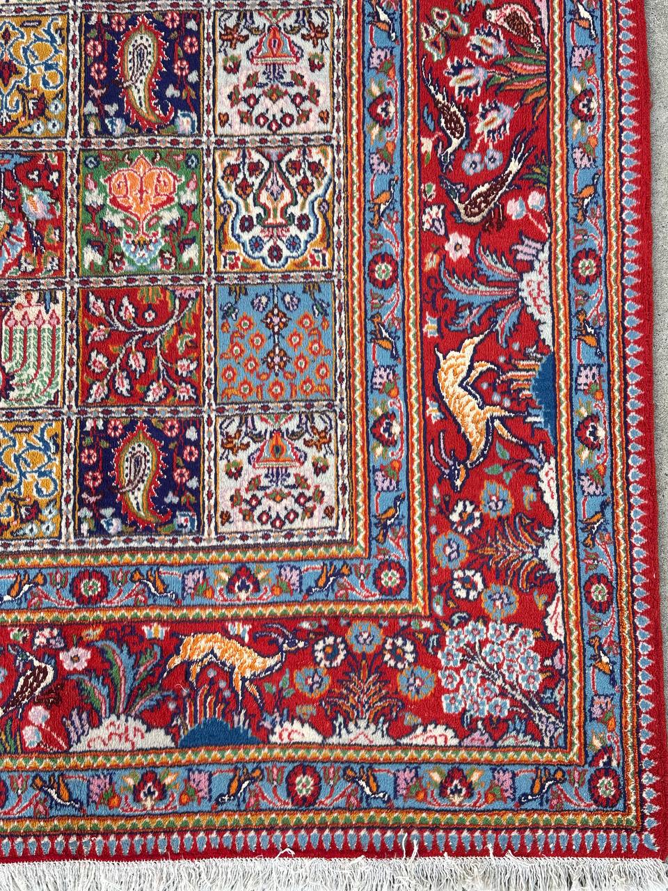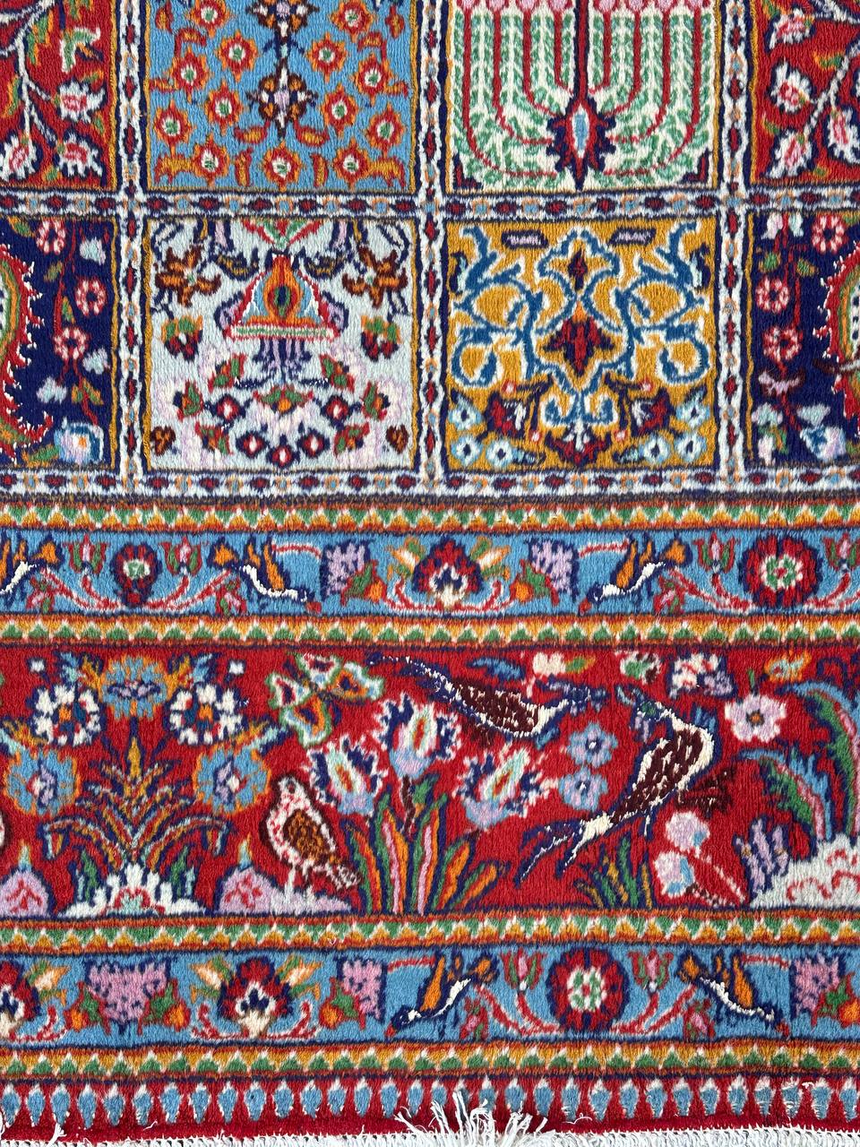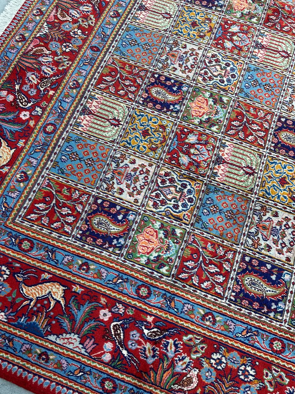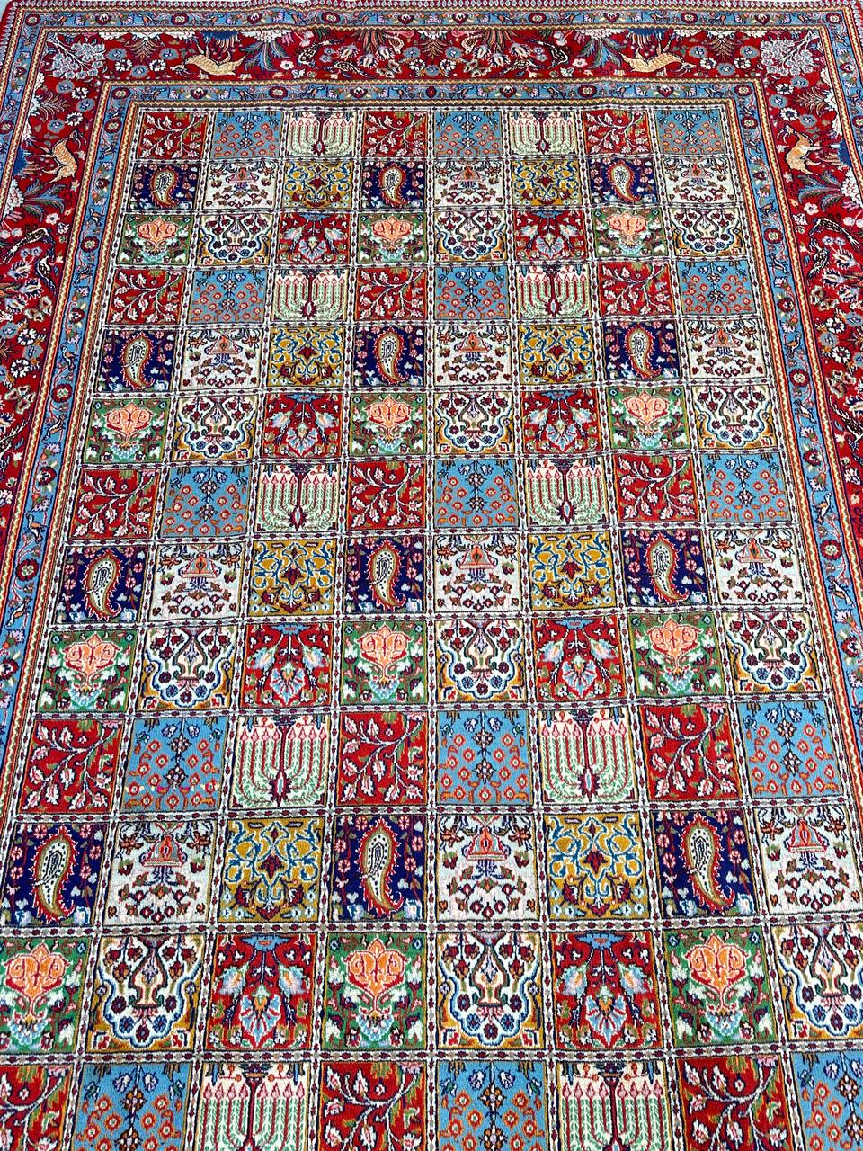 – Garden Elegance: Immerse yourself in the exquisite design of this amazing full room size handmade Persian Mood Rug. A rare find, it boasts pure lamb’s wool pile on a fine cotton base, with multi-color tones dyed using traditional methods.