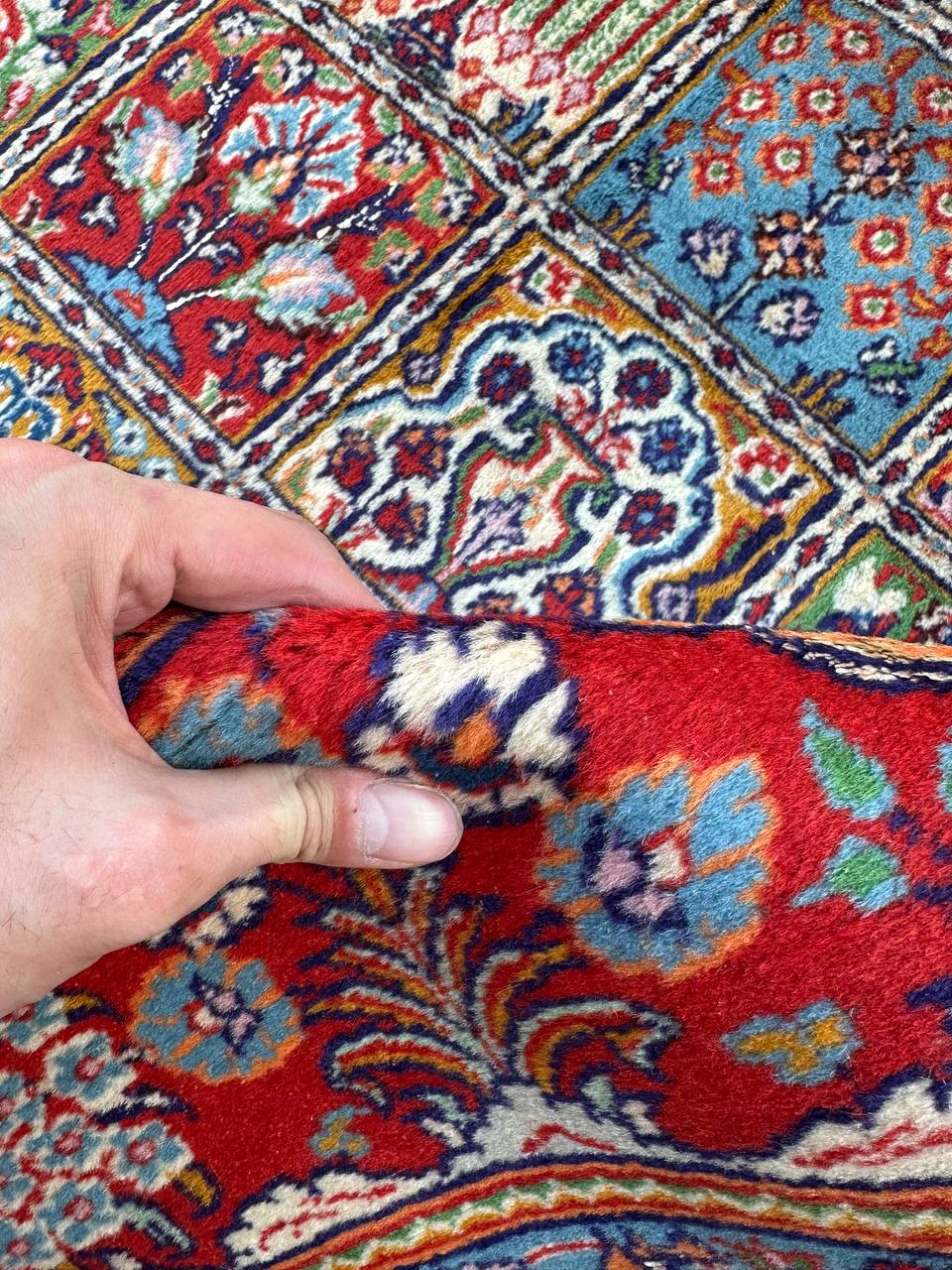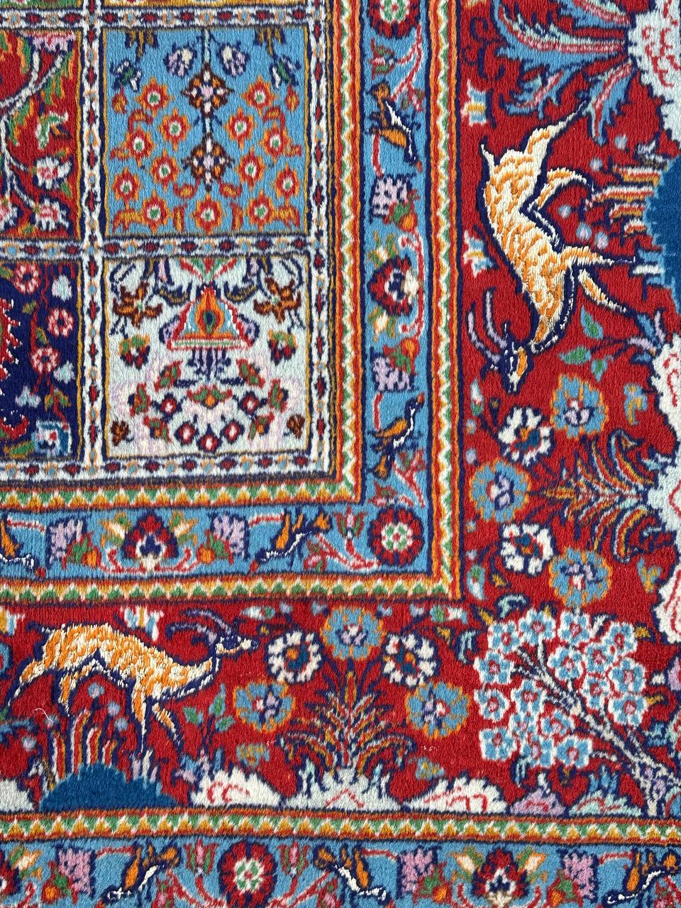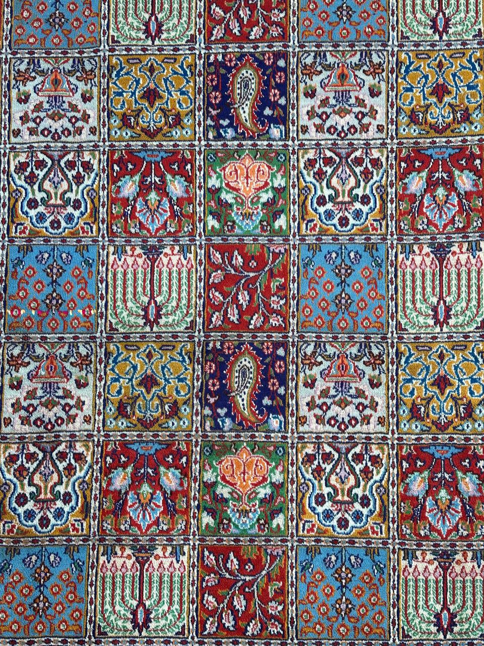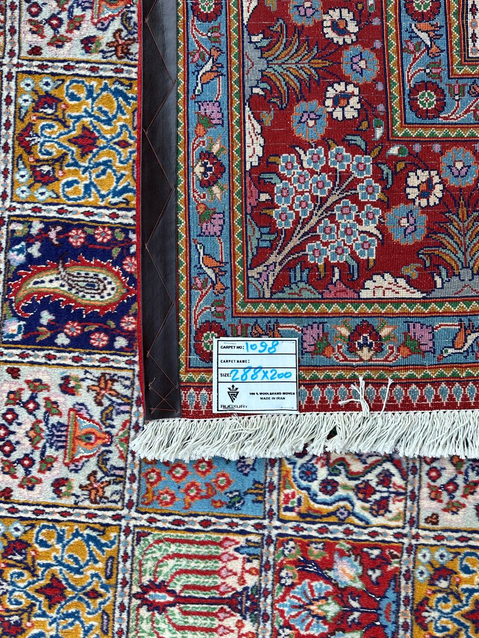 – Garden Elegance: Immerse yourself in the exquisite design of this amazing full room size handmade Persian Mood Rug. A rare find, it boasts pure lamb’s wool pile on a fine cotton base, with multi-color tones dyed using traditional methods.
