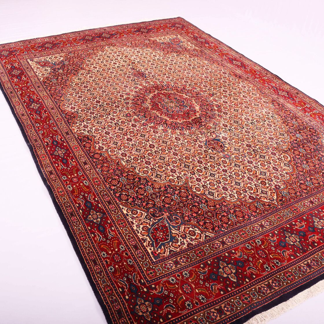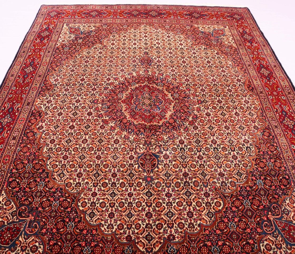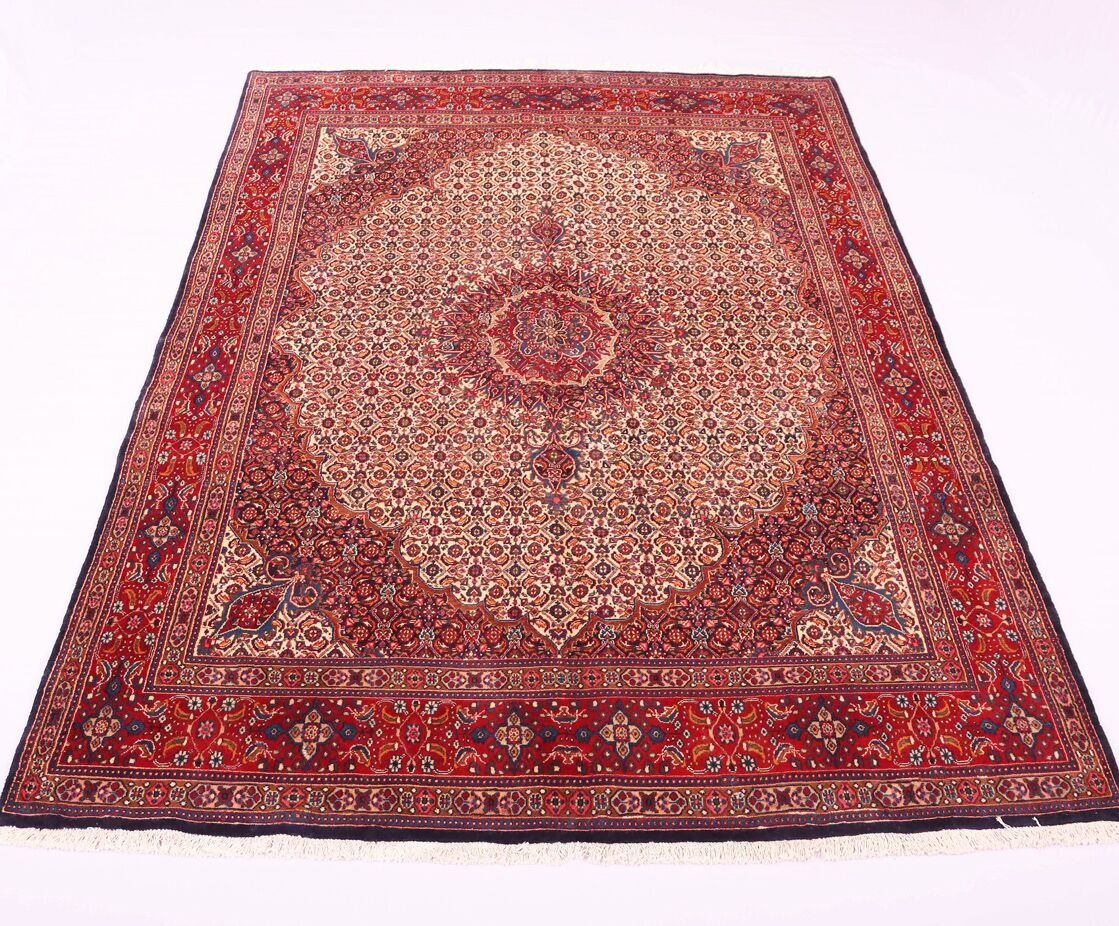 – Timeless Elegance: Immerse your space in the timeless pattern and fine workmanship of this super fine full room size Persian Mood Rug. Pure lamb’s wool pile on a fine cotton base creates a dense quality carpet in beige, blue, and red tones, crafted with traditional methods.