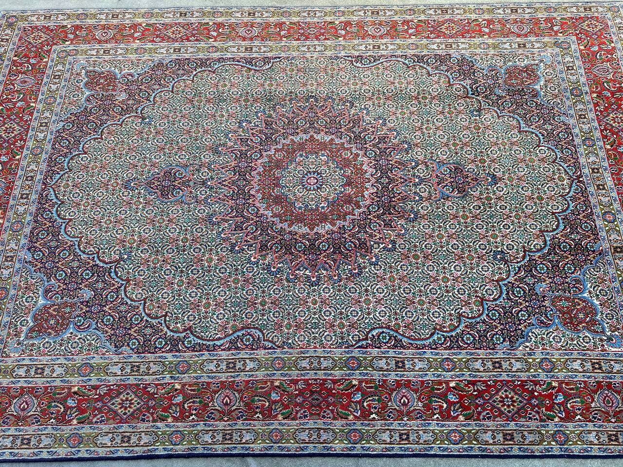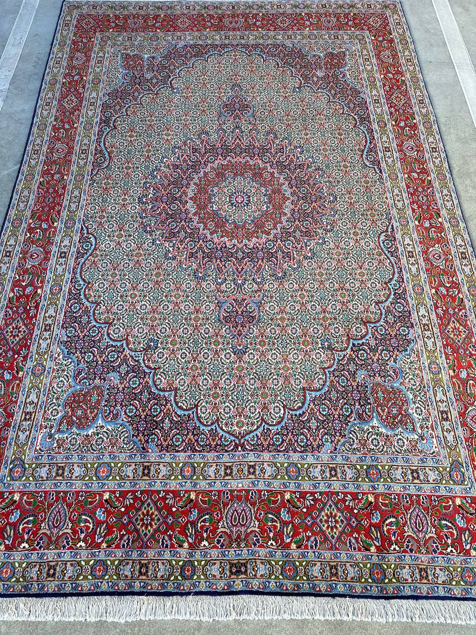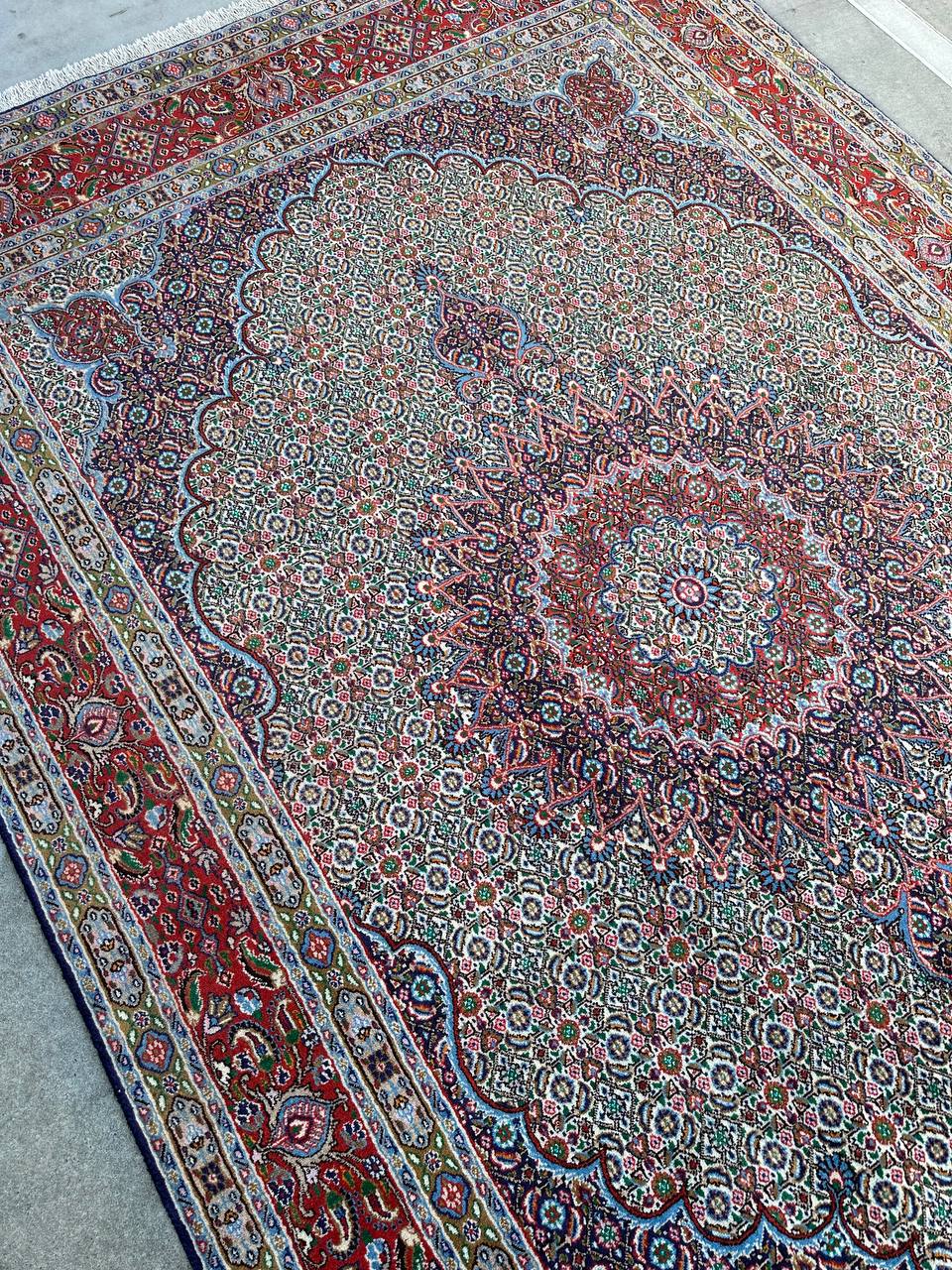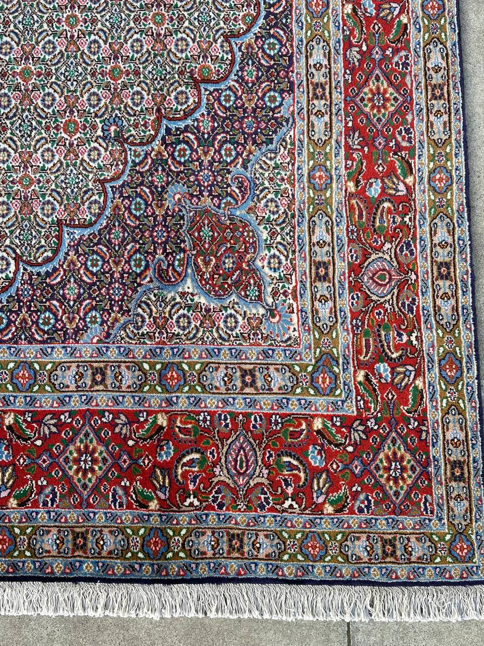 – Timeless Elegance: Immerse yourself in the timeless pattern and fine workmanship of this super fine full room size Persian Mood Rug. Pure lamb’s wool pile on a fine cotton base creates a dense quality carpet in beige, blue, and red tones, crafted with traditional methods.