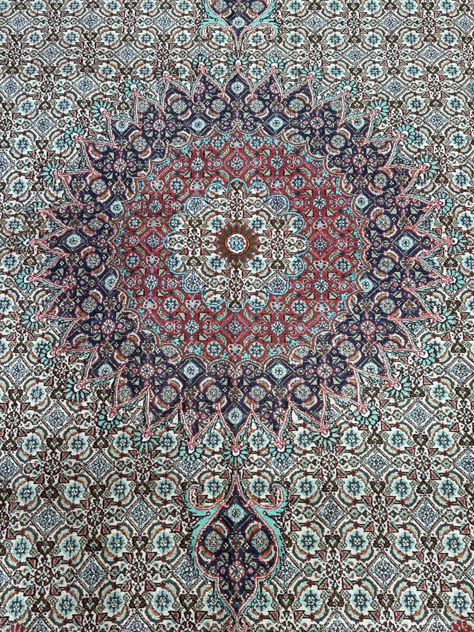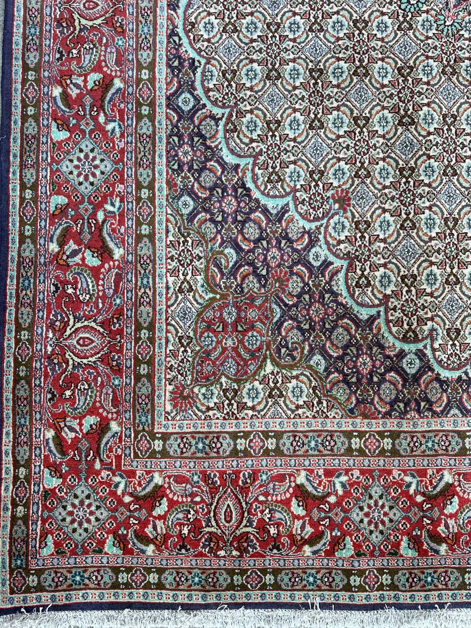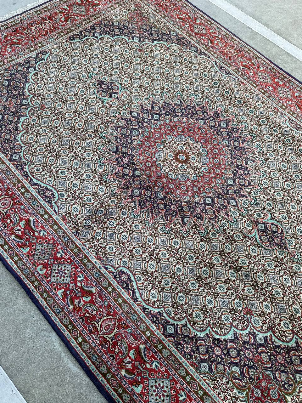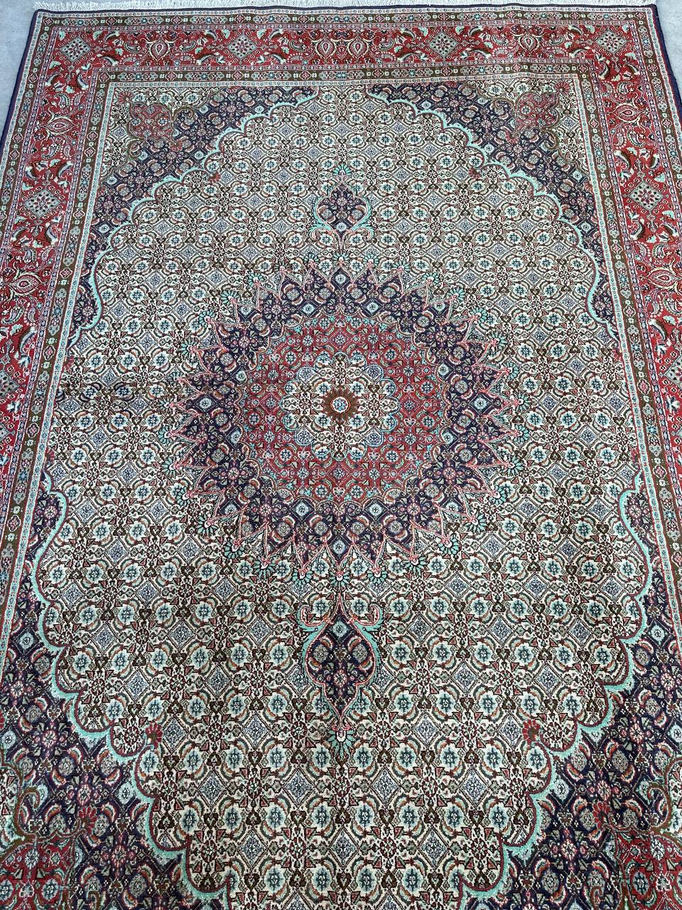 – Timeless Elegance: Immerse your space in the timeless pattern and fine workmanship of this super fine full room size Persian Mood Rug. Pure lamb’s wool pile on a fine cotton base creates a dense quality carpet in beige, blue, and red tones, crafted with traditional methods.