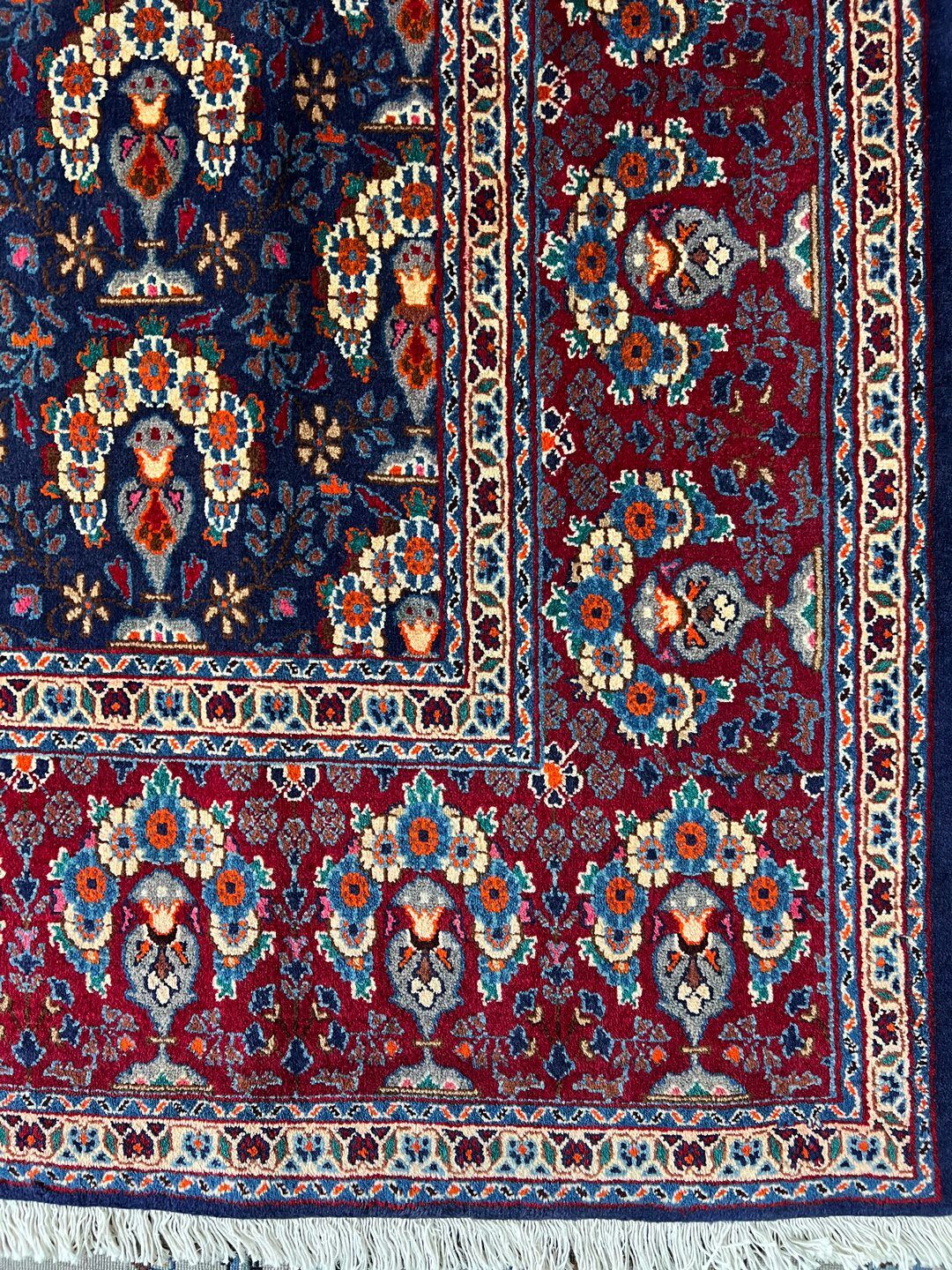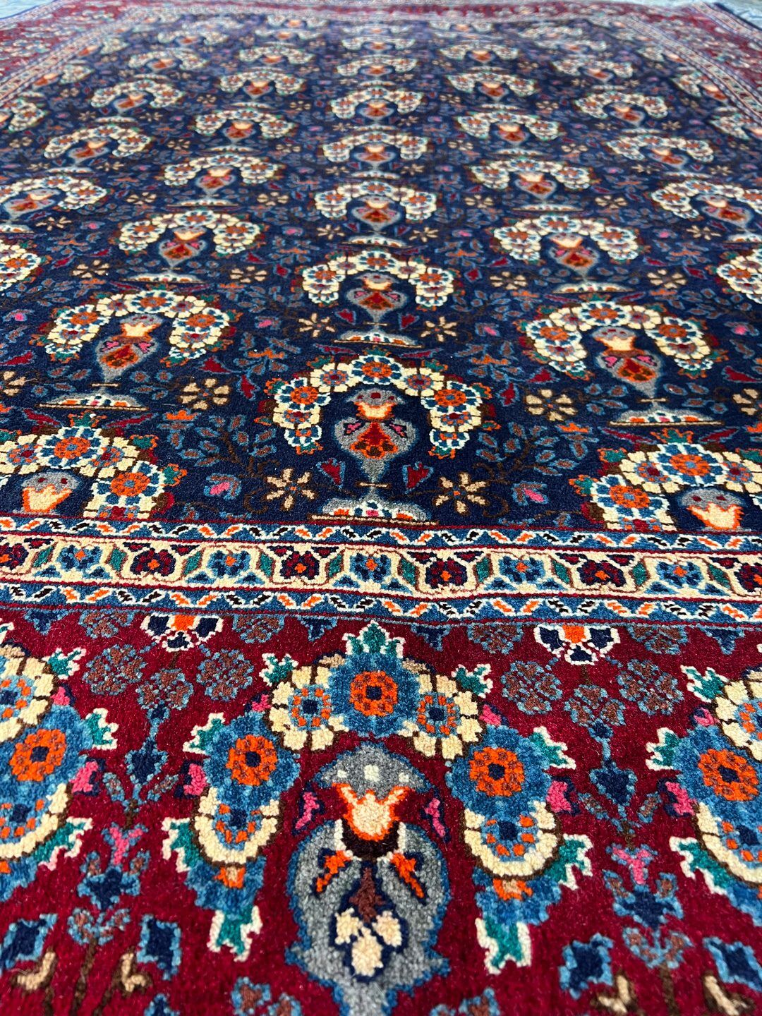 • Exceptional Craftsmanship: Handmade Mood Birjand Rug, a rare gem in larger sizes. Crafted with a pure lamb’s wool pile on fine cotton, featuring indigo blue, beige, maroon, and green tones dyed using traditional methods.