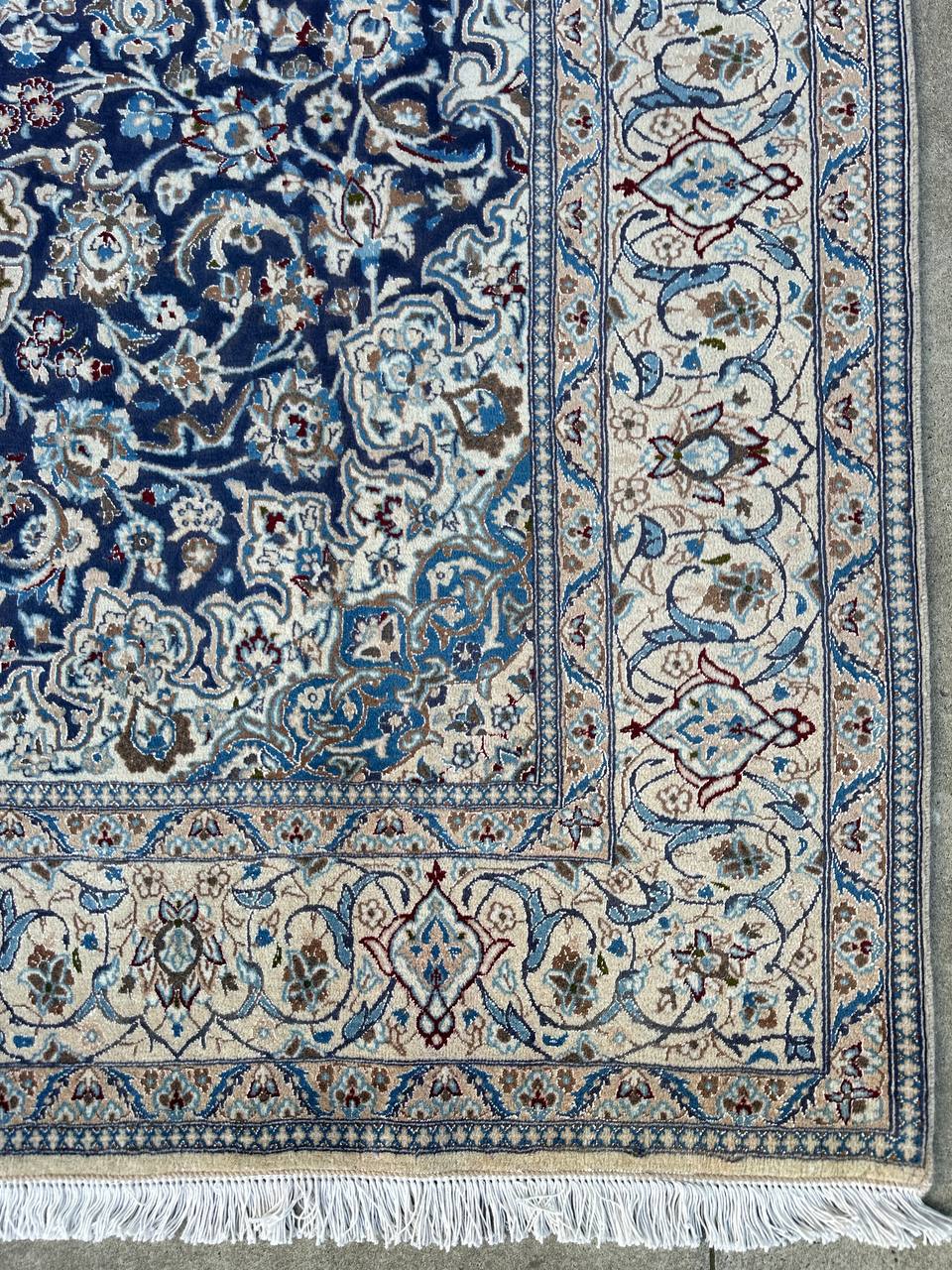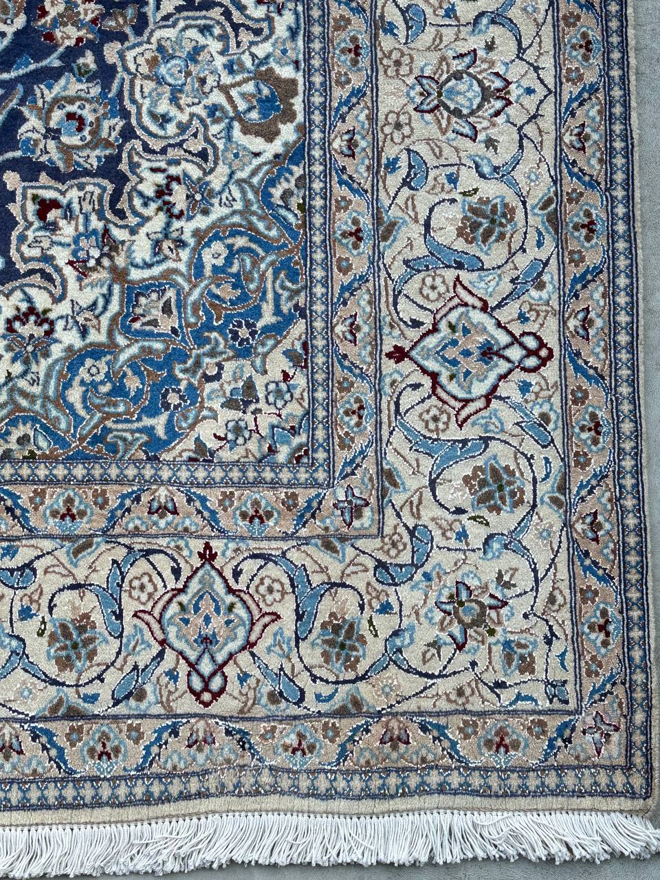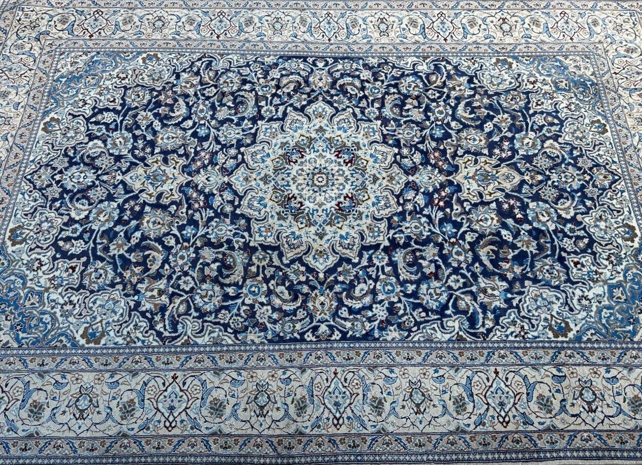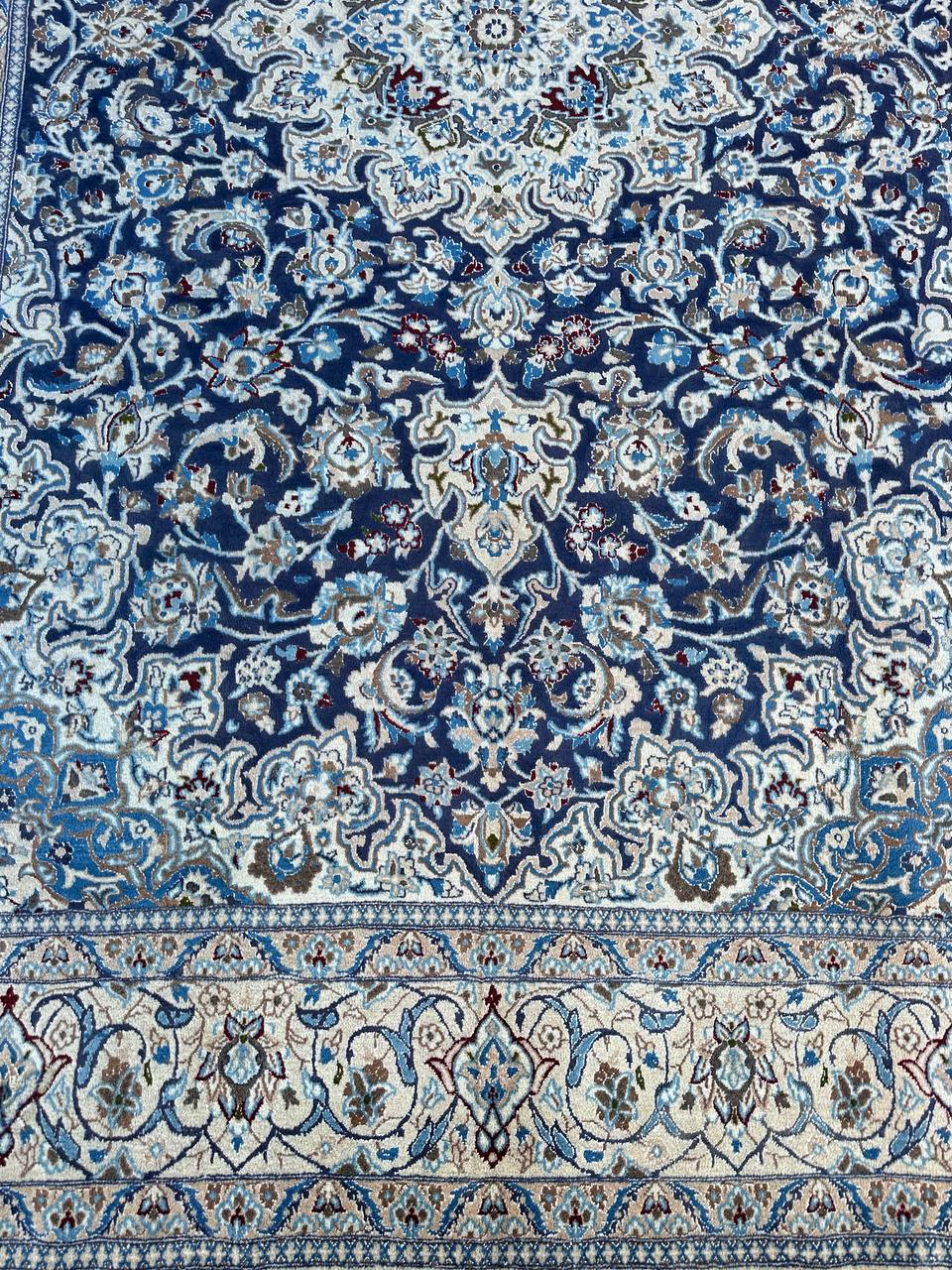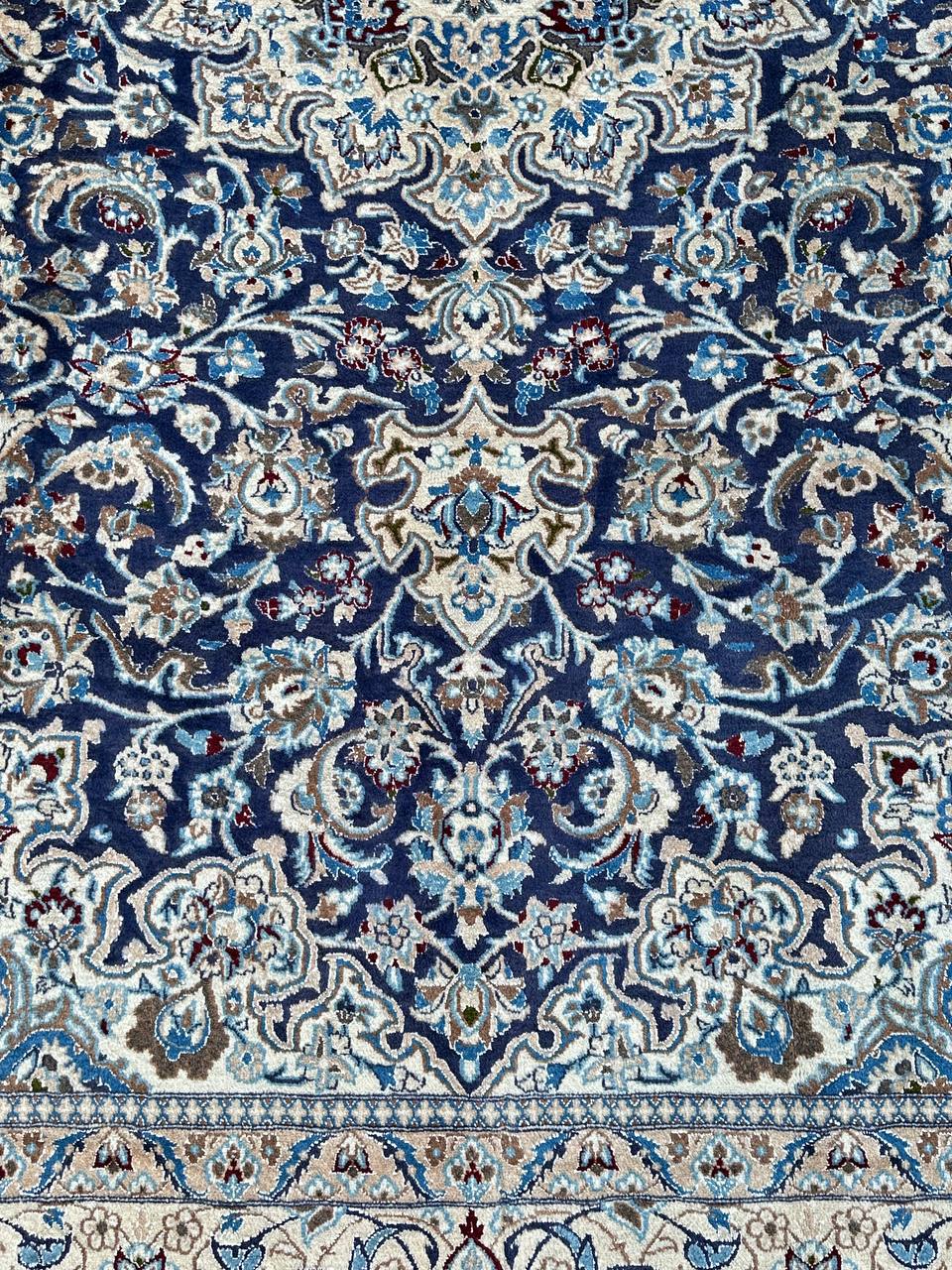 – Elegance Redefined: Immerse your space in the exquisite design of this room-size authentic Persian Nain carpet. Lamb’s wool and silkinlay pile on a cotton base create a luxurious feel, with French blue tones dyed using traditional methods.