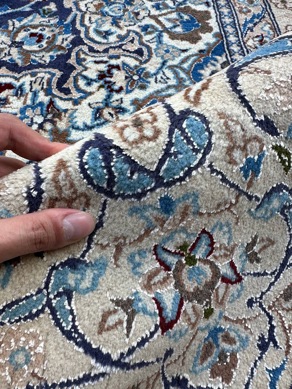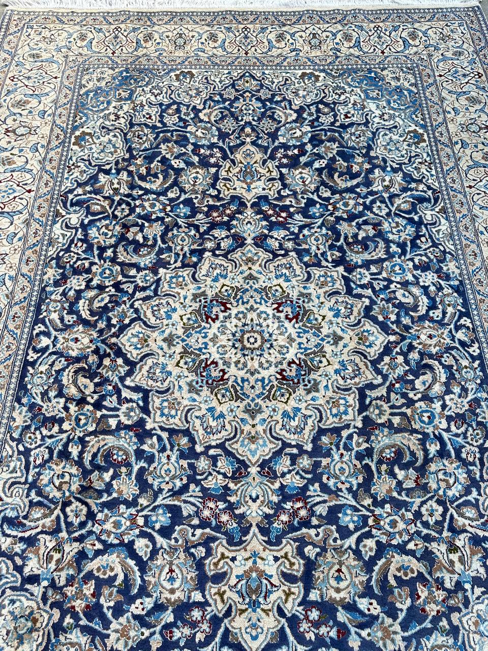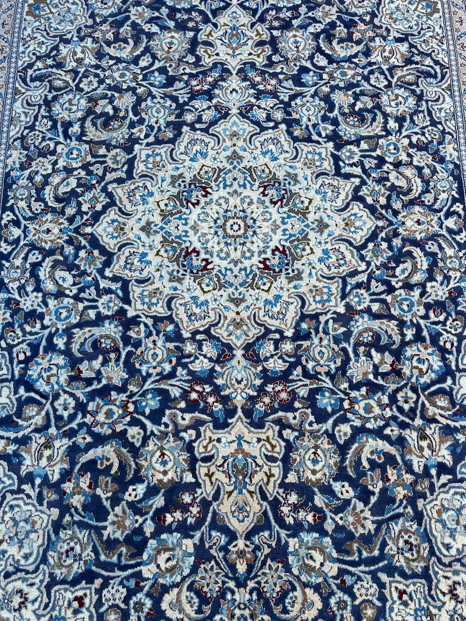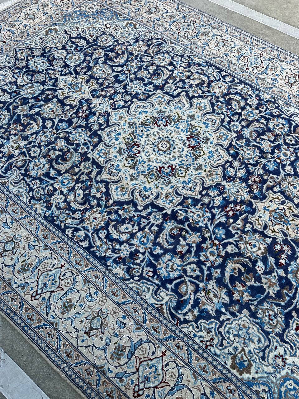 – Elegance Redefined: Immerse your space in the exquisite design of this room-size authentic Persian Nain carpet. Lamb’s wool and silkinlay pile on a cotton base create a luxurious feel, with French blue tones dyed using traditional methods.