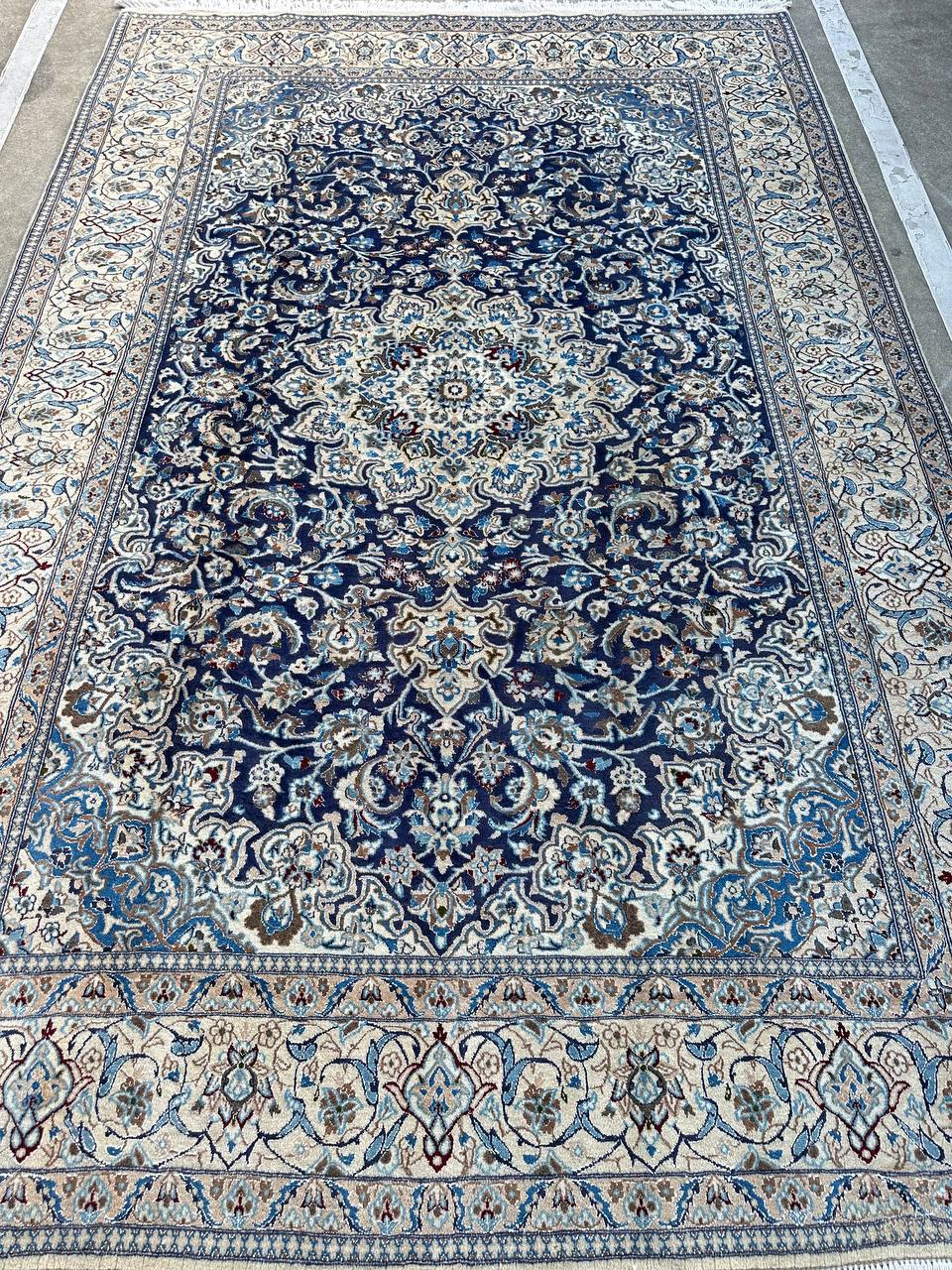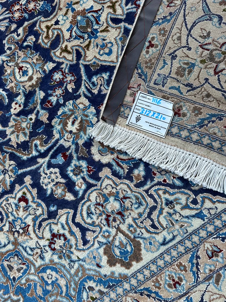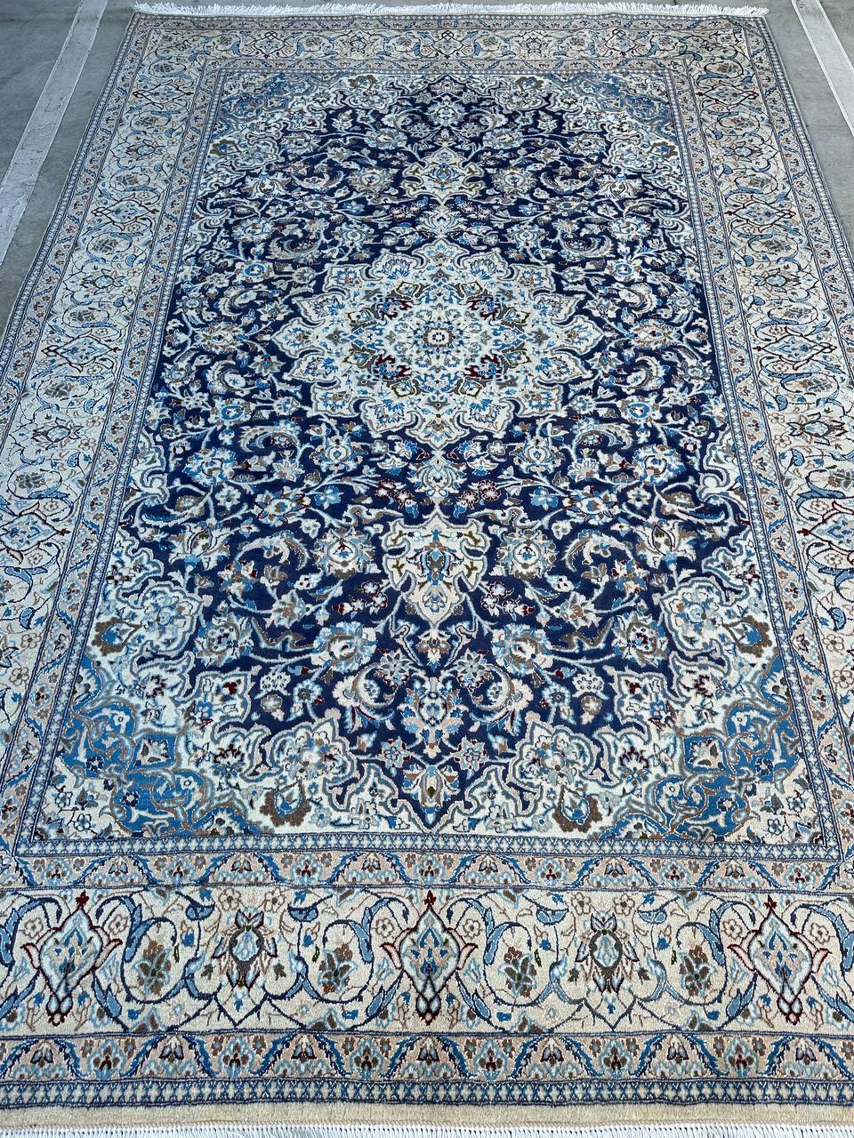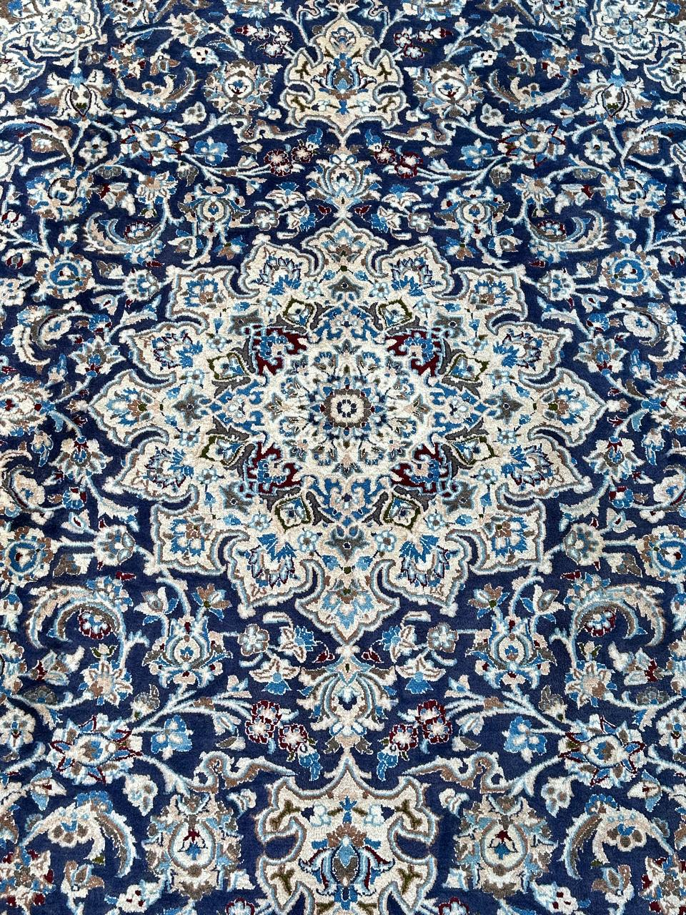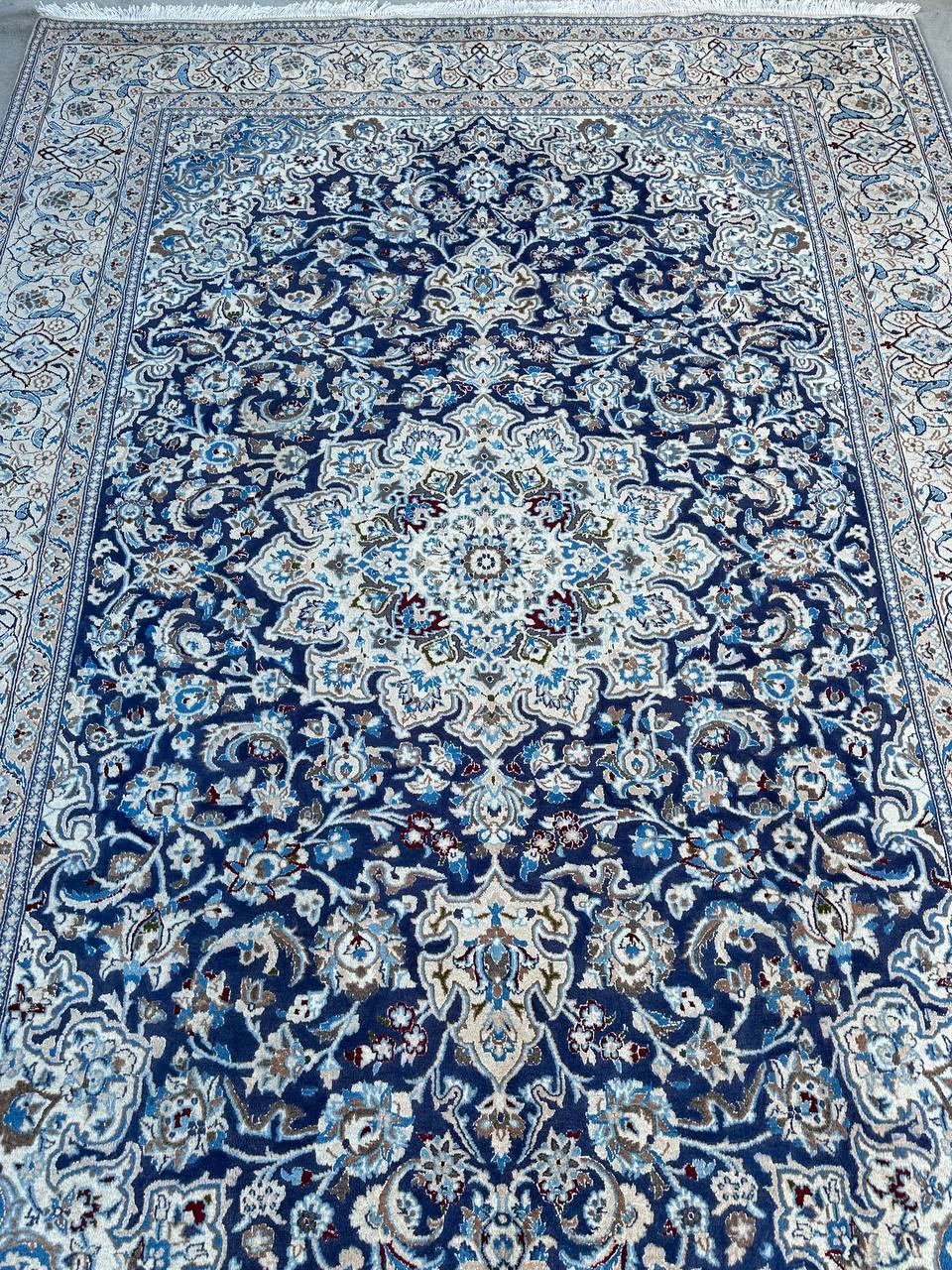 – Elegance Redefined: Immerse your space in the exquisite design of this room-size authentic Persian Nain carpet. Lamb’s wool and silkinlay pile on a cotton base create a luxurious feel, with French blue tones dyed using traditional methods.