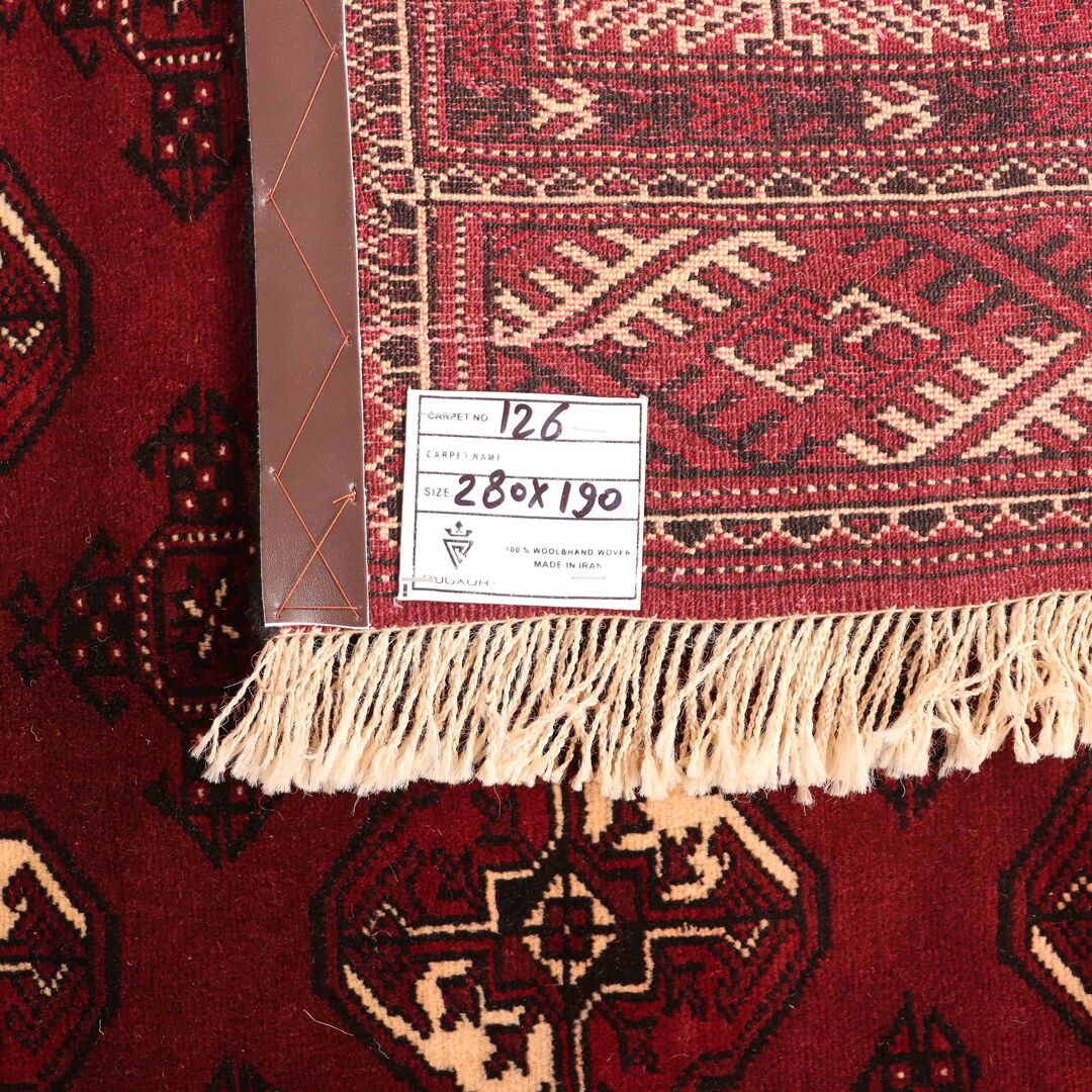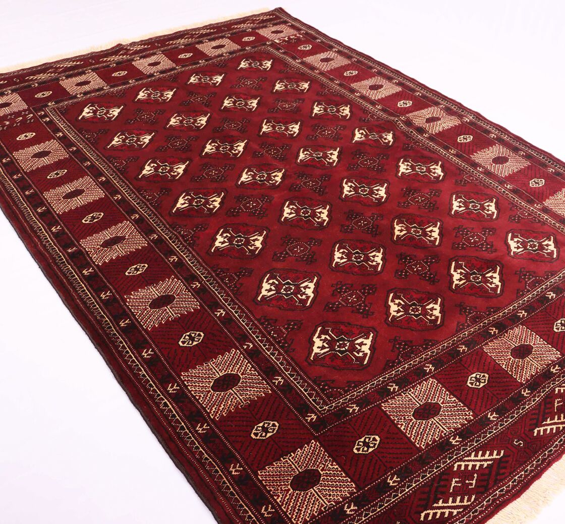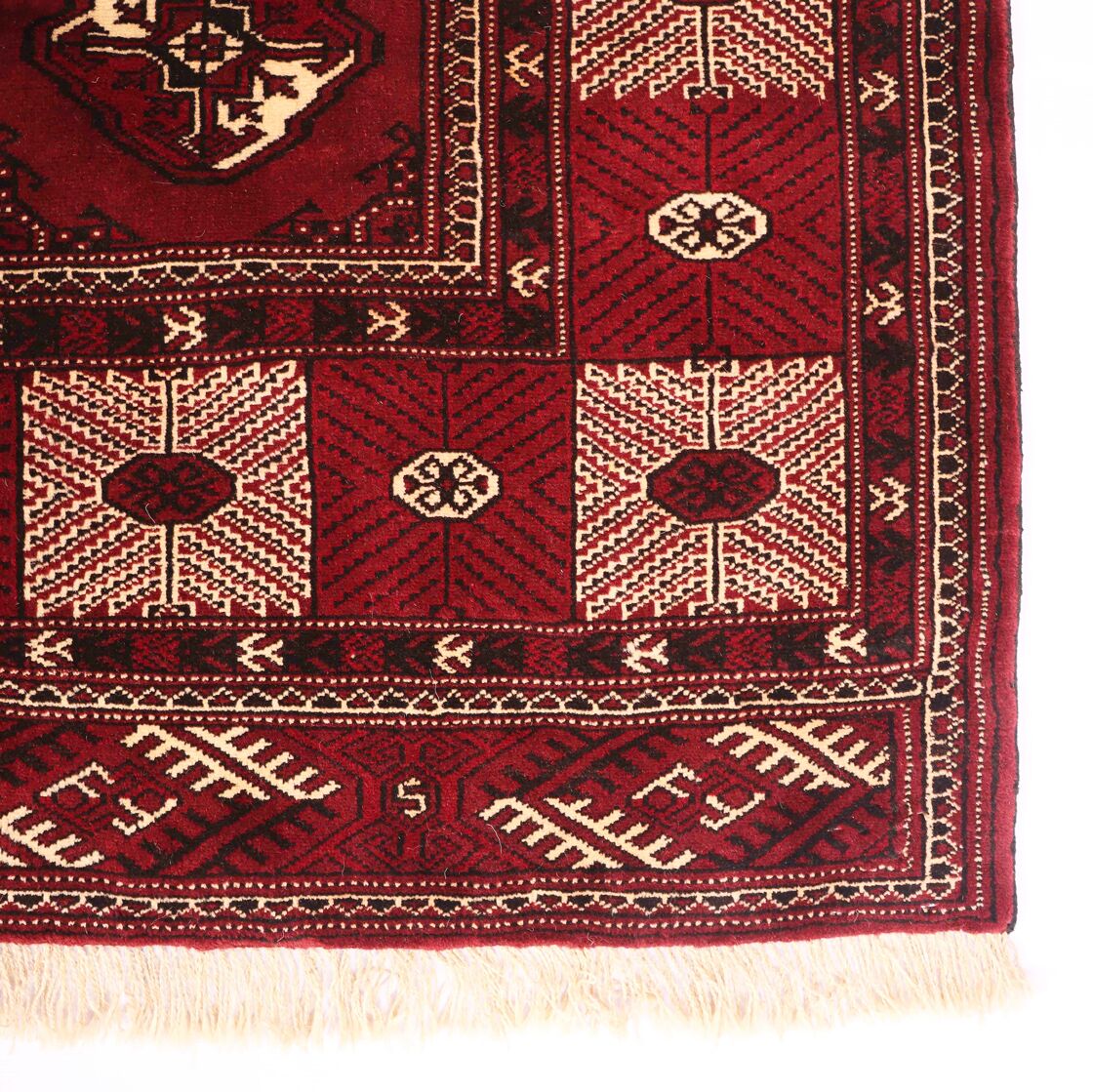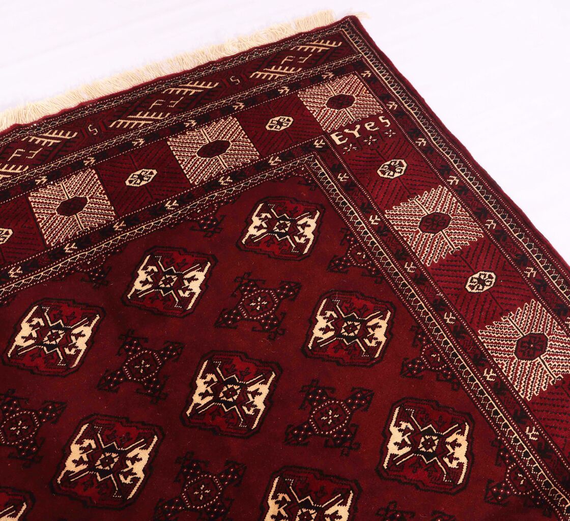 Room Size Bokhara Design Hand Woven Wool Turkoman Rug. Above All It Has A Pure Hand Spun Wool Pile On Cotton Base. Beautiful Red Tone Dyed Using Traditional Methods.
