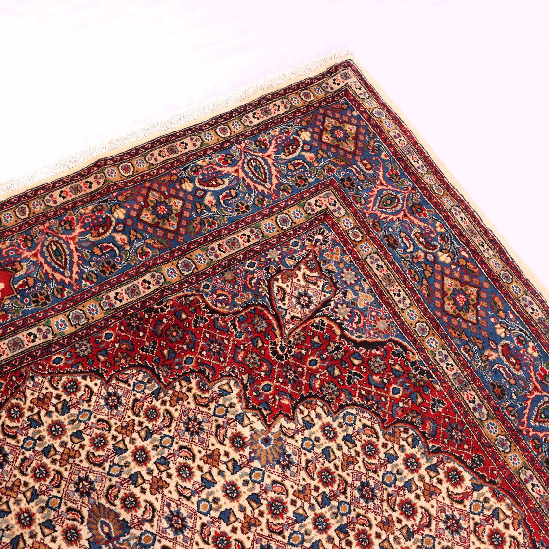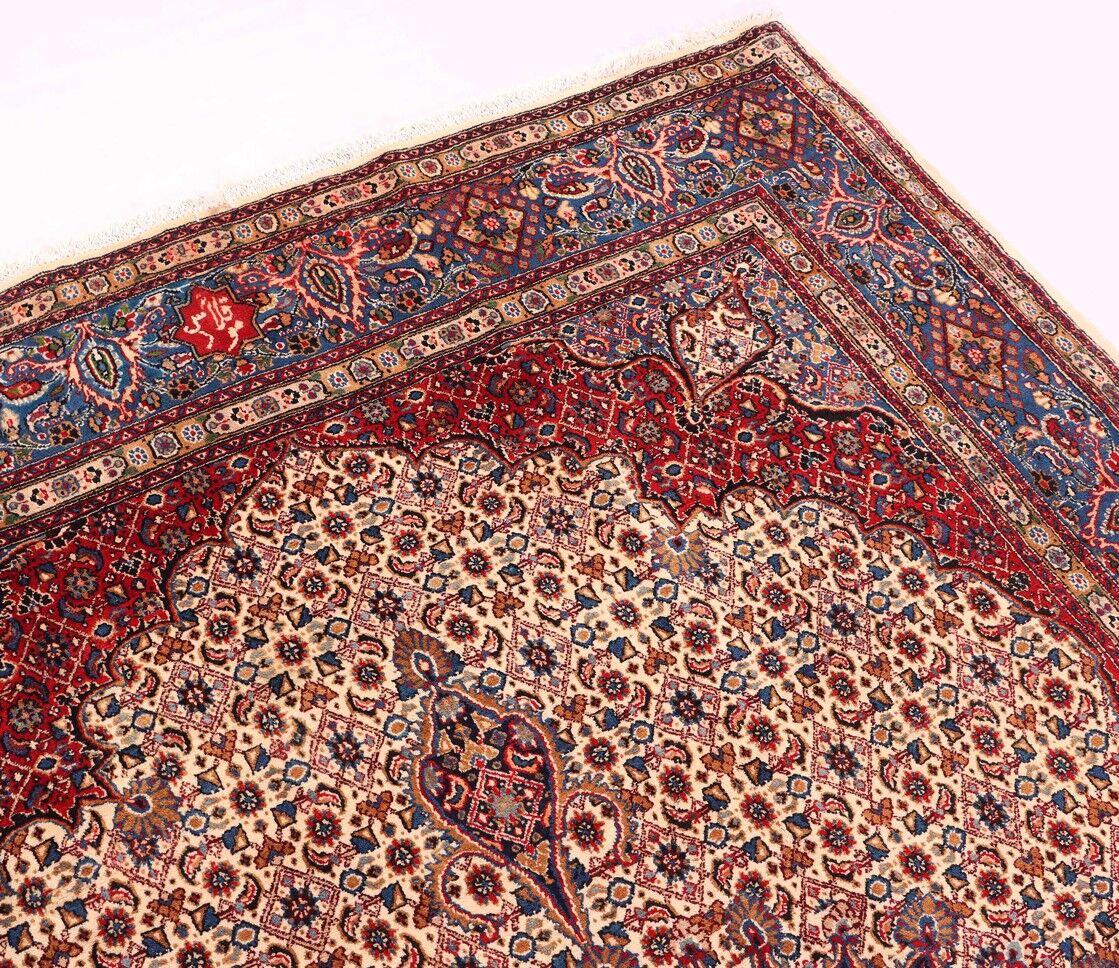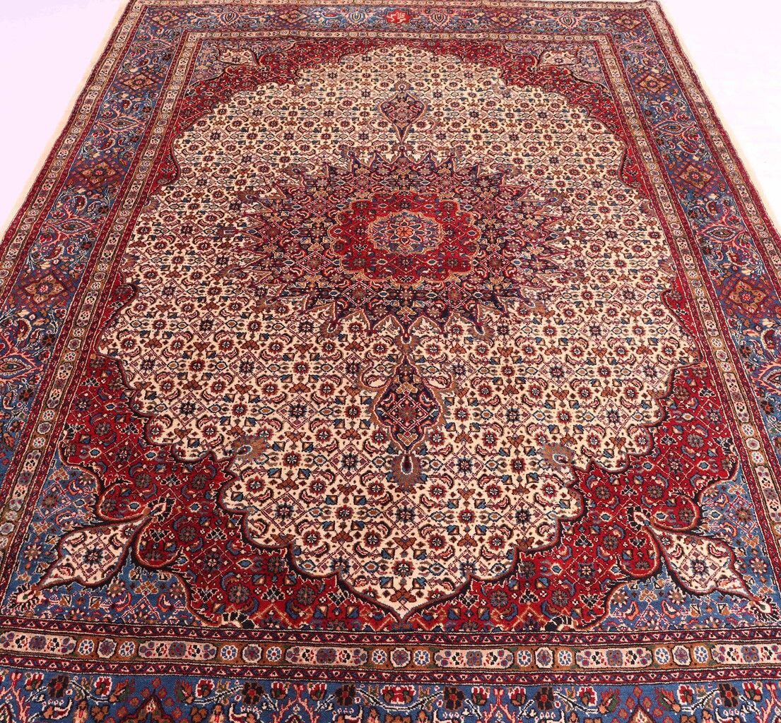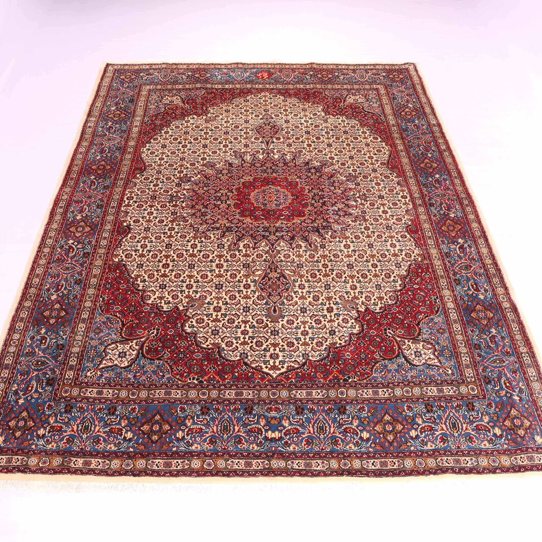 – Timeless Elegance: Immerse your space in the timeless pattern and fine workmanship of this super fine full room size Persian Mood Rug. Pure lamb’s wool pile on a fine cotton base creates a dense quality carpet in beige, blue, and red tones, crafted with traditional methods.