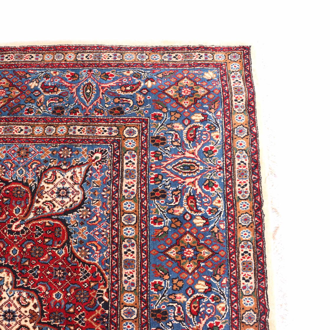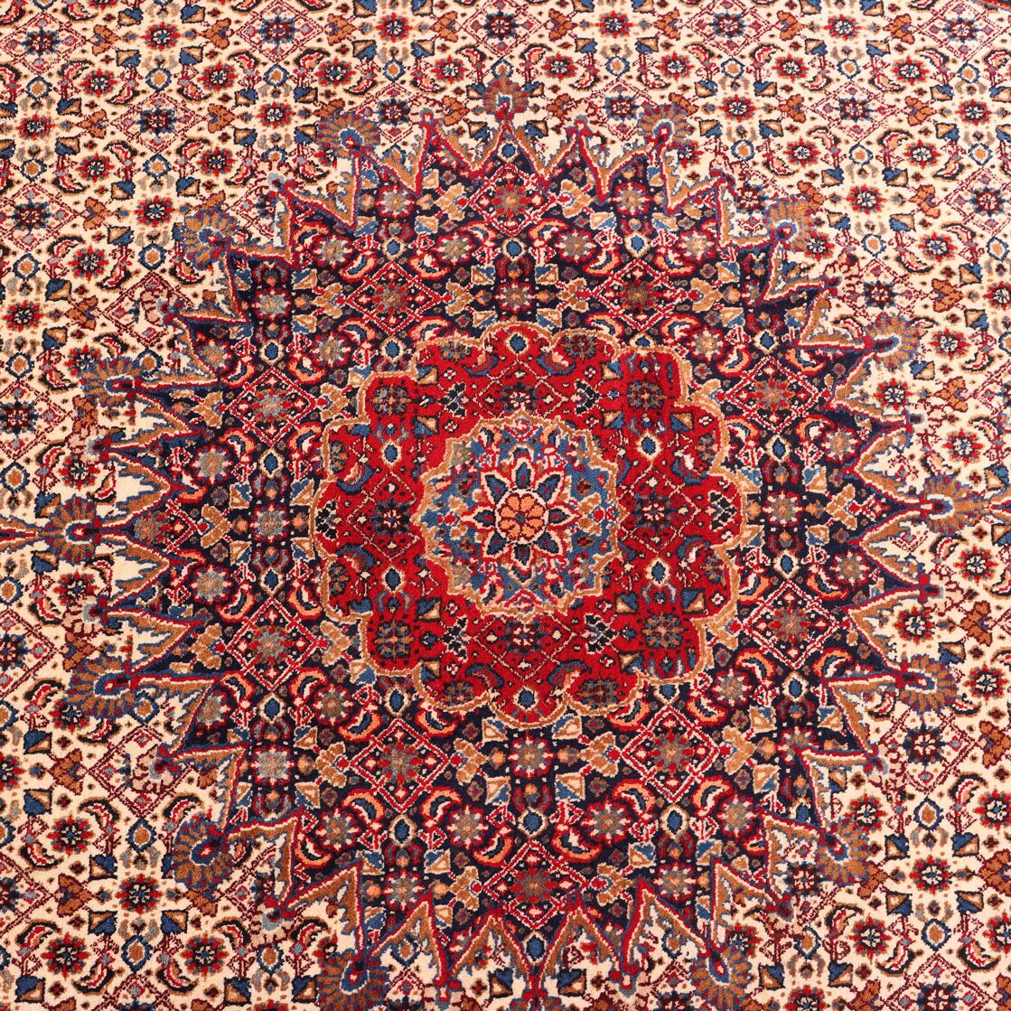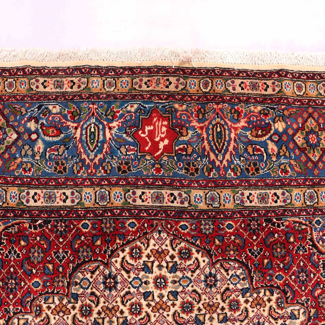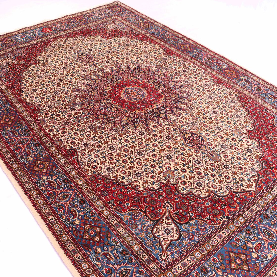 – Timeless Elegance: Immerse your space in the timeless pattern and fine workmanship of this super fine full room size Persian Mood Rug. Pure lamb’s wool pile on a fine cotton base creates a dense quality carpet in beige, blue, and red tones, crafted with traditional methods.