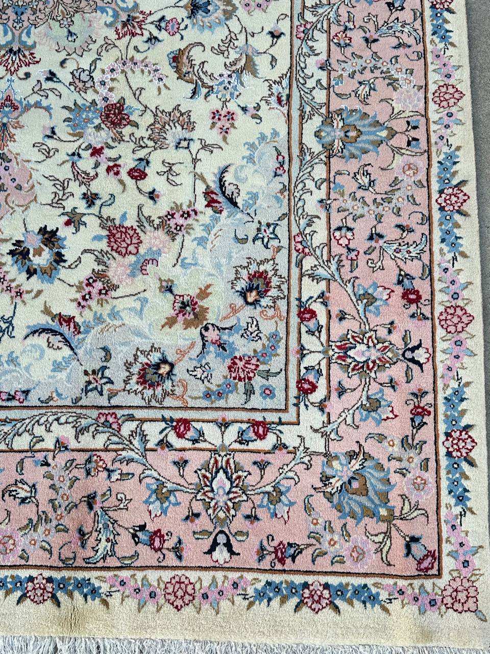 – Superb Quality Craftsmanship: Elevate your space with this certified hand-knotted Persian Kashmar wool rug, a masterpiece in room size authenticity. This hard-to-find, larger size rug features a pure lamb’s wool pile on a cotton base, dyed in beige and salmon pink using traditional methods.