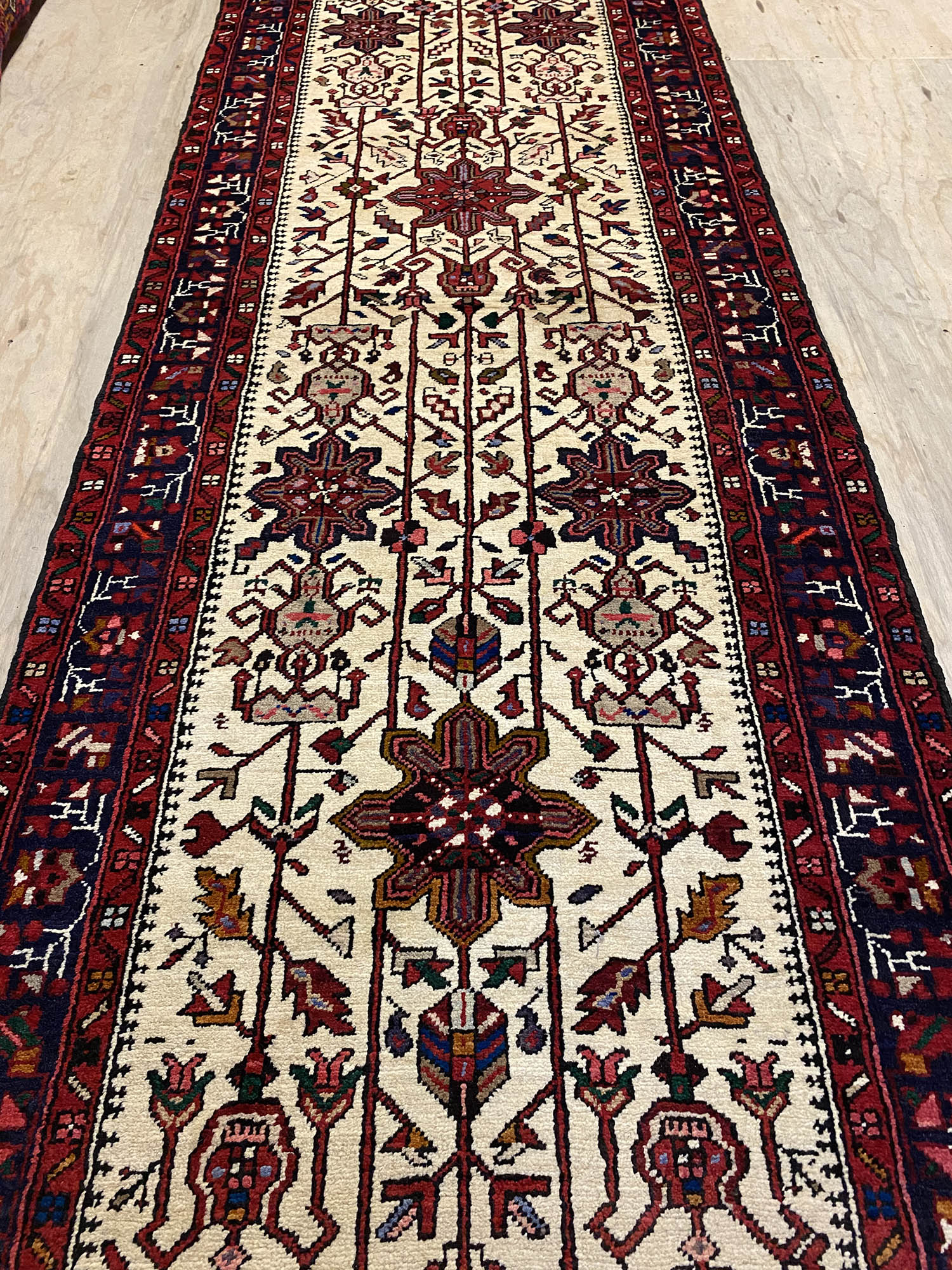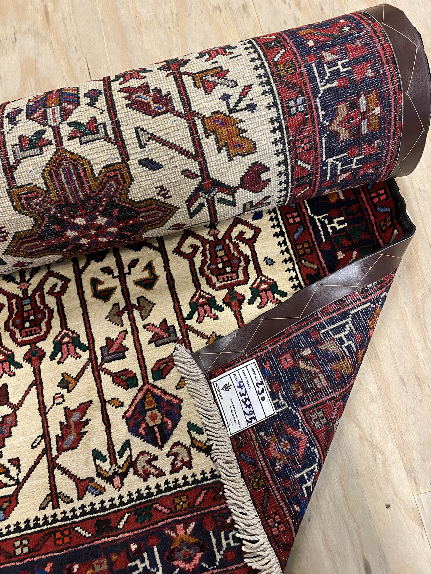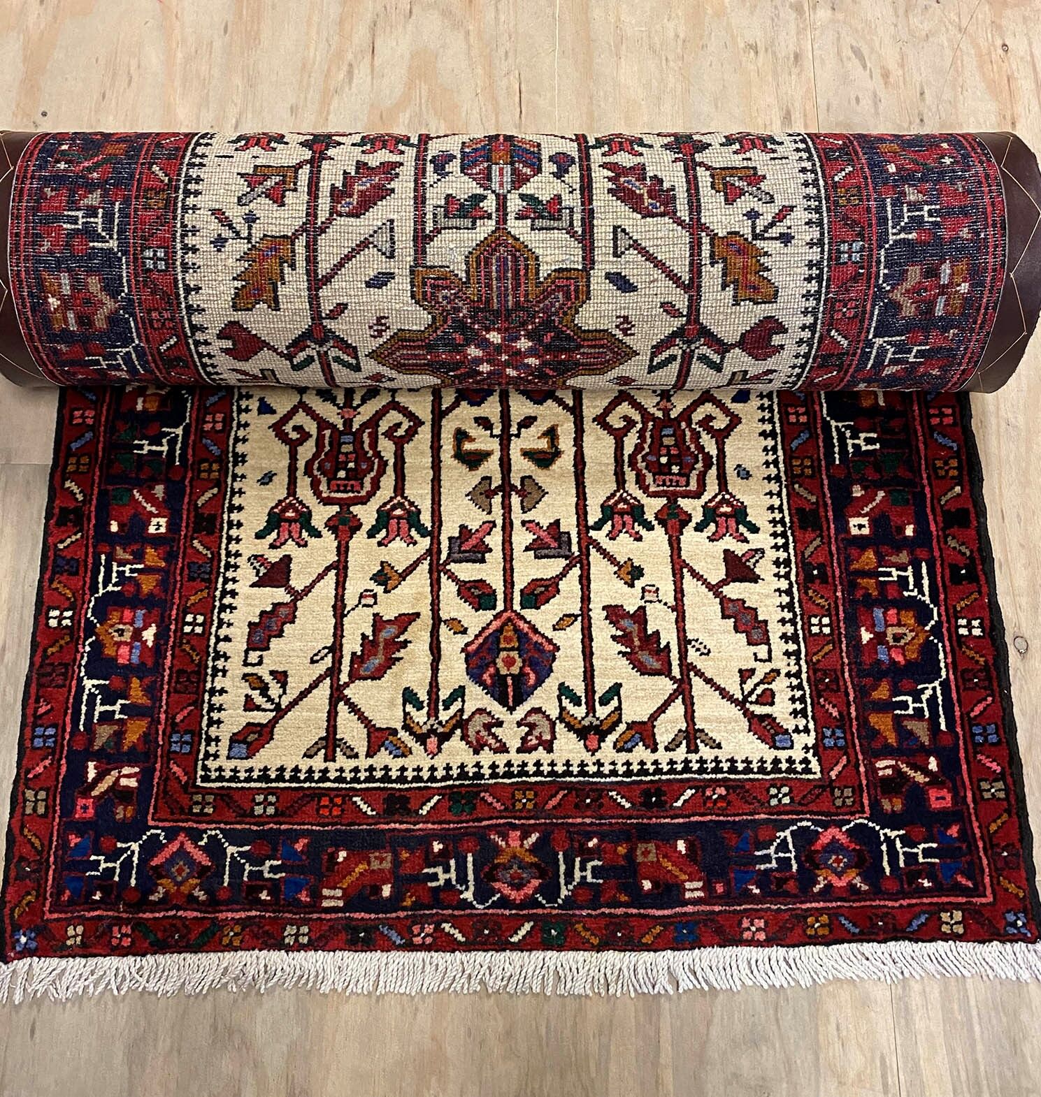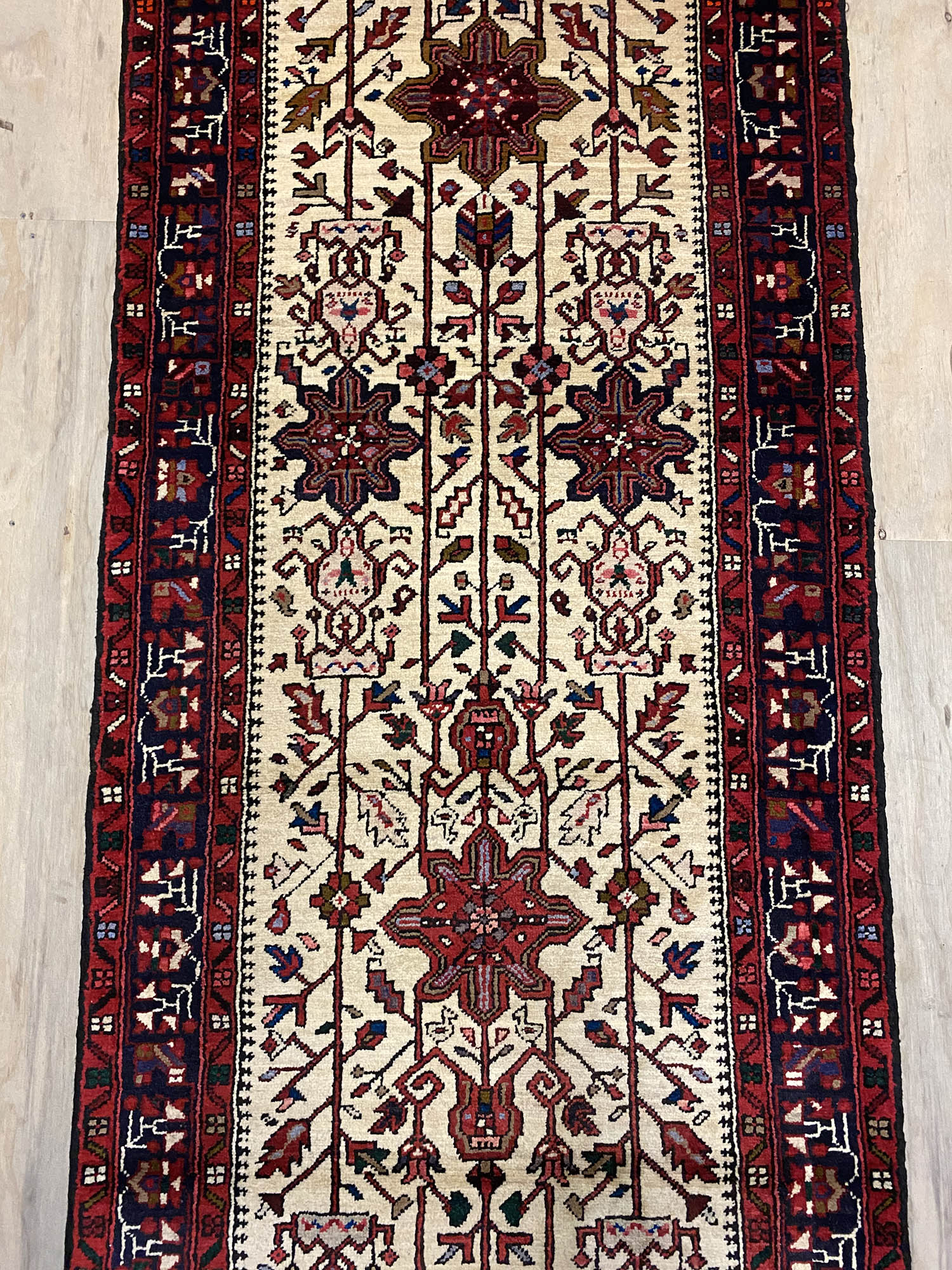 – Rare Oversize Beauty: Transform your space with this rare oversize and heavy-quality Persian Qarajeh Hall Runner, a unique find with a length of over 4m. The runner boasts a pure hand-spun wool pile on a cotton base, featuring beige and red tones dyed using traditional methods.