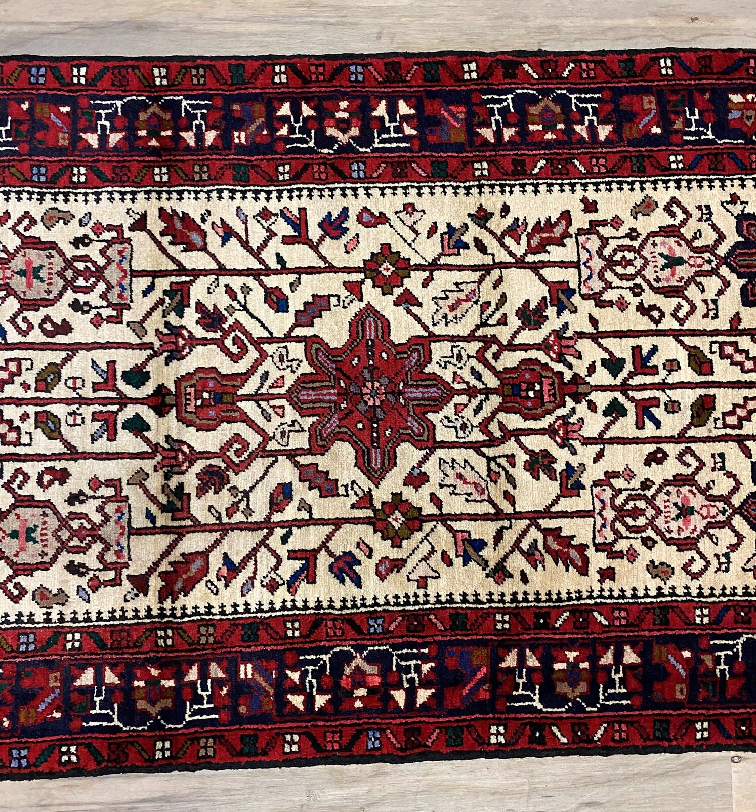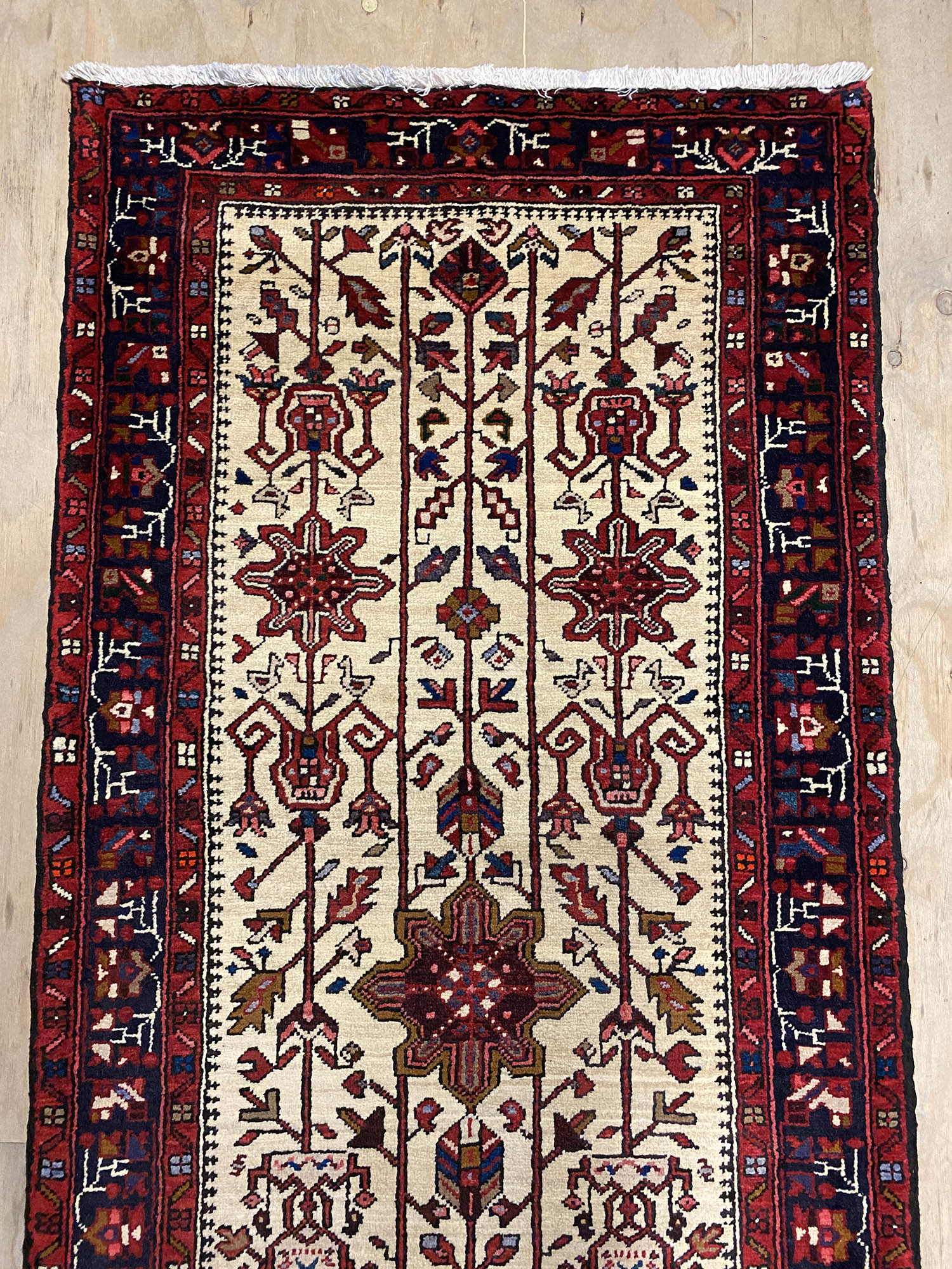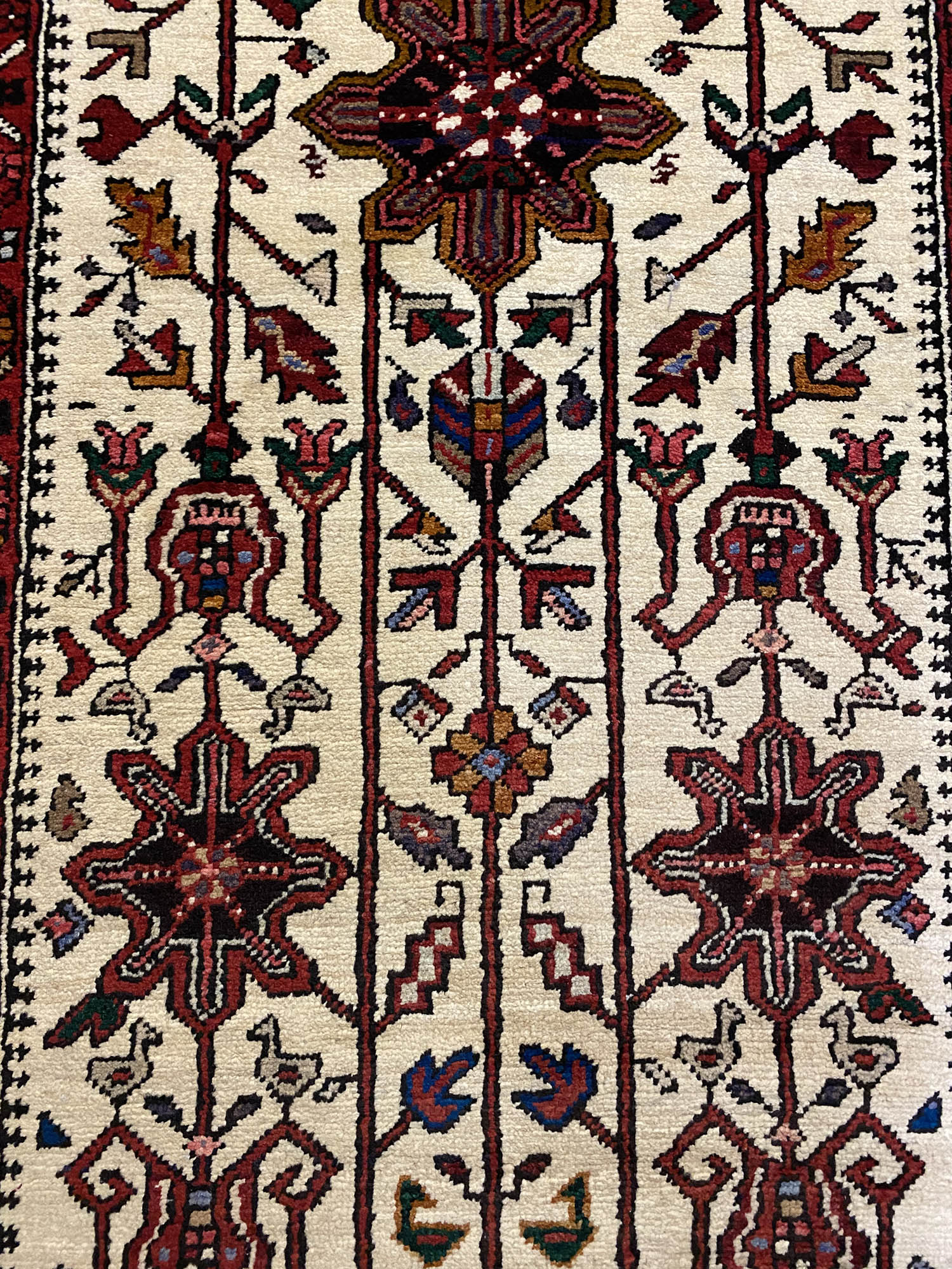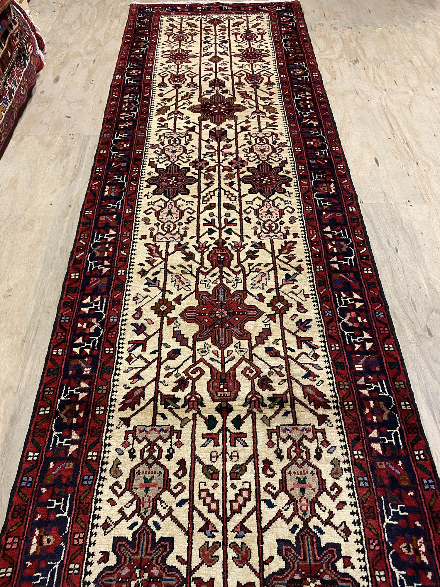 – Rare Oversize Beauty: Transform your space with this rare oversize and heavy-quality Persian Qarajeh Hall Runner, a unique find with a length of over 4m. The runner boasts a pure hand-spun wool pile on a cotton base, featuring beige and red tones dyed using traditional methods.