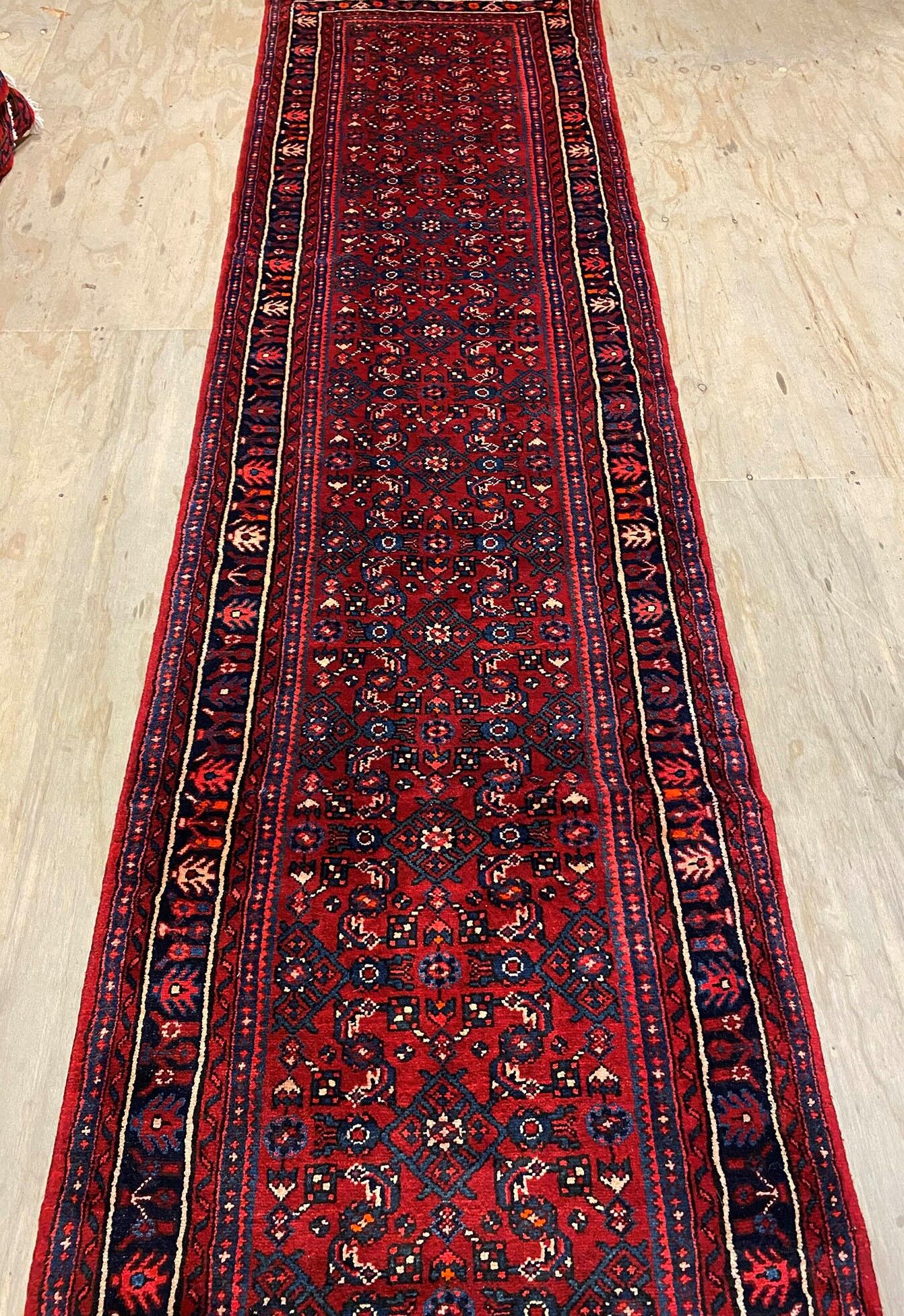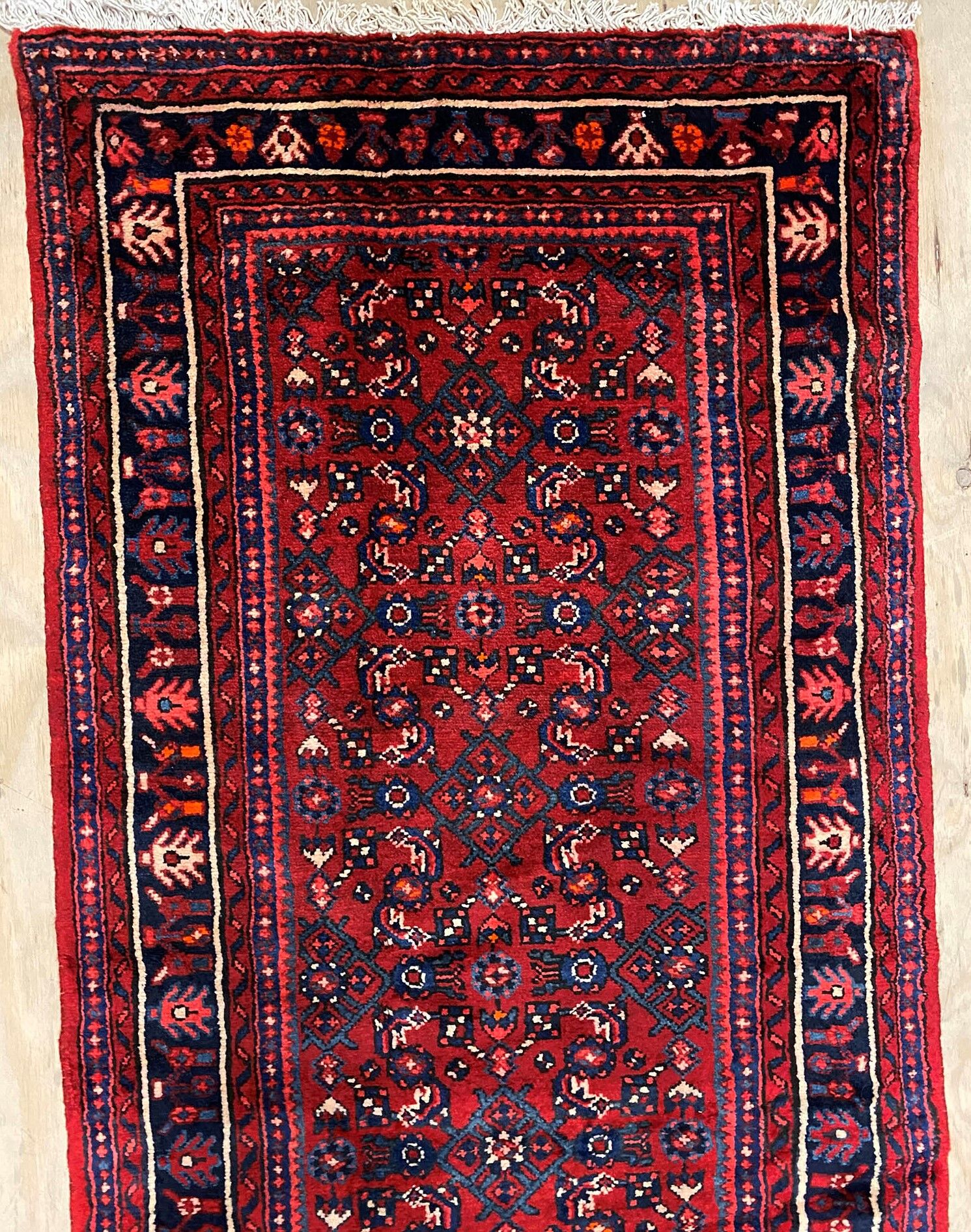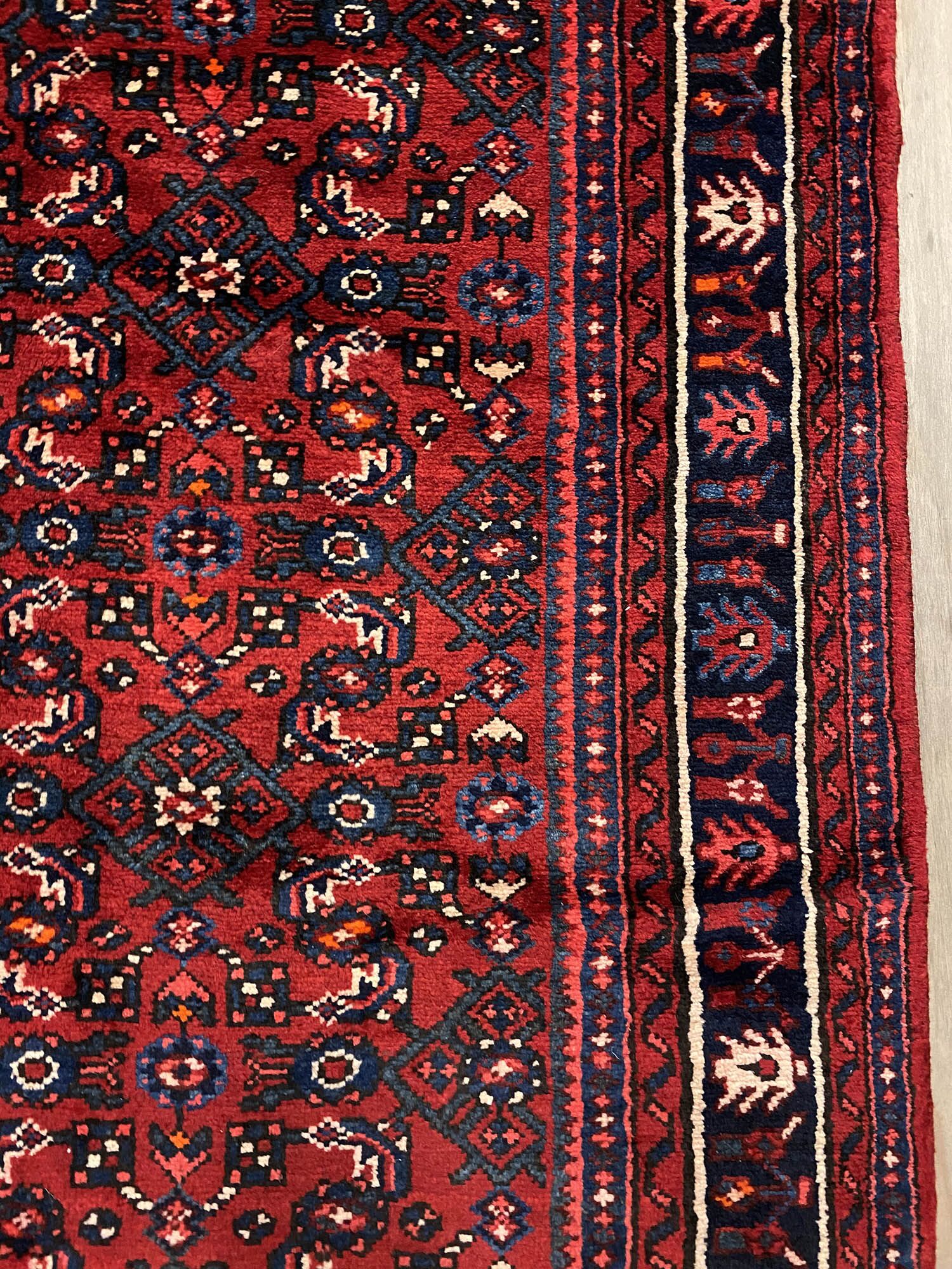– Hosseinabad Design Handmade Persian Hamedan Runner: A durable and hard-wearing runner featuring the unique Hosseinabad design. Crafted with care, it boasts a pure hand-spun wool pile on a cotton base.