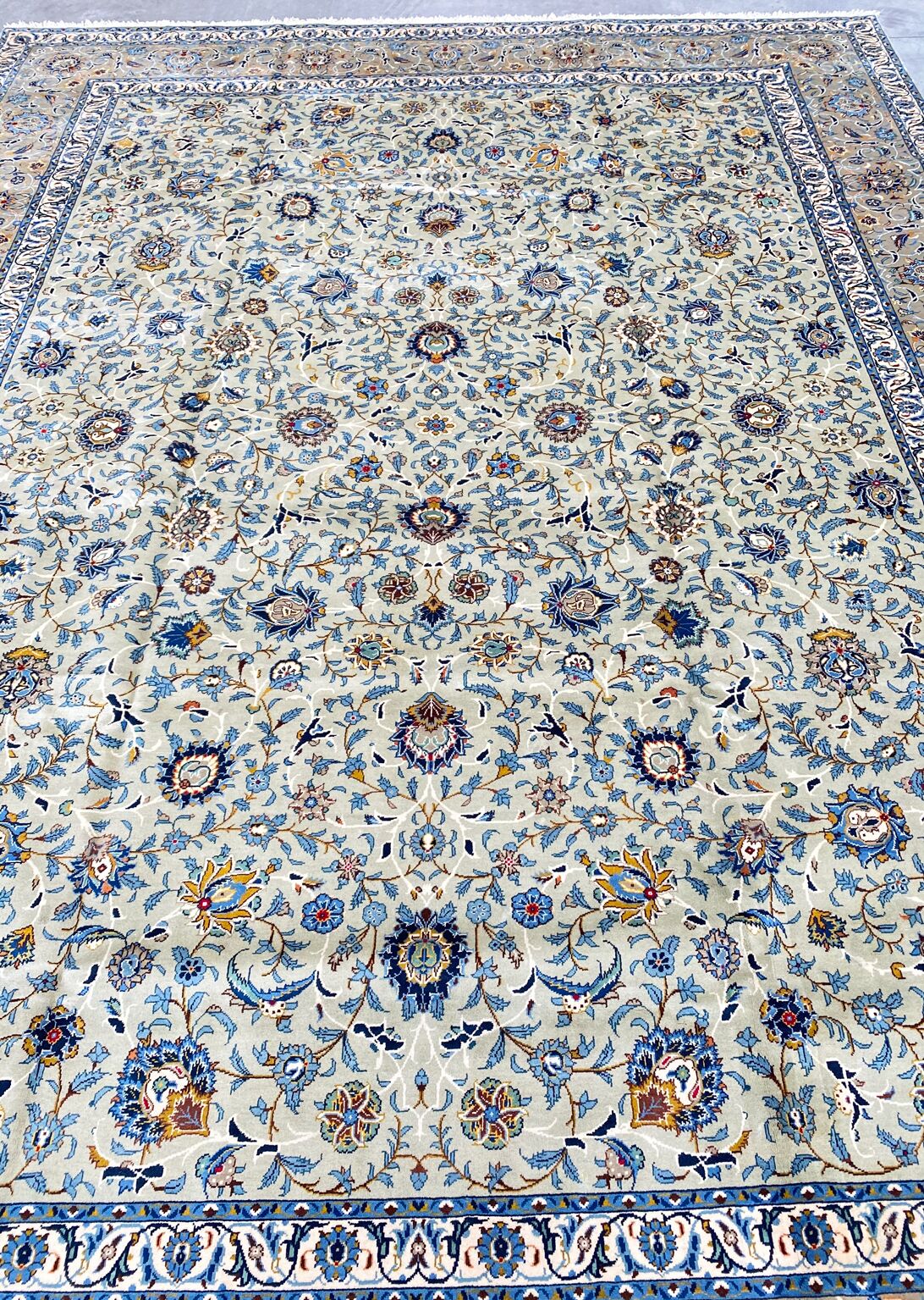 – Rare Find: A room-size Persian Kashan rug is a rare treasure, showcasing quality and originality. Crafted with a pure lamb’s pile on a cotton base.