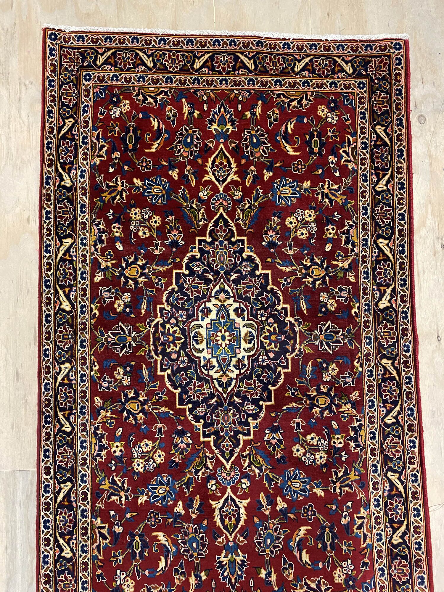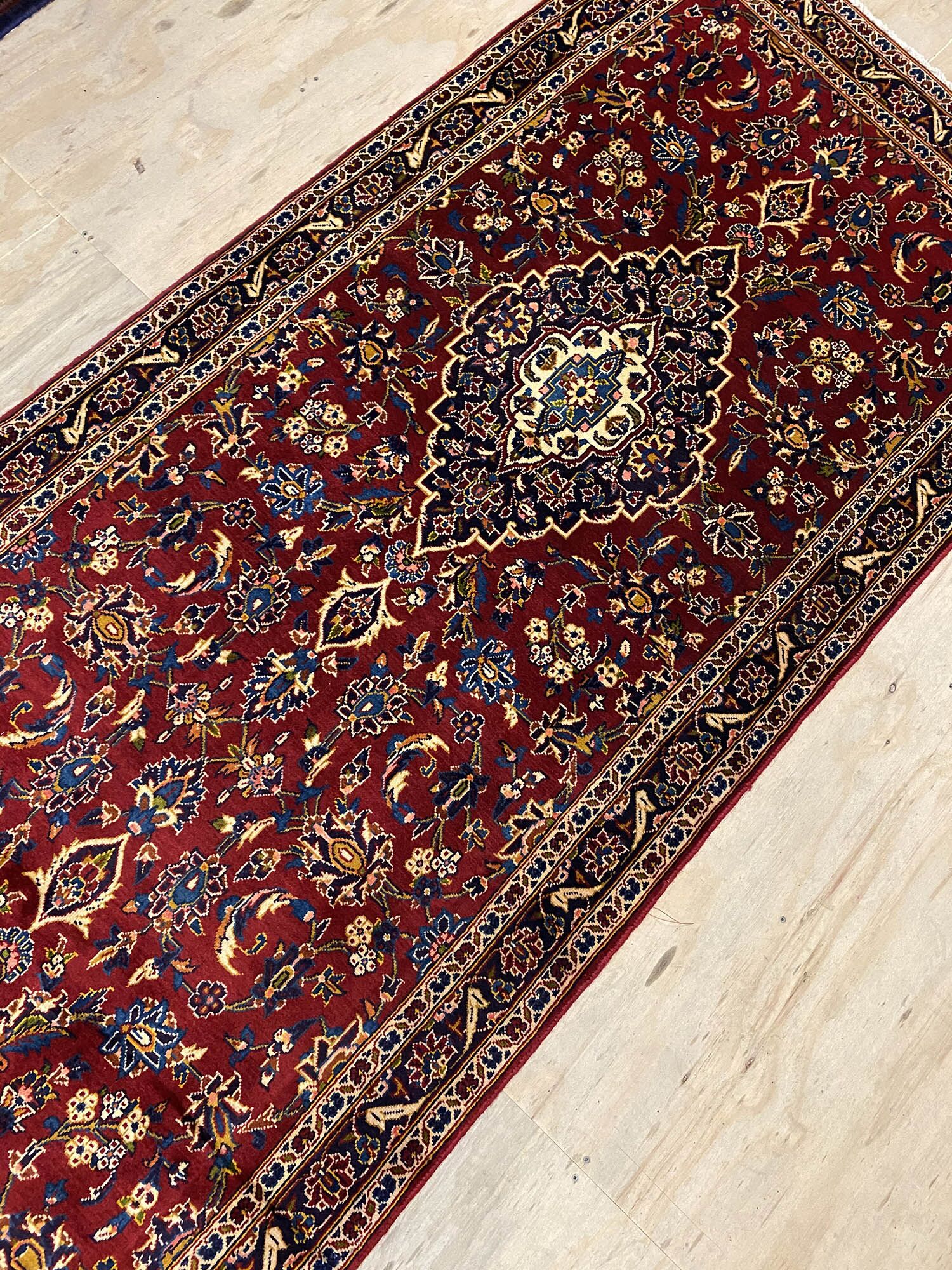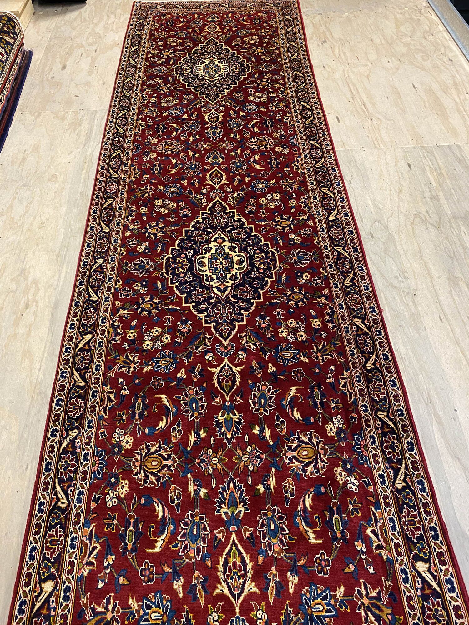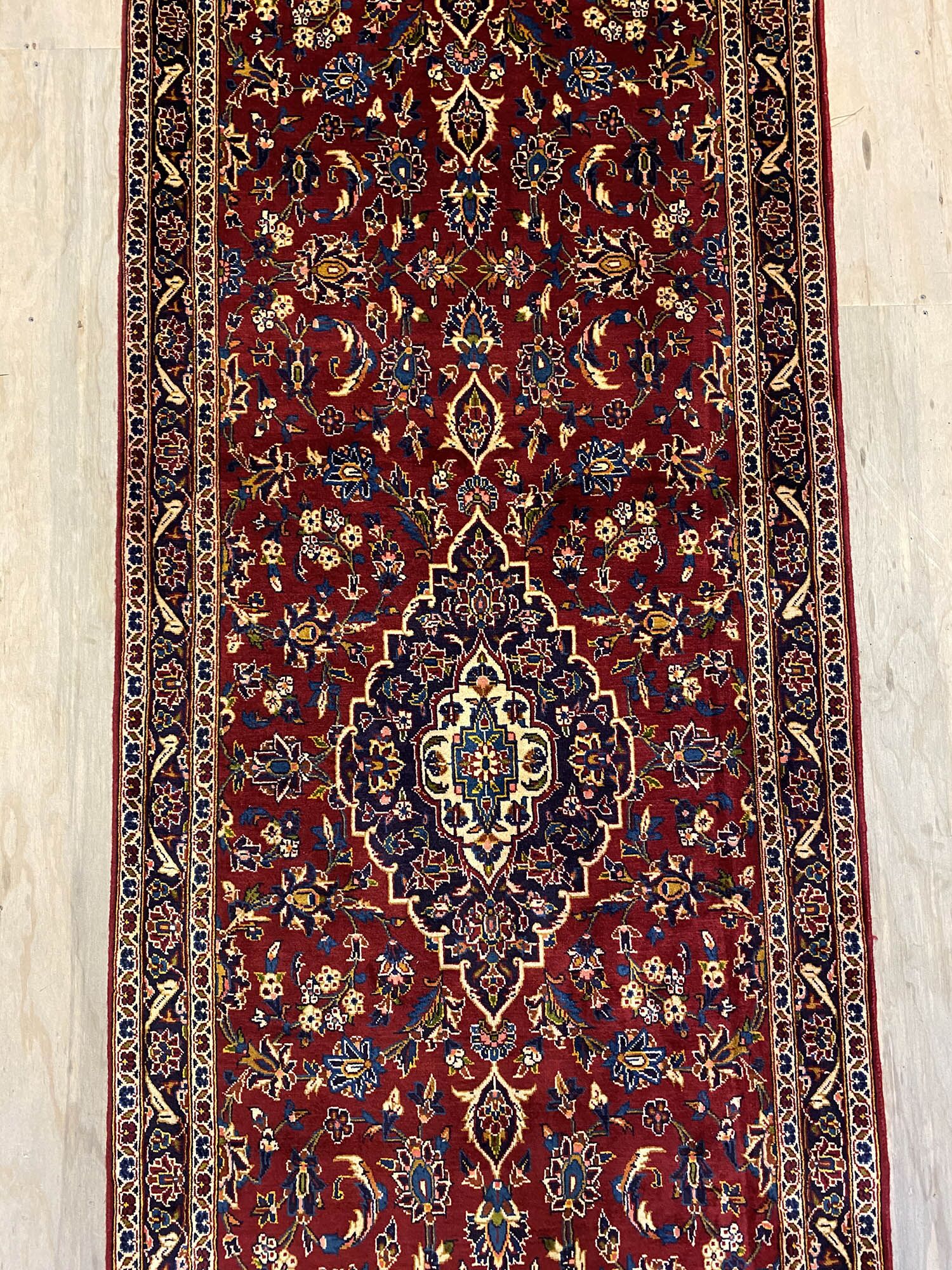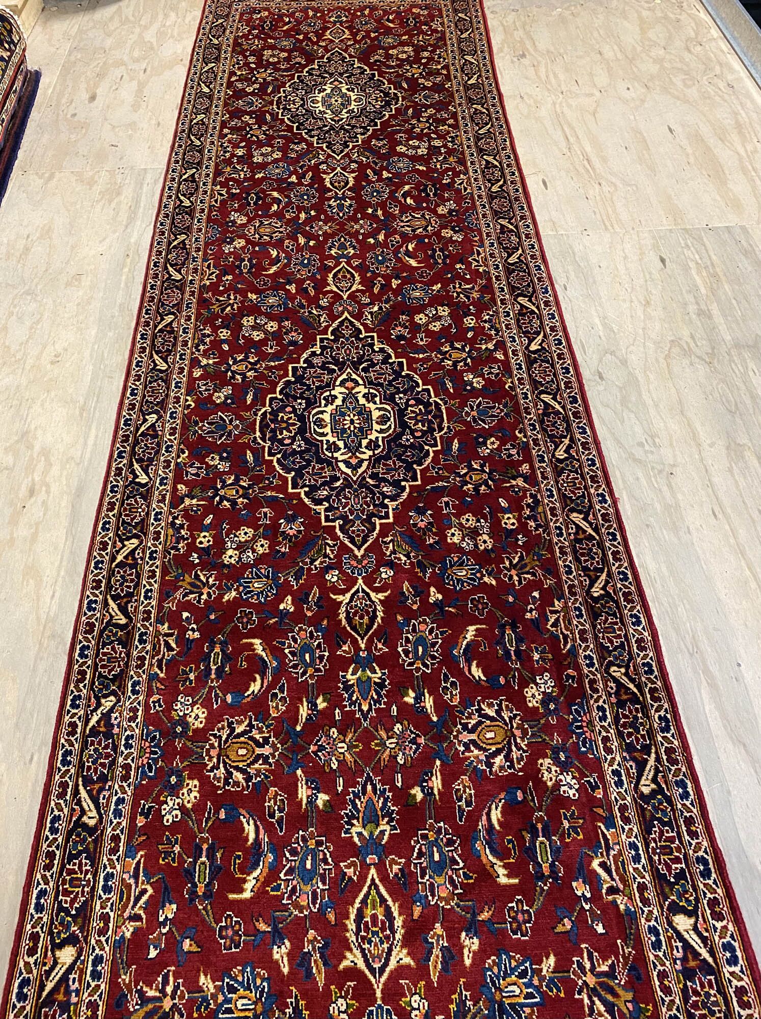 – Rare Over 4m Length: A 4.5m long authentic hand-knotted Persian Kashan Runner, a rare find showcasing original handmade quality.