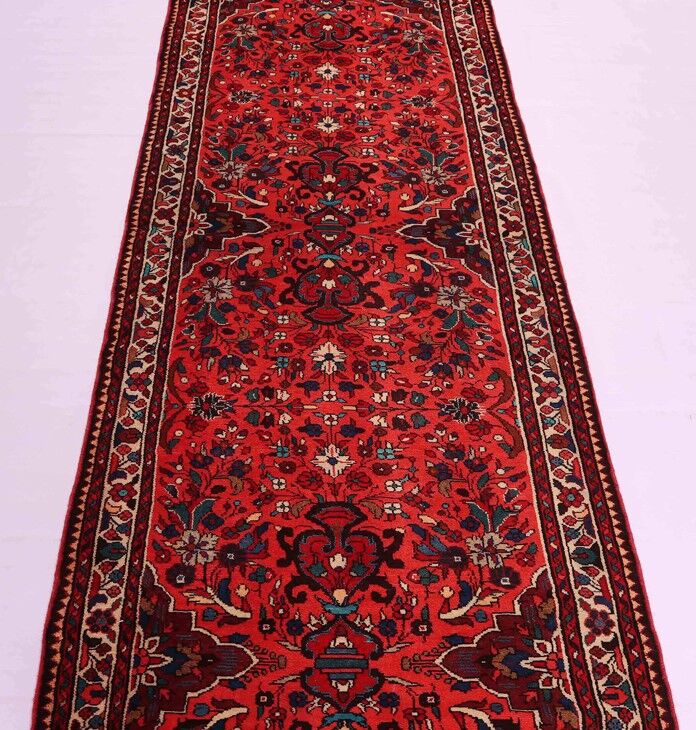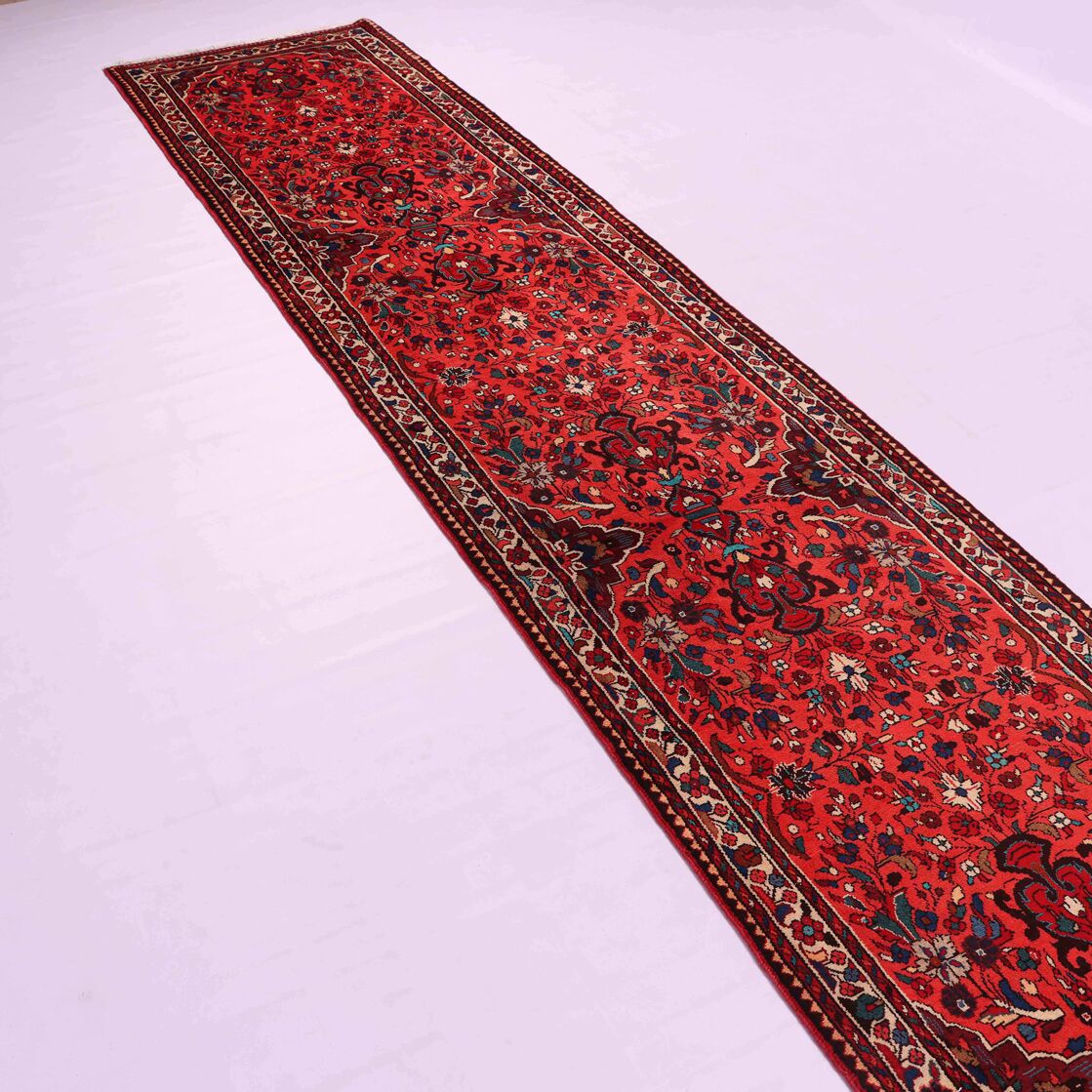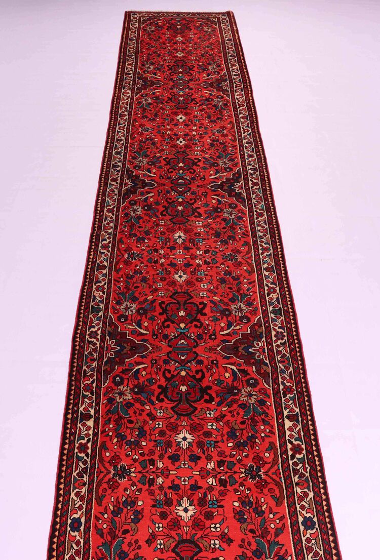 – Authentic Elegance: Immerse yourself in the authentic elegance of this 4.7m authentic Persian Sarough Runner. Handmade with a pure lamb’s pile on a cotton base and red tones dyed using traditional methods.
