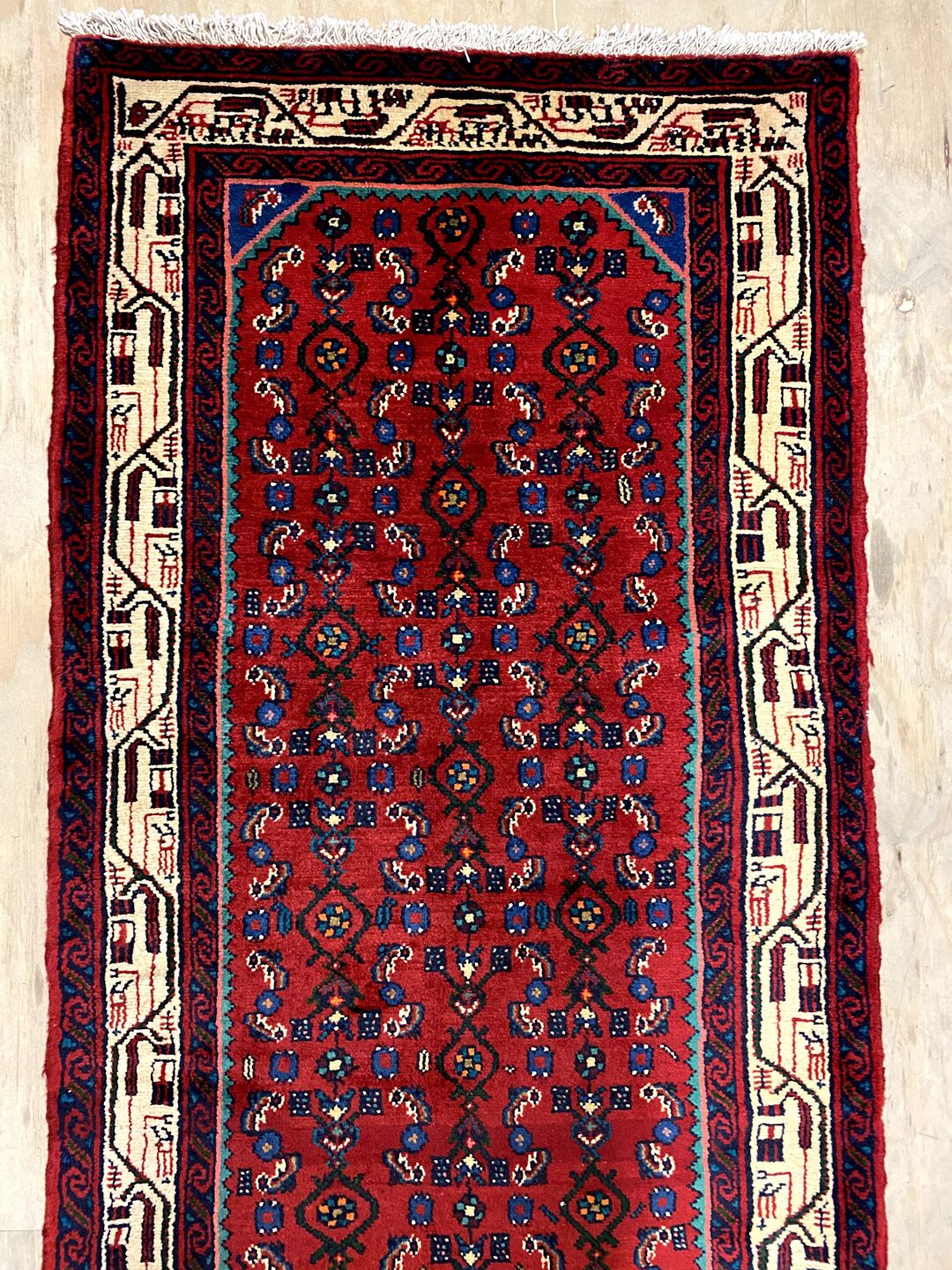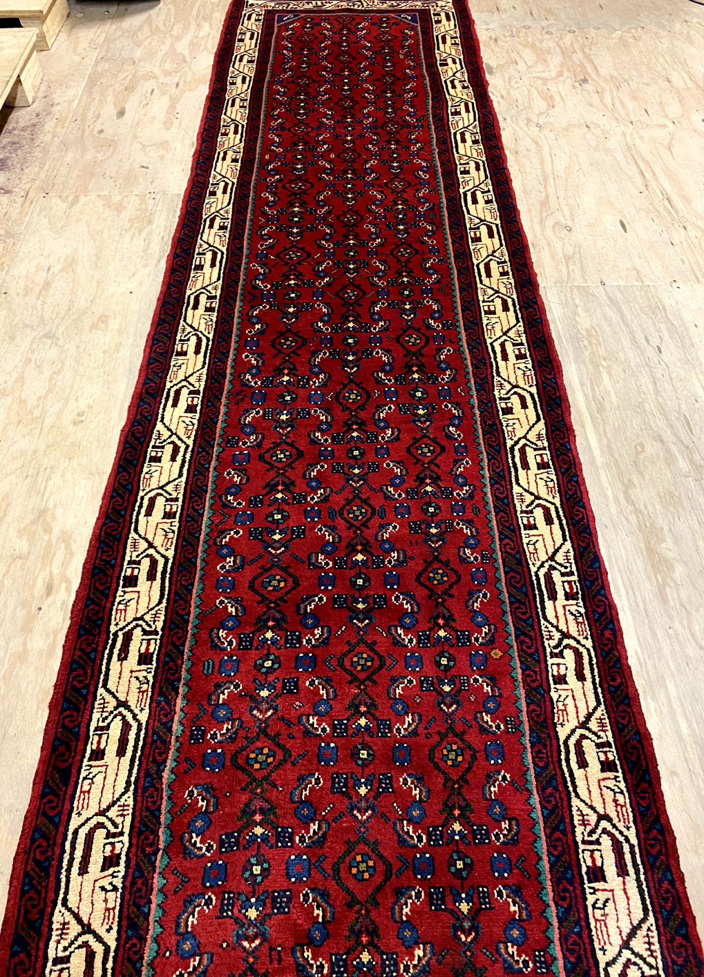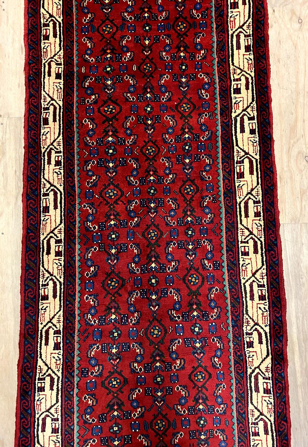 Rare Oversize Hand Knotted Persian Enjelas Runner. Above All It Is a Hard Wearing & Durable Piece. It Also Has Pure Hand Spun Wool Pile On Cotton Base. Deep Red Background Dyed Using Traditional Methods.